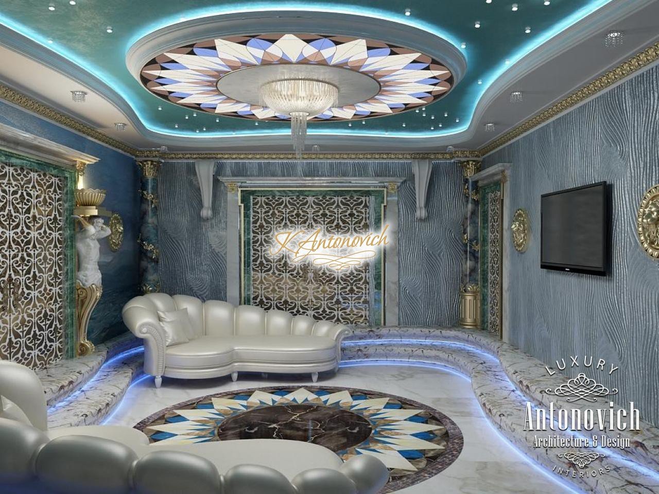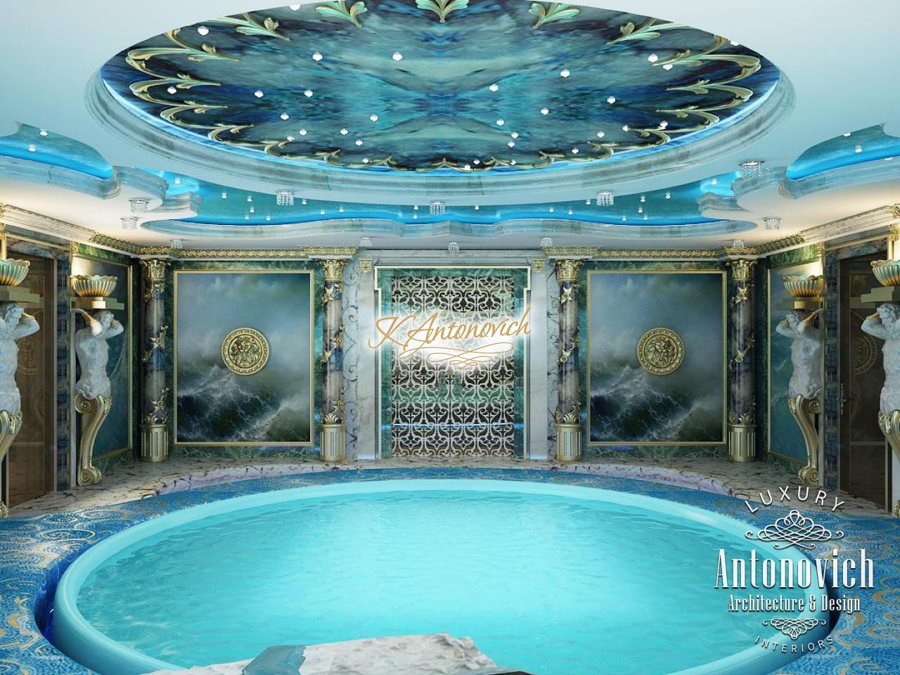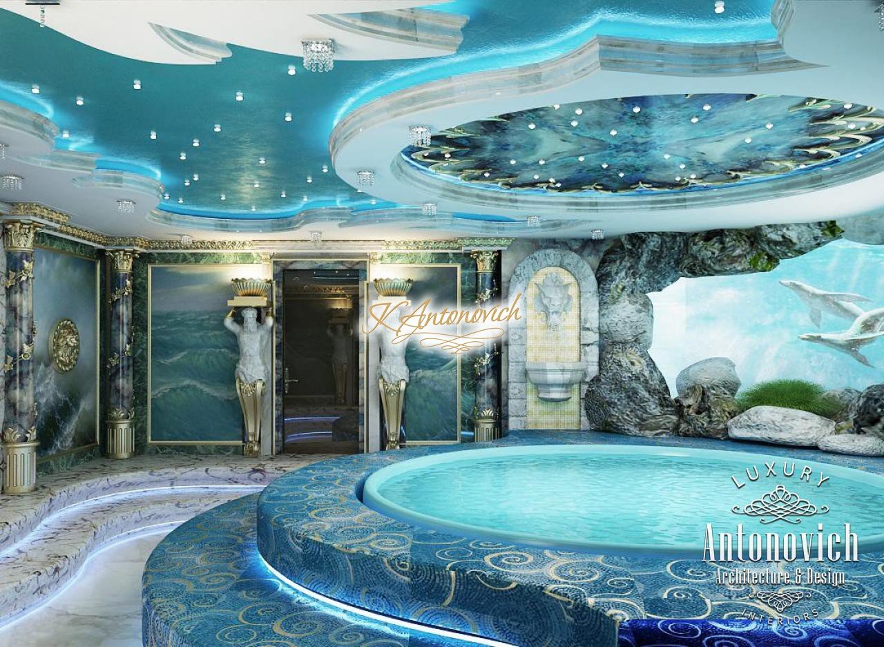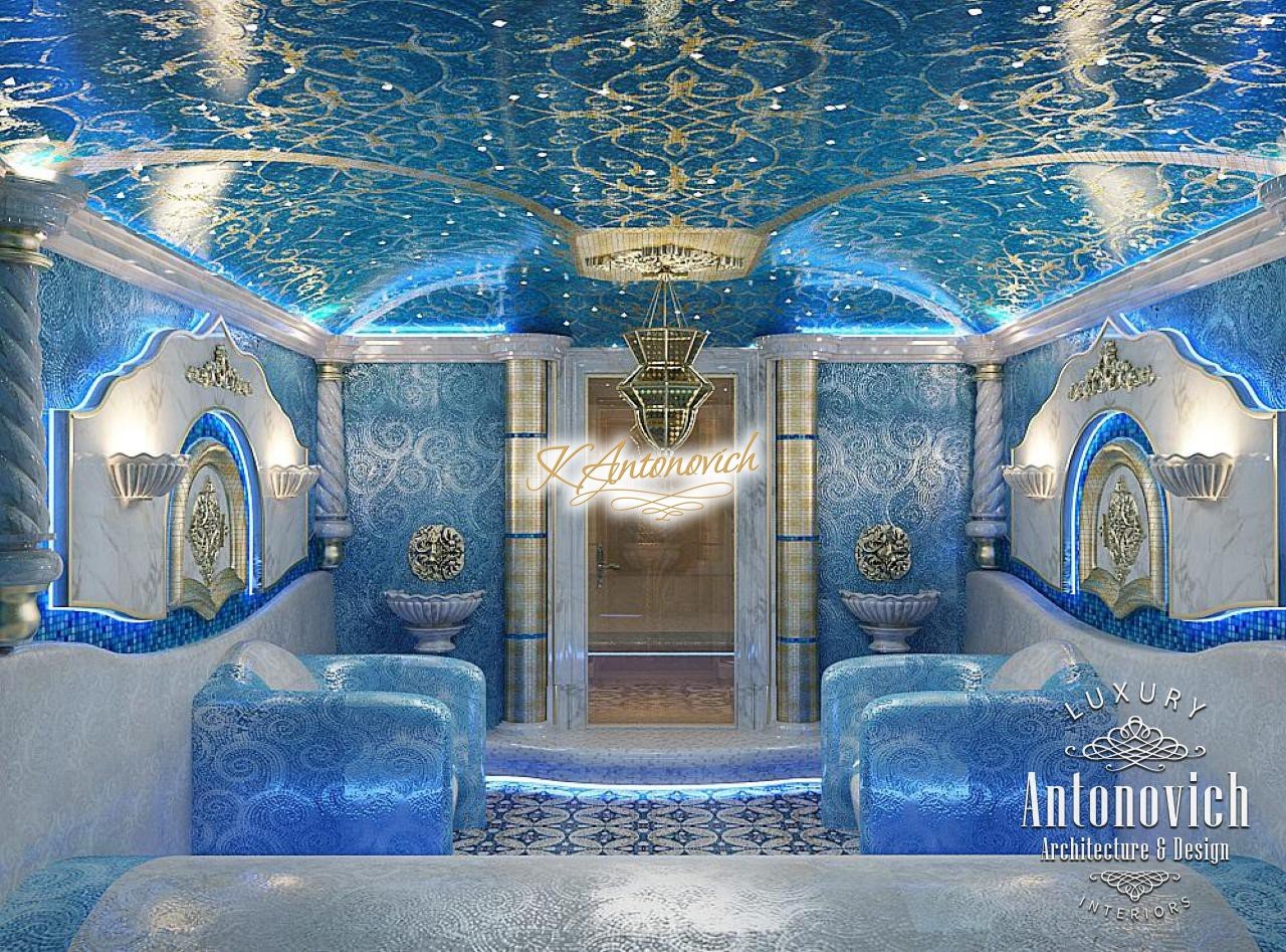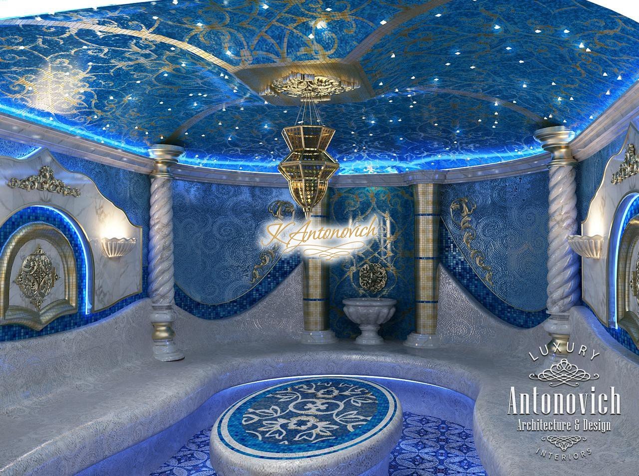 Villa Design in Dubai by elite interior studio Luxury Antonovich Design reflects the harmonious union of old traditions and modern technology. Luxury villa on the beach has become an ideal habitat for a large and happy family. Hamam design became one of the bright accents in the author's project. The spacious room that have been allocated for home spa area, have opened the designers a real scope for creativity. The hamam interior is divided into several zones. The pool area is decorated with amazing art paintings, sculptures and mosaics. In the recreation area interior designers Dubai offered an exquisite combination of floor and ceiling decor. Stylized of large flowers ornaments on the ceiling and the floor make the interior very expressive and festive.