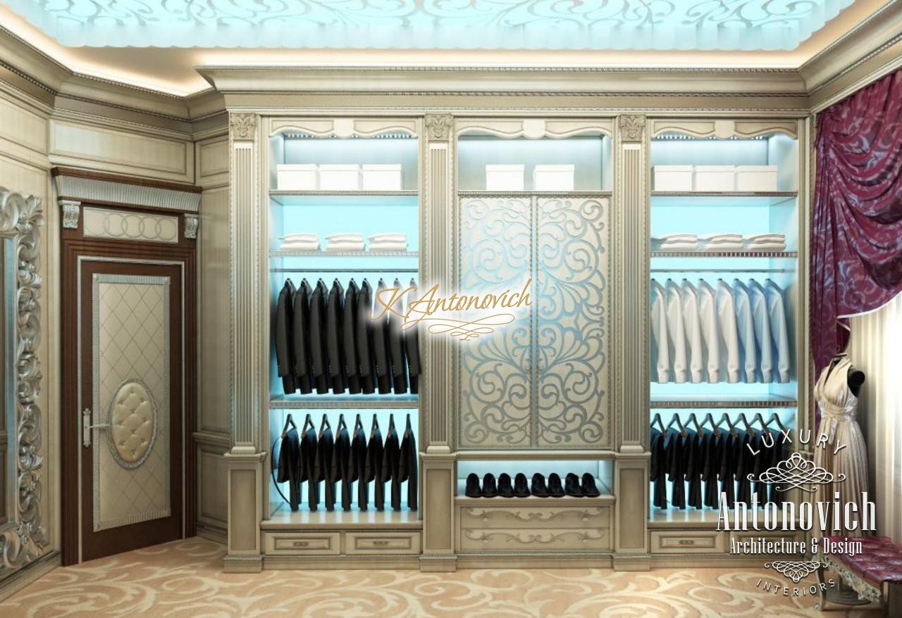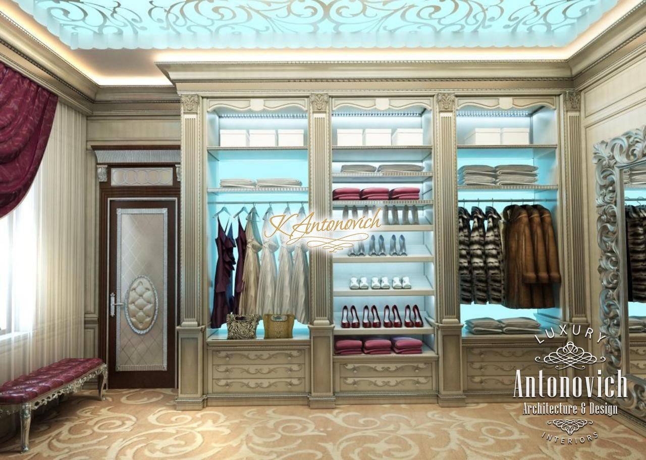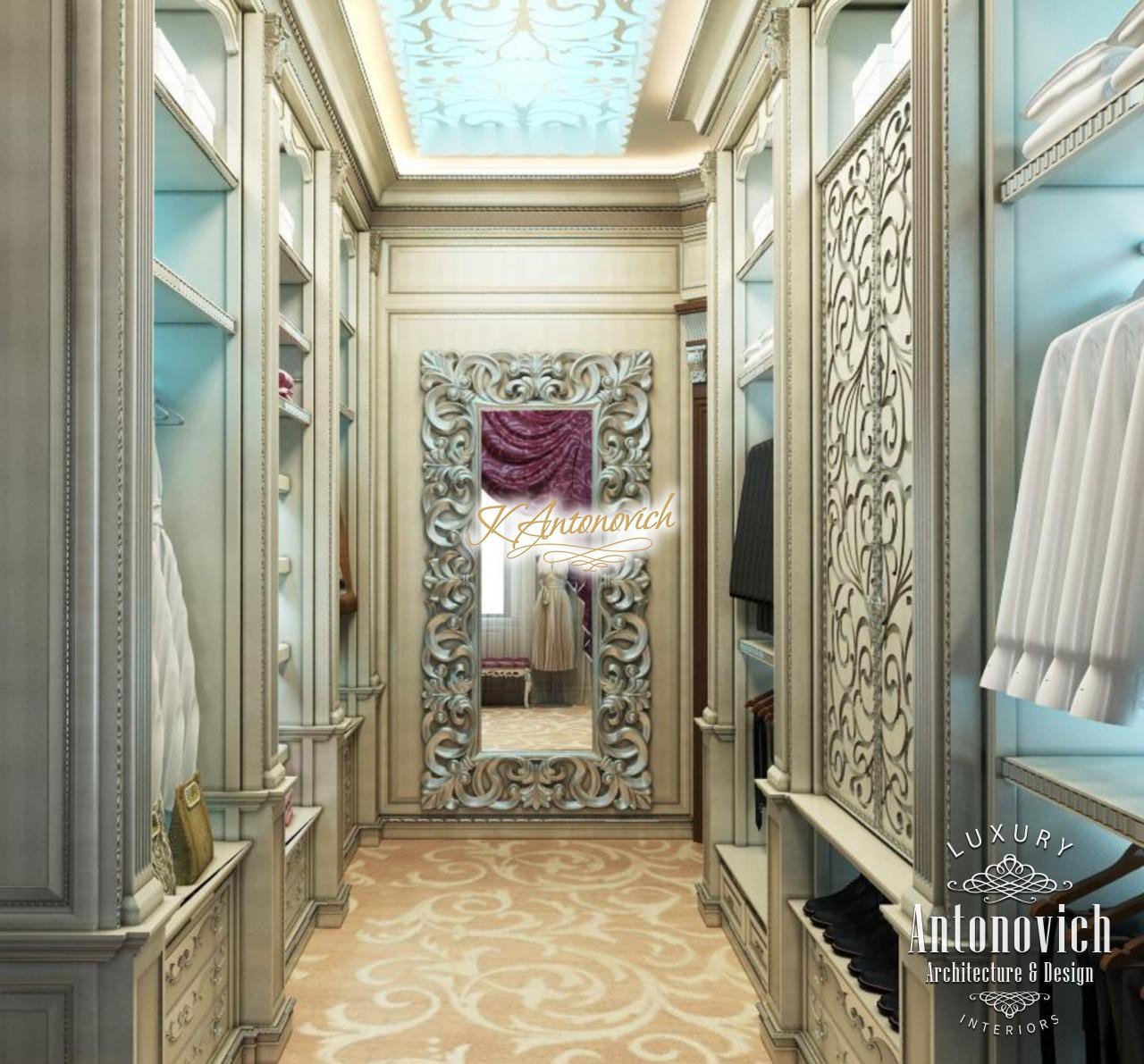 The interior design reflects the charm of dressing room and elegance of its owner. Cosy room with high ceilings can accommodate all her favorite things. A choice of clothes becomes very comfortable and cozy. Interior Design Abu Dhabi always reflects the dream of an ideal habitat. And such an important moment as the dressing room in the house has become an integral part of the author's project of Luxury Antonovich Design Studio. Here luxury and splendor are closely intertwined with the functionality and convenience. Romantic mood in the interior decor is set with the ceiling. Niche with a soft blue backlight is decorated with fanciful patterns. A small window is decorated with charming one-sided curtain of precious silk. Lots of cabinets, shelves, drawers with modern storage systems allow to conveniently place the entire outfit of themistress of the house.