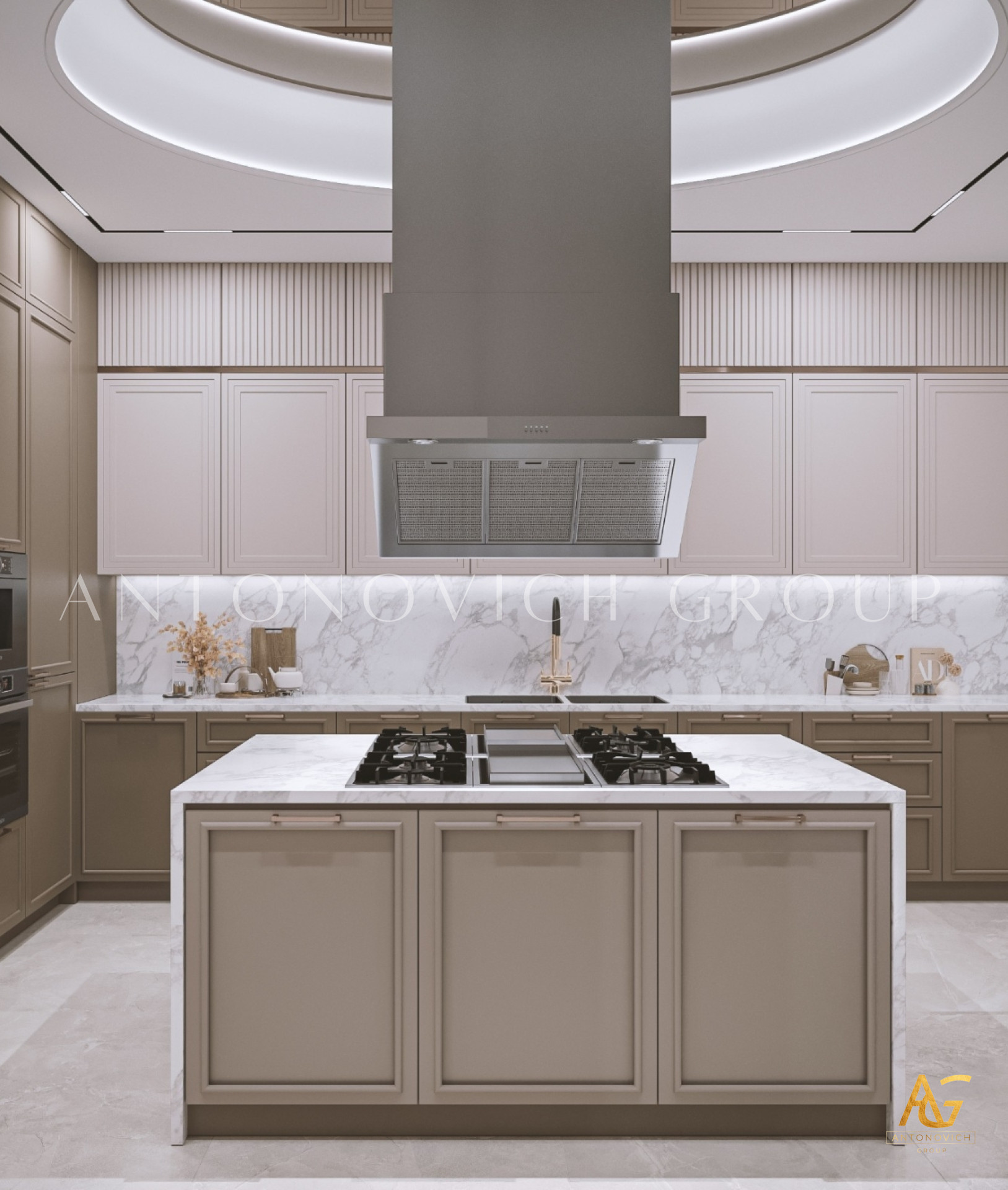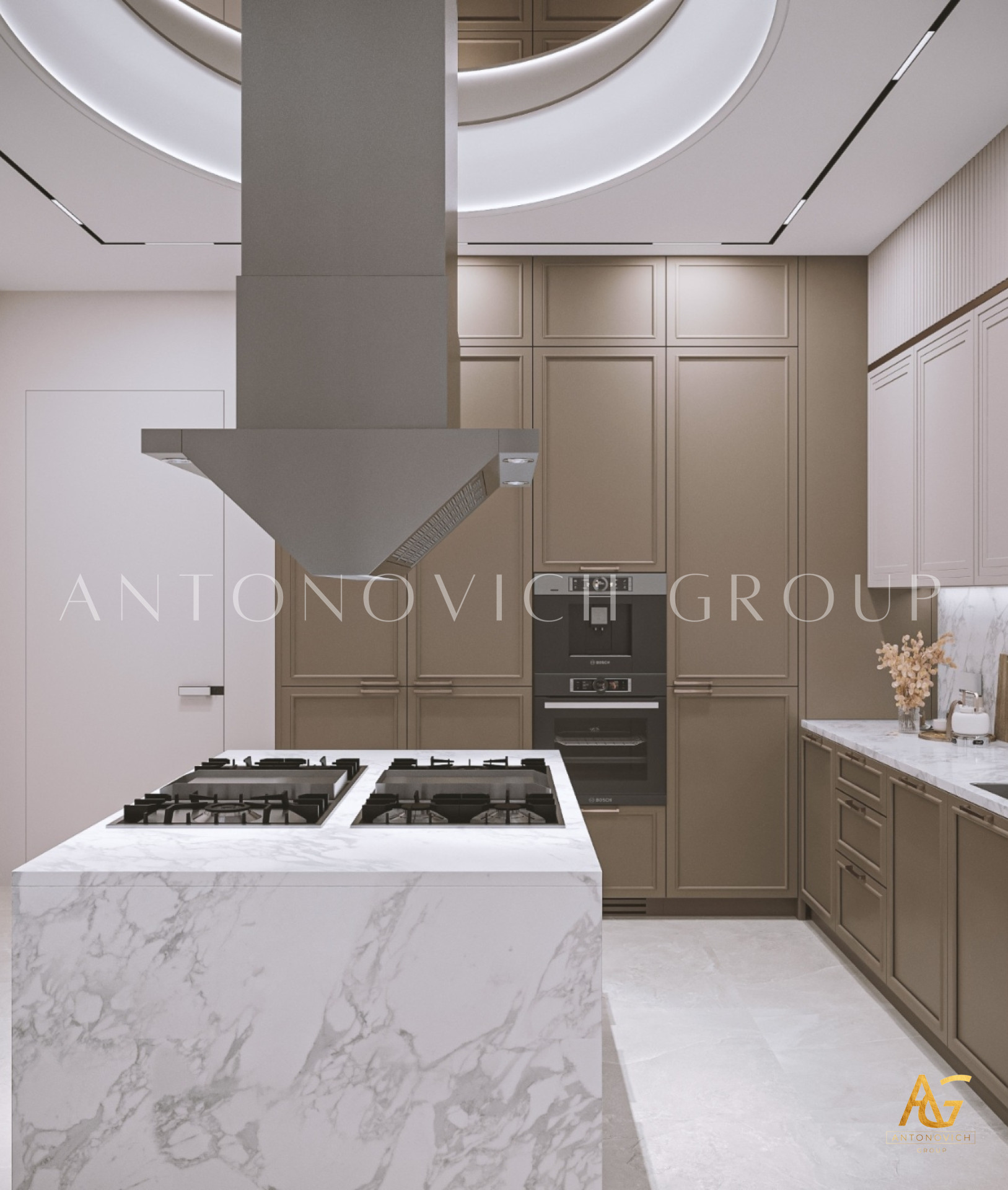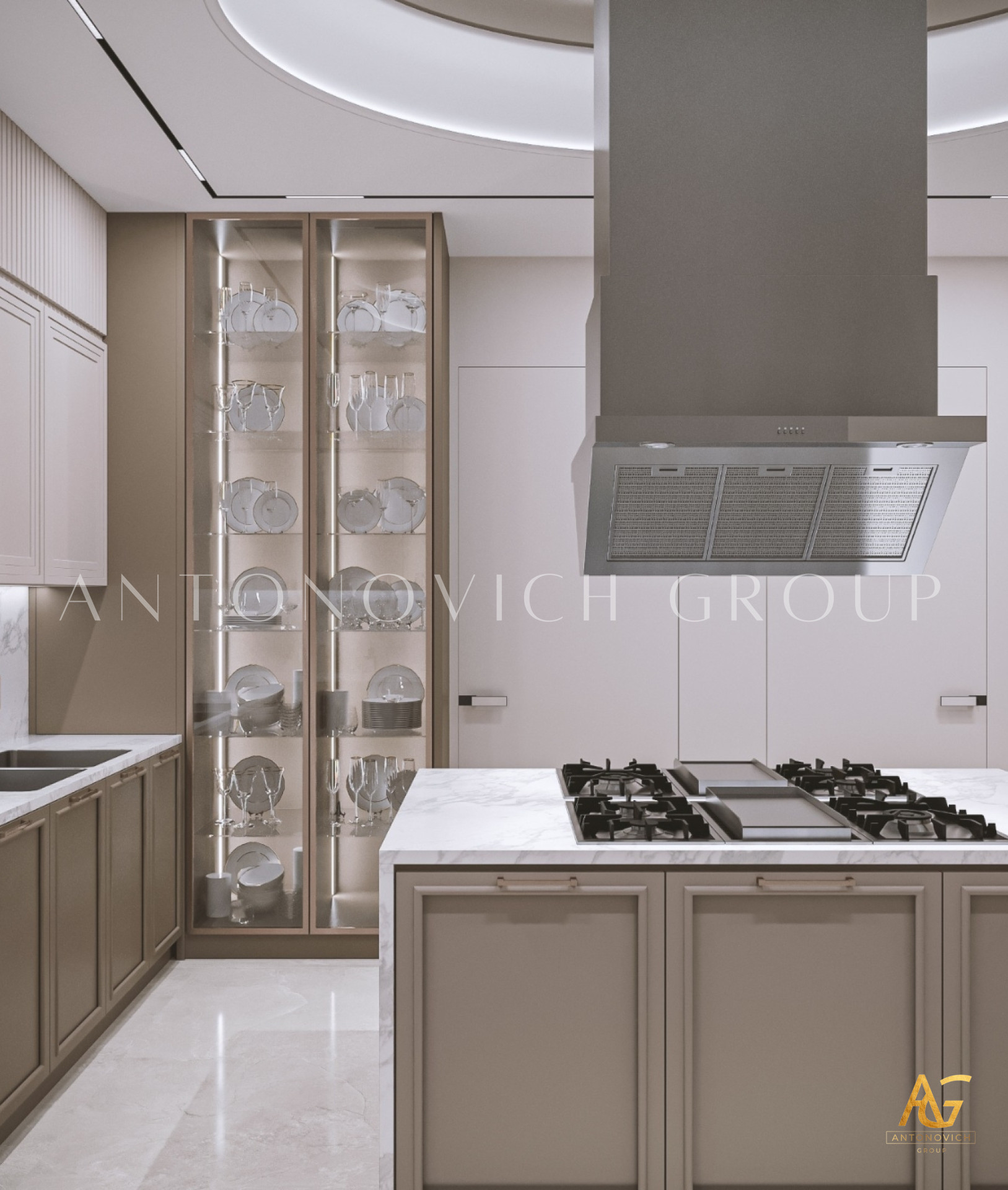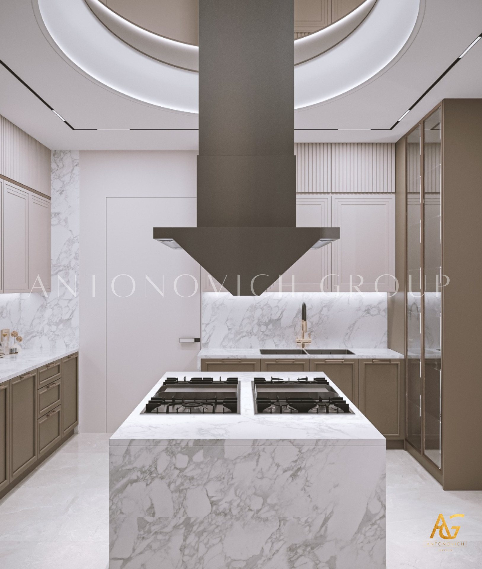 Luxury interior design from studio Luxury Antonovich Design meets the highest international standards. It's a subtle interweaving of tradition, innovation and ingenious designs, evident in every project of the design studio in Dubai. Today fashionable is absolute comfort and luxury with a bright character. And this villa project in Dubai corresponds to the fashion trends. Such projects themselves become the basis for future design. Kitchen Design has become a part of the space of the first floor in the luxury villa on the beach. Each square meter sets a romantic mood and a wonderful feeling of perpetual celebration of life. On the ground floor there are a living room with a seating area by the fireplace, a large dining room, and an exquisite kitchen. The interior has got purity of lines and shapes, perfect proportions and a perfect blend of colors. The kitchen area is separated from the other space with graceful marble columns and charming curtains. The kitchen interior itself is light and grace. Behind white facades with carved decor the most modern storage systems and the latest kitchen appliances are hidden. However, it's carefully veiled and it doesn't load the interior.