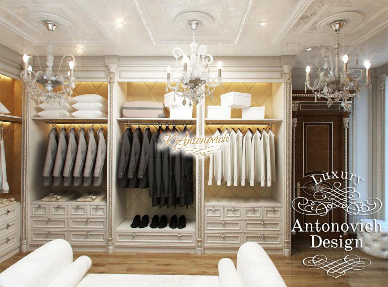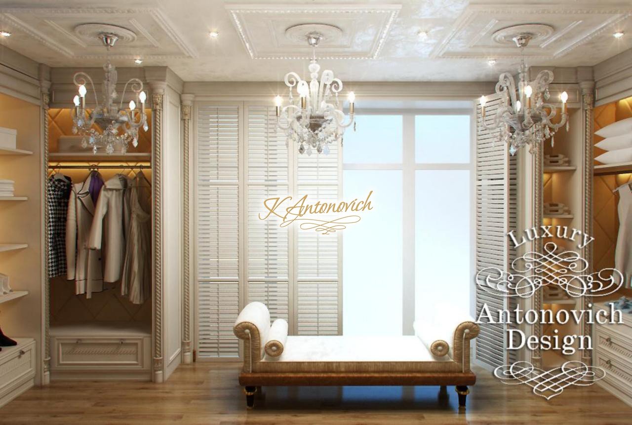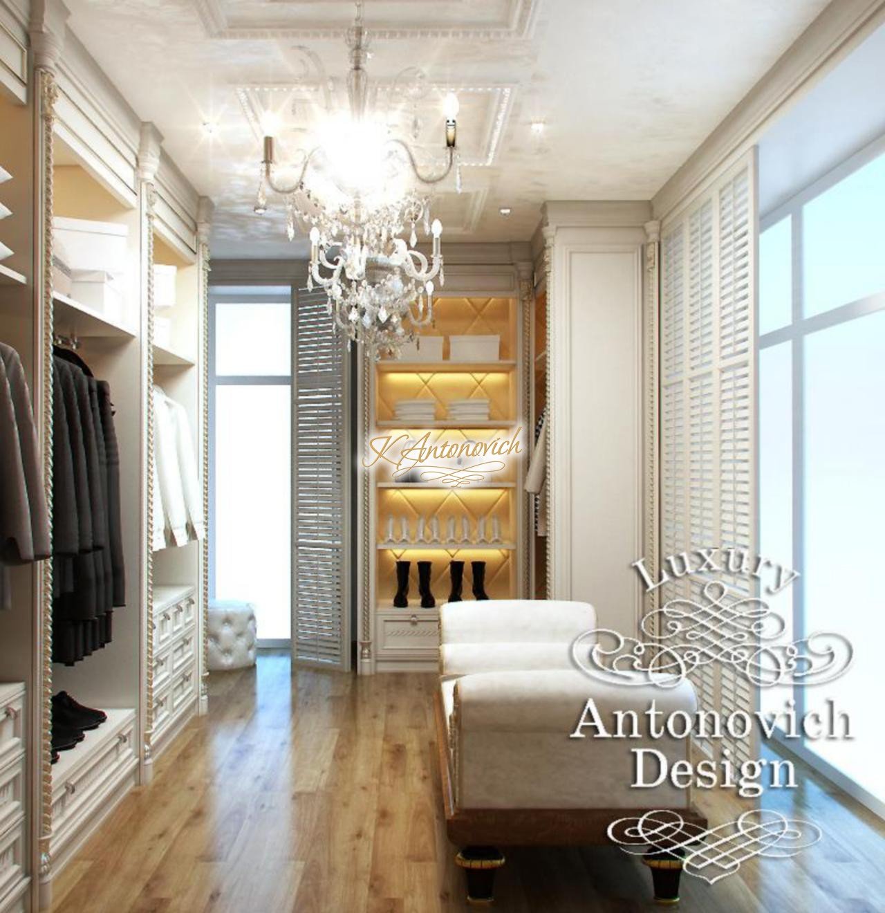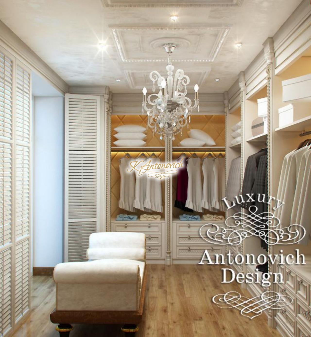 Dressing room design perfectly highlights the advantages of planning of the apartment. Comfortable dressing room with a large panoramic window was the realization of a dreamof the owner. High ceilings are decorated with milky plaster with a silk texture. The ceiling shimmers with pearls glitter, setting a romantic mood. The floor of wood of valuable species introduced into the dressing room interior the mood of comfort. The luxury interior design and unique design involve the use of noble materials. Here, interior designers Dubai used effective methods of decoration. The internal parts of wardrobes is decorated with soft textile panels with rhomb-like tightening. LED backlighting makes the interior elegant and expressive. Comfortable fine pouf adjusts to the unhurried mood, when you can enjoy a choice of shoes and clothes.
