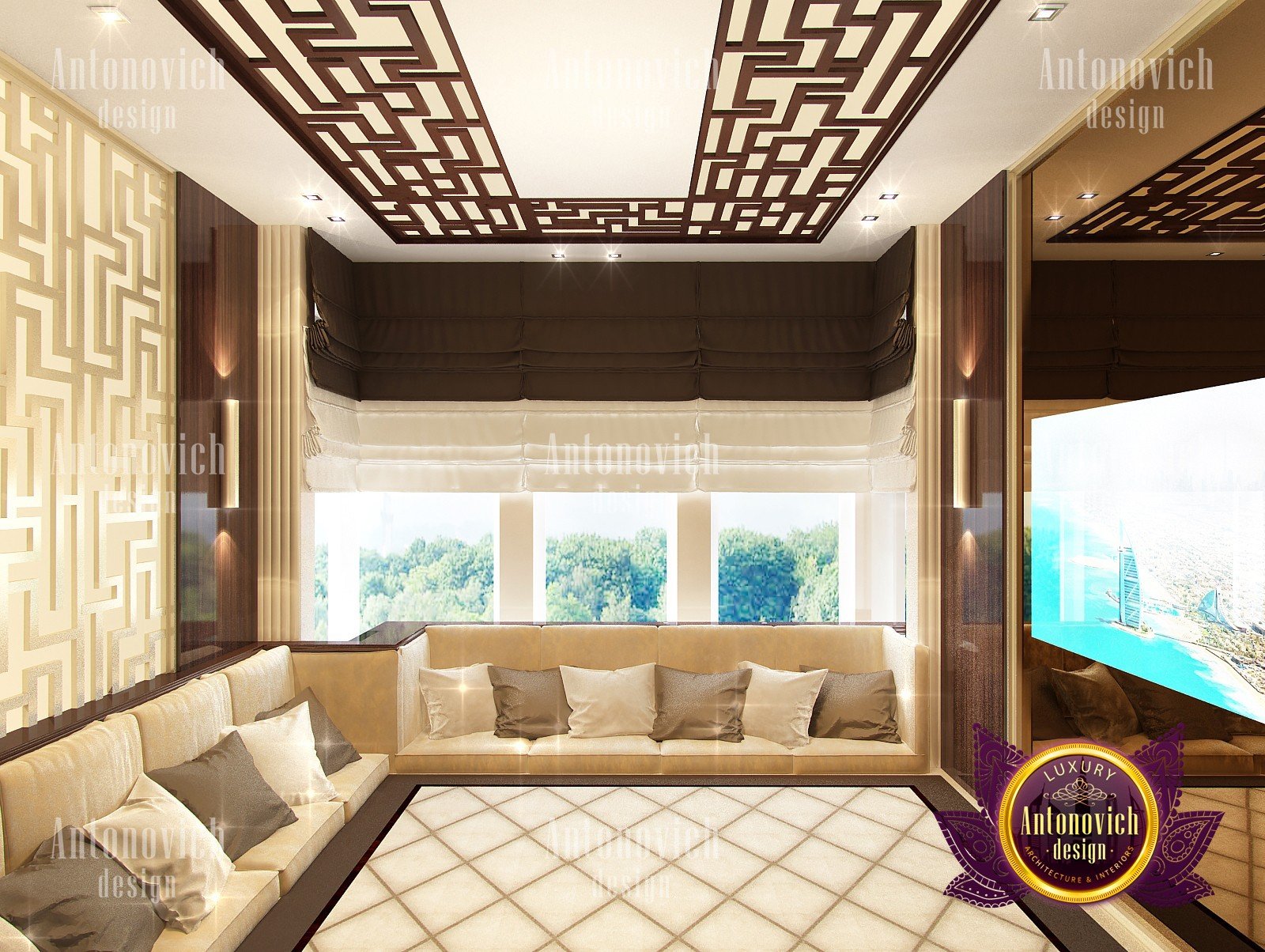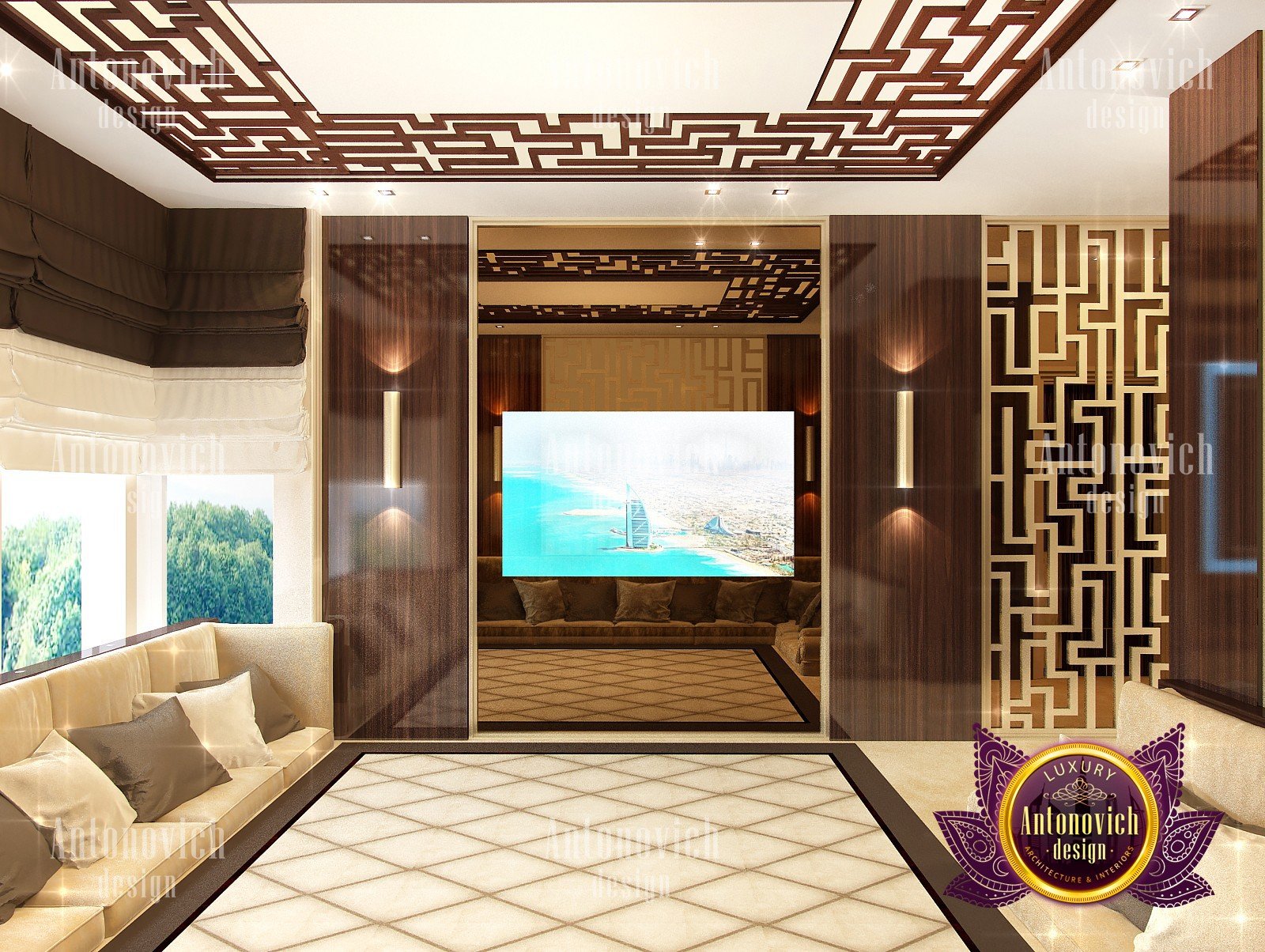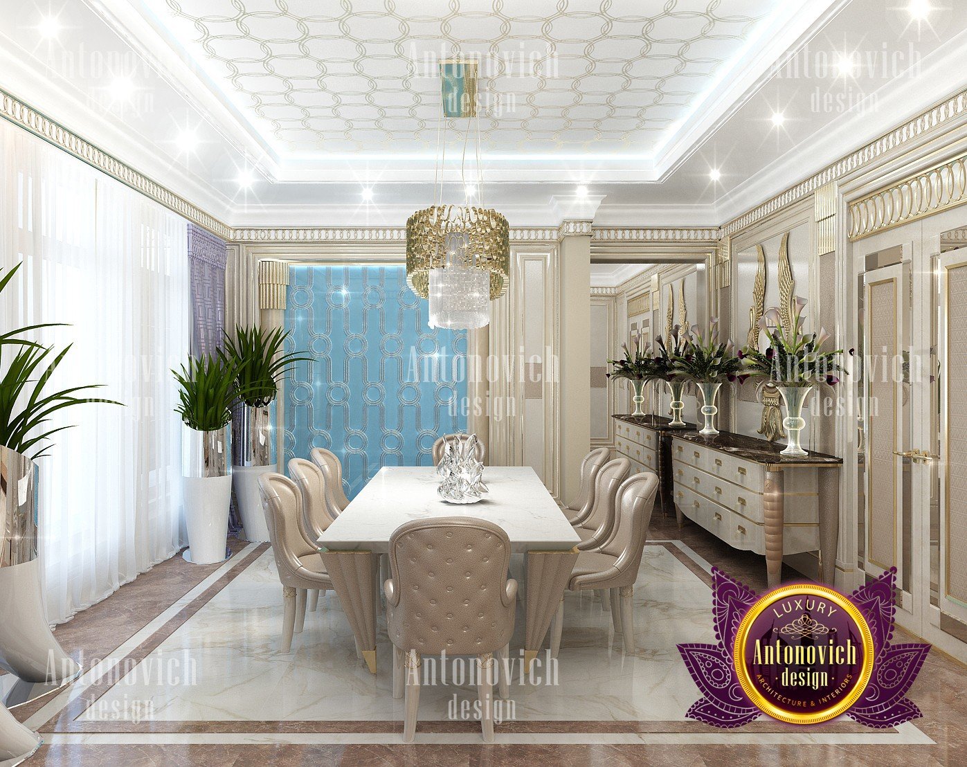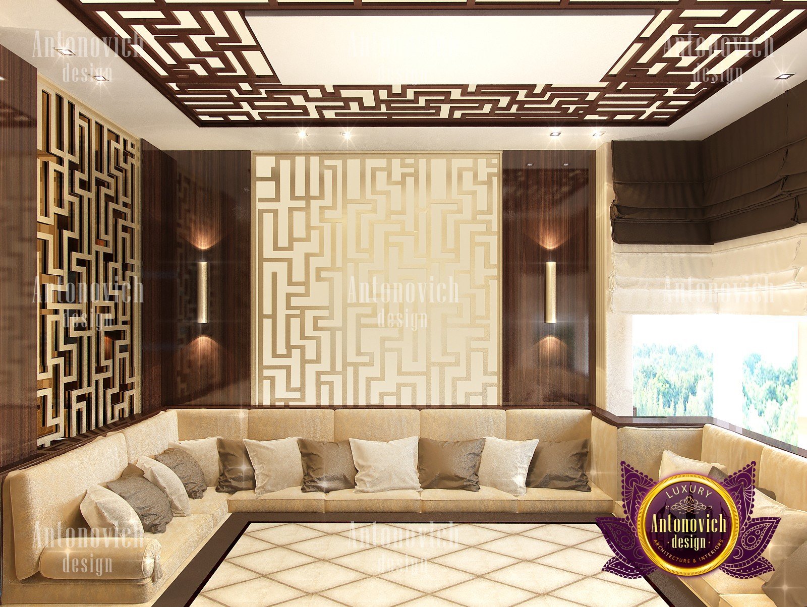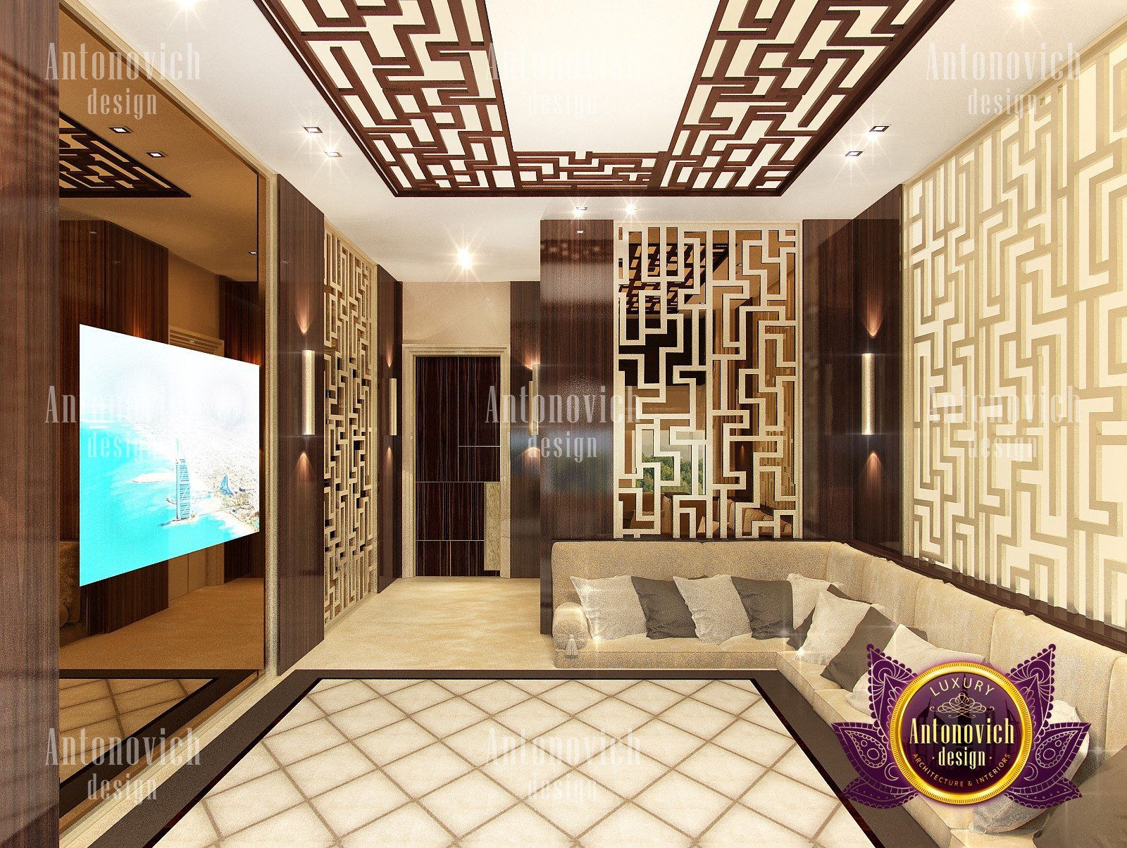 Interior design in a modern style was designed by the studio Luxury Antonovich Design for one of the villas in Dubai. Amazing laconic interior adjusts to the serenity and pleasant stay in a comfortable environment. The villa design Dubai is full of spectacular solutions of talented interior designers. Living room and dining room are a complete image. And most importantly, the basis of this unity became a spectacular ceiling design. Daring design techniques give the house interior in Dubai originality and bright personality. The basis of the ceiling is an array of dark wood, which continues on one wall in the living room. To compensate for the dark color of the wood and give it a refined element of decoration visual lightness, interior designers use the line of LED backlighting and a snow-white edging of the element of decor with ceiling lights. Another effective method is a visual mirror image of soft sofas and coffee table in the living room. Light upholstery contrasts stylishly with dark paneling on the ceiling and parquet on the floor. Traditional chandelier in the interior is replaced with unique stylish lamps and sconces. The staircase leading to the second floor, elegantly dissolved in a cozy space, thanks to the railing made of transparent glass. House Design Dubai clearly repeats the tastes and preferences of home owners, their love of contemporary art and the desire to get a new experience in life. Interior Design Dubai becomes a kind of prophecy of the future in the design of the elite interiors.