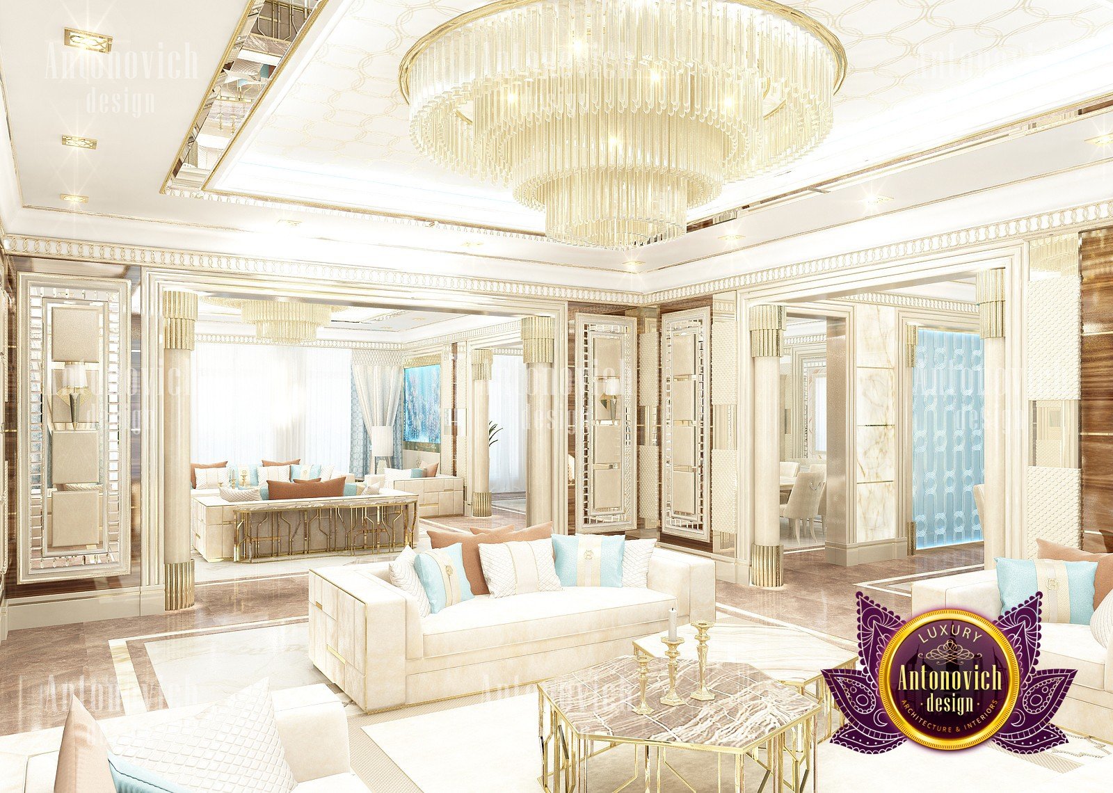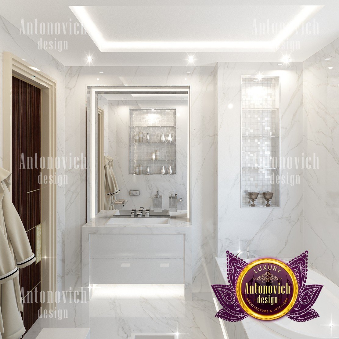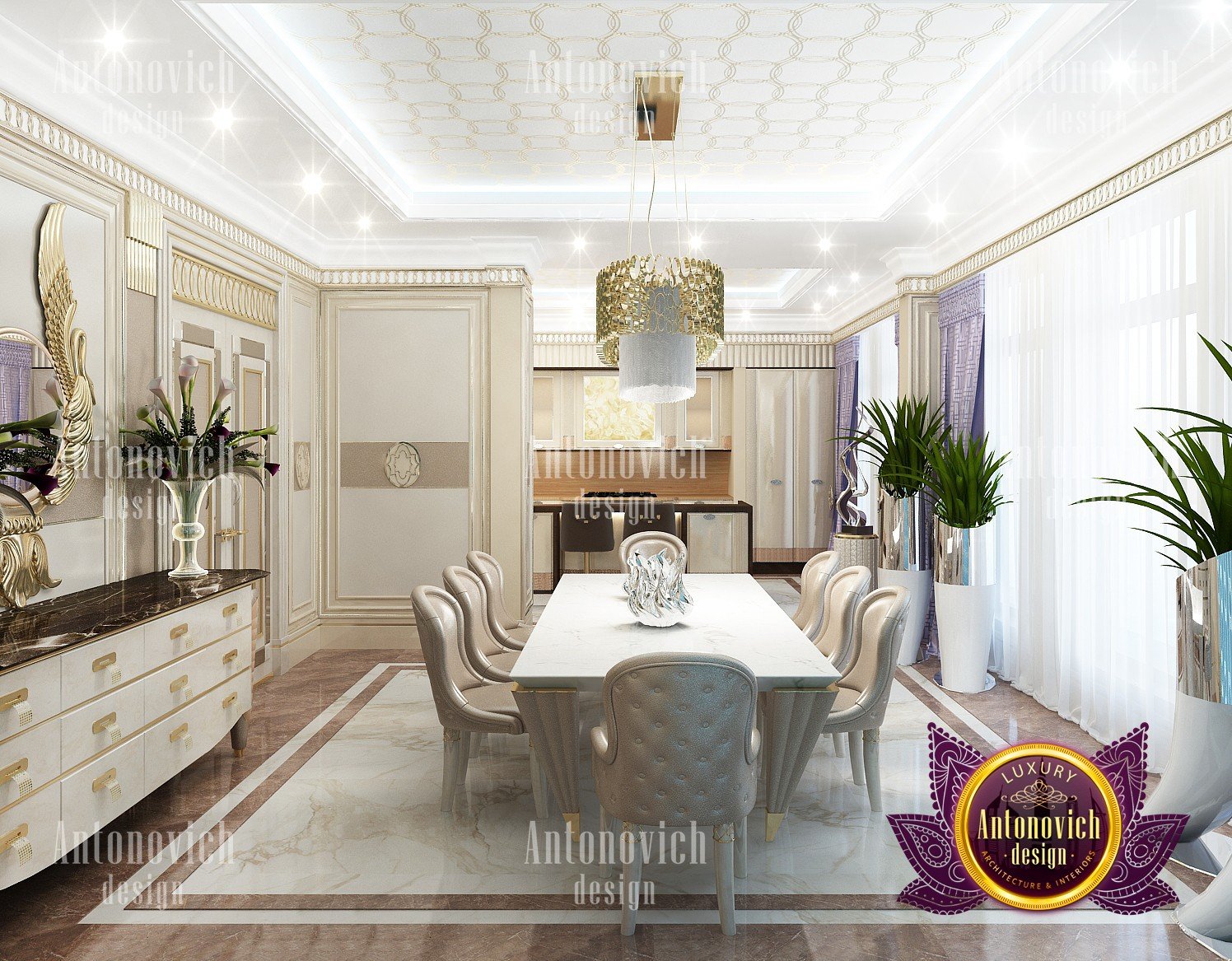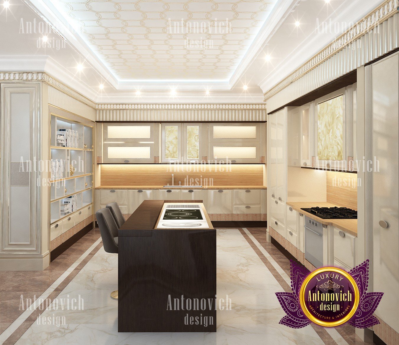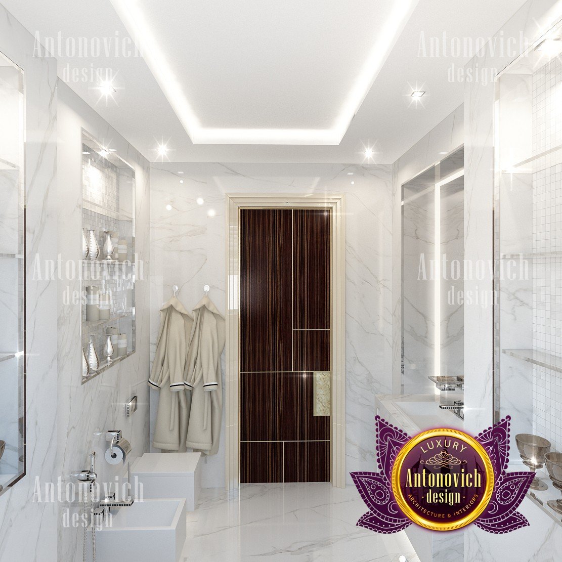 Interior design in a modern style was designed by the studio Luxury Antonovich Design for one of the villas in Dubai. Amazing laconic interior adjusts to the serenity and pleasant stay in a comfortable environment. The villa design Dubai is full of spectacular solutions of talented interior designers. Living room and dining room are a complete image. And most importantly, the basis of this unity became a spectacular ceiling design. Daring design techniques give the house interior in Dubai originality and bright personality. The basis of the ceiling is an array of dark wood, which continues on one wall in the living room. To compensate for the dark color of the wood and give it a refined element of decoration visual lightness, interior designers use the line of LED backlighting and a snow-white edging of the element of decor with ceiling lights. Another effective method is a visual mirror image of soft sofas and coffee table in the living room. Light upholstery contrasts stylishly with dark paneling on the ceiling and parquet on the floor. Traditional chandelier in the interior is replaced with unique stylish lamps and sconces. The staircase leading to the second floor, elegantly dissolved in a cozy space, thanks to the railing made of transparent glass. House Design Dubai clearly repeats the tastes and preferences of home owners, their love of contemporary art and the desire to get a new experience in life. Interior Design Dubai becomes a kind of prophecy of the future in the design of the elite interiors.