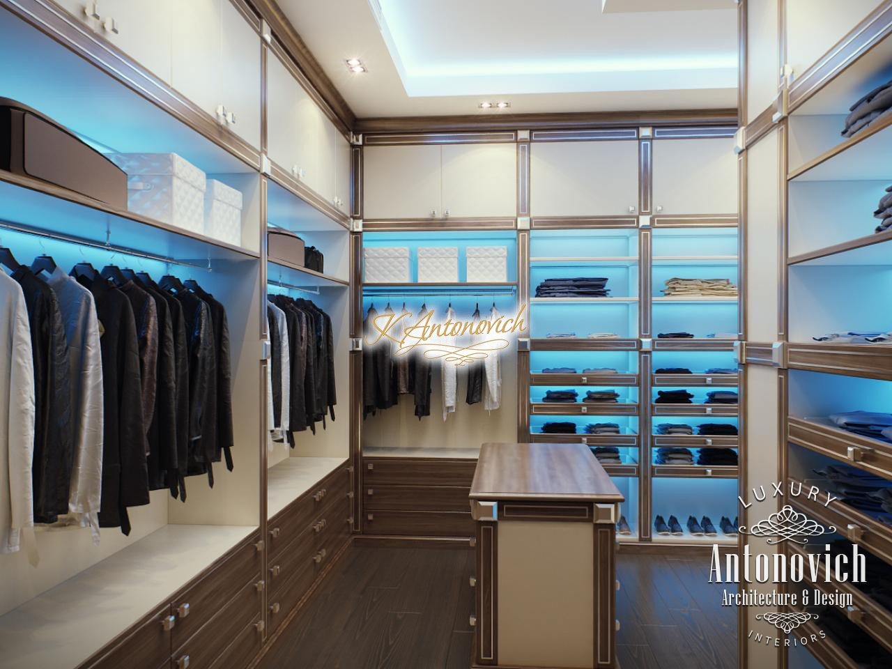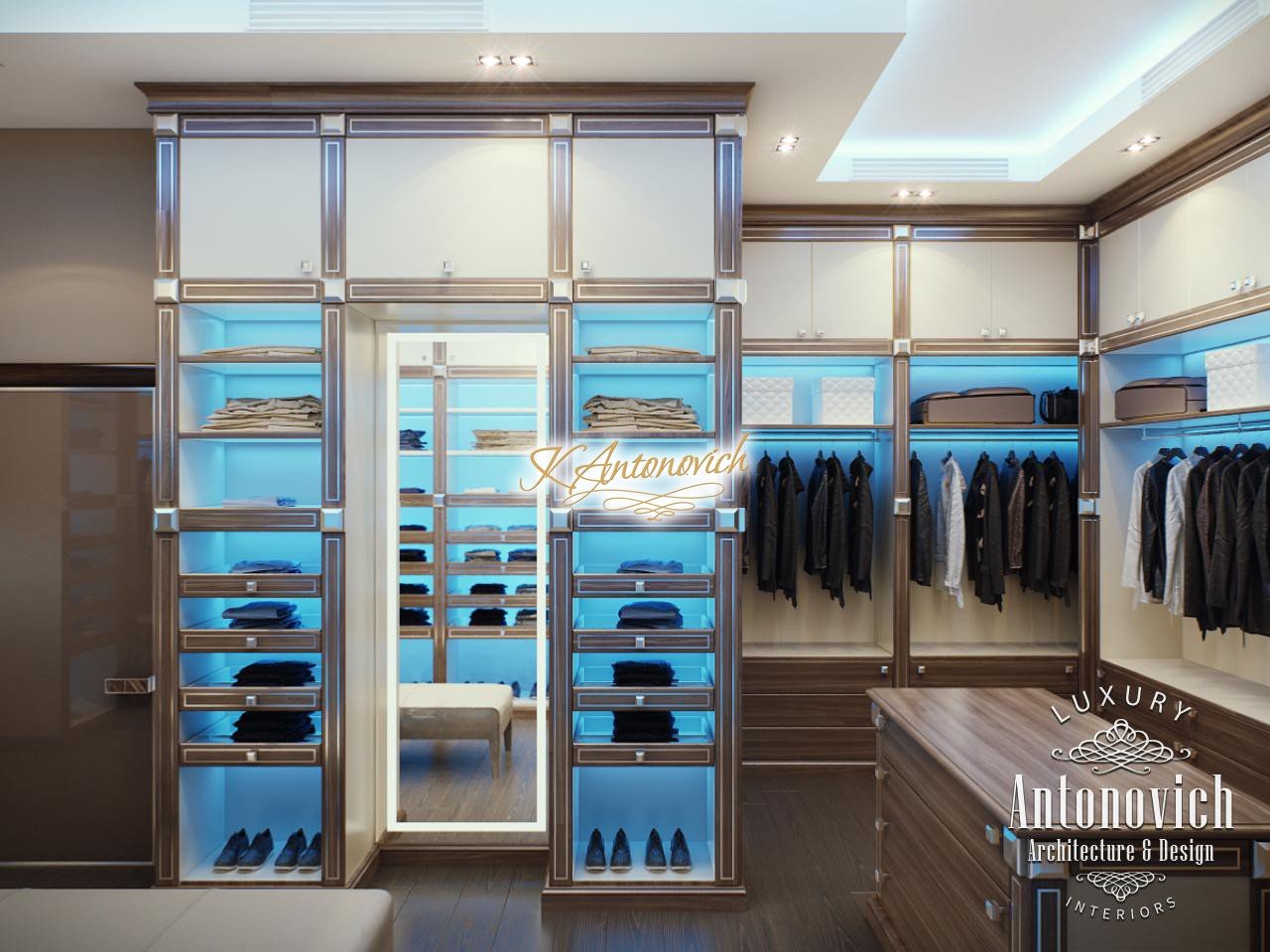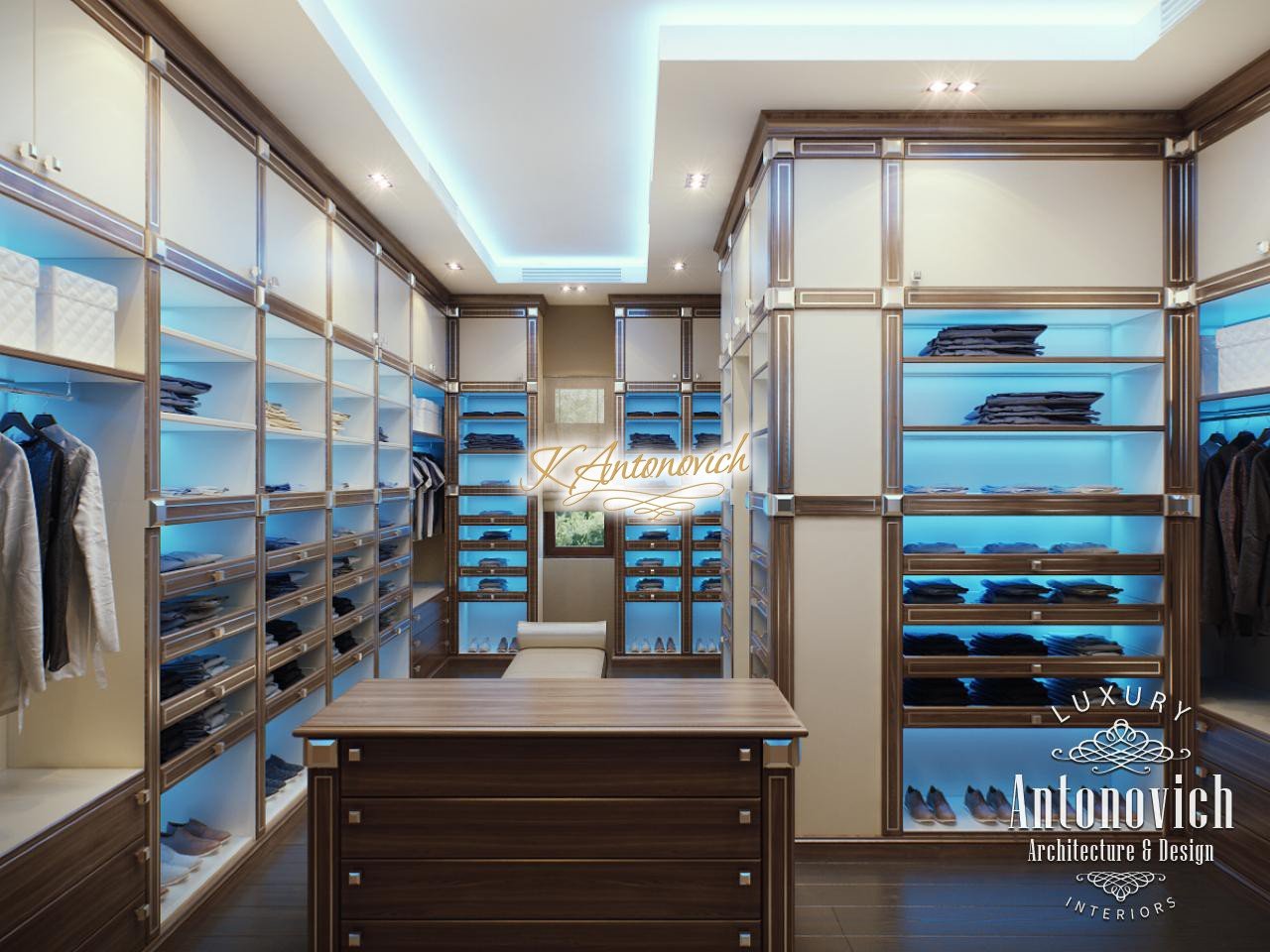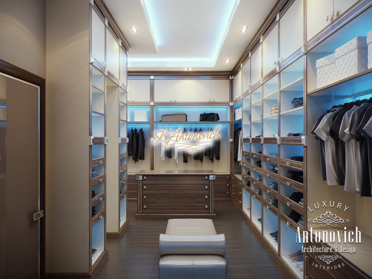 Spacious dressing room has an exceptional functionality. Villa Design in Dubai is in a contemporary style. Laconic and comfortable interior with a touch of respectability perfectly reflects the wishes of the owner of the house. One of the main requests was that the house should give a feeling of absolute comfort. Dressing room design perfectly embodies this wish. Interior Designers Dubai competently organize the space so that every thing is in place and the choice of clothes in these apartment is a joy and a pleasure. The dressing room interior design underlines respectability. Precious wood is combined with wonderful accents in the form of LED backlighting. A set of open shelves, which are illuminated from the inside, creates a wonderful feeling of space and ease.