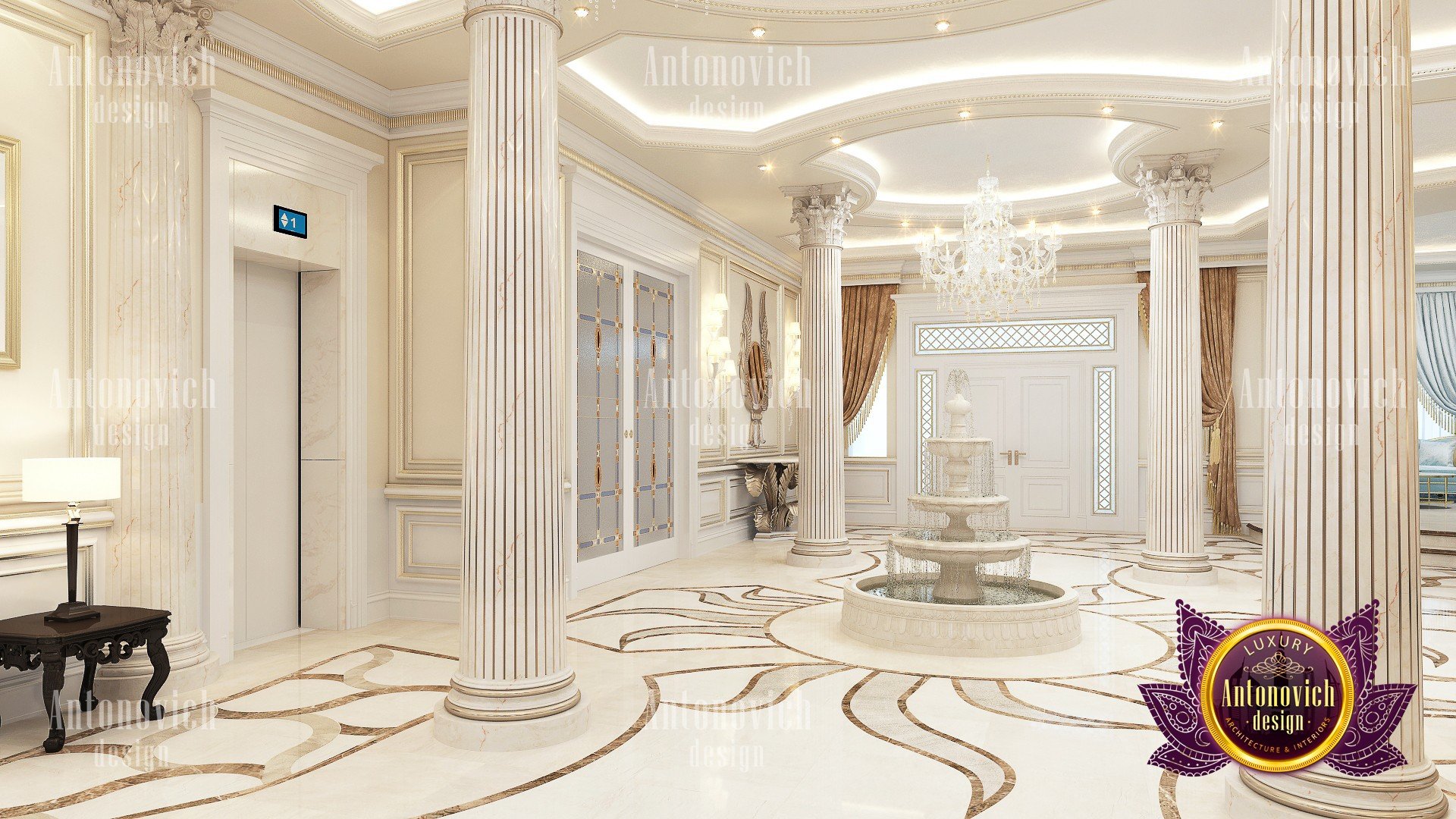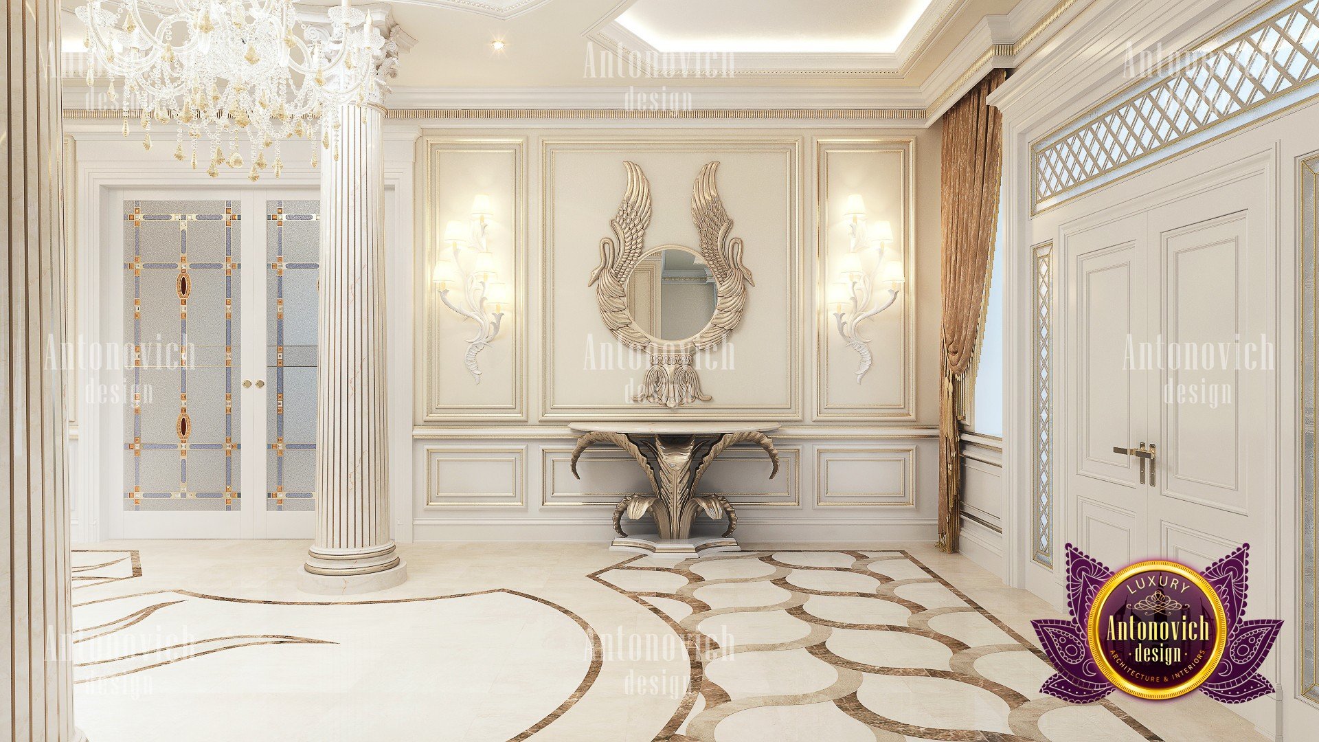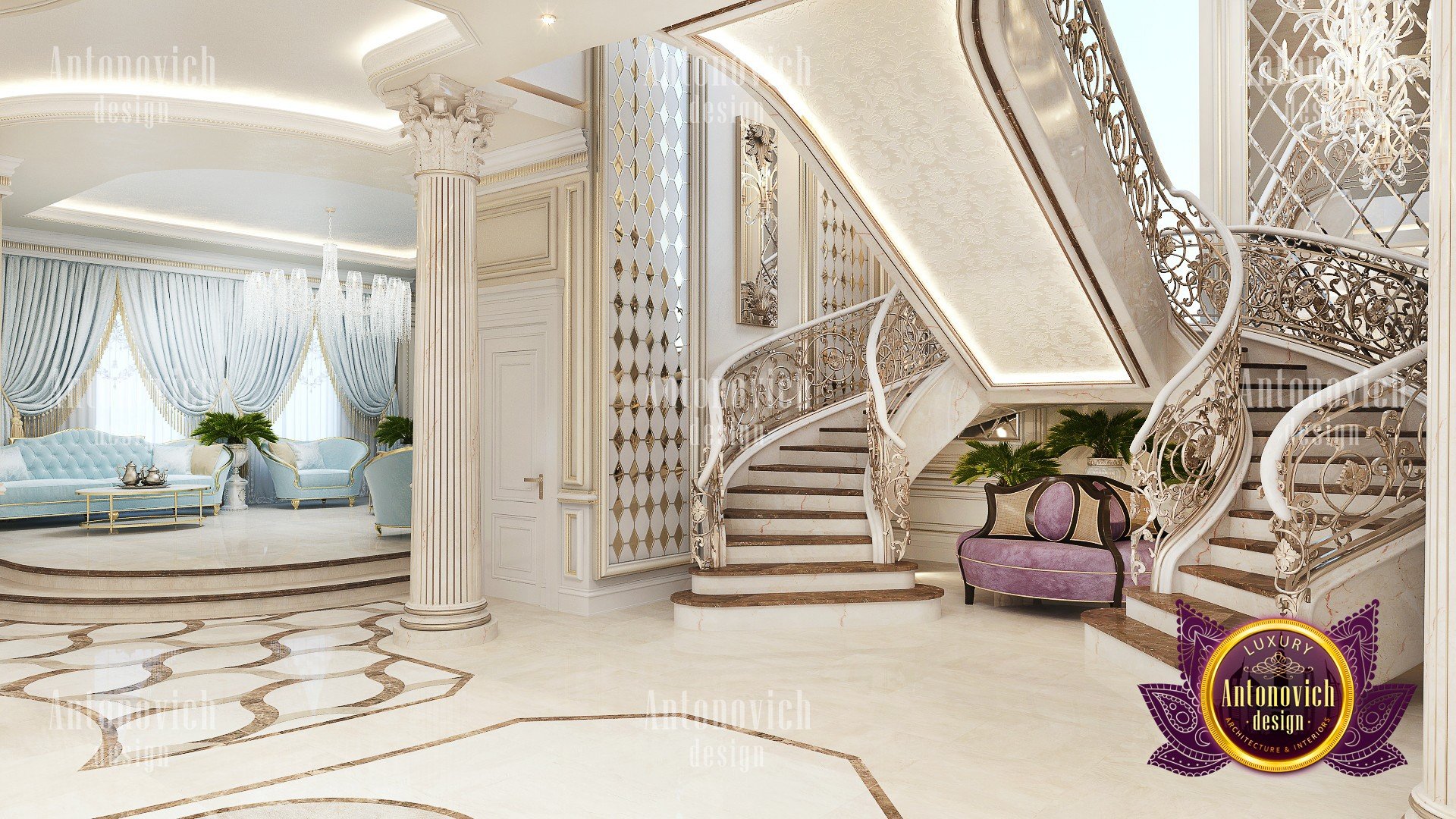 Delightful mood of palatial luxury in the beautiful interior of the villa in Abu Dhabi is based on a set of decorative elements. Each element becomes an integral part of the overall look of luxury. And the floor design plays in this celebration of splendor one of the main roles. Handmade carvings on the floor of a noble marble subtly echo the contours of curls stucco decoration and carved wooden elements. In addition to being luxurious decoration in the interior, carved marble floors wonderfully serve as a refined way of zoning space. Floors design from the studio Luxury Antonovich Design is a work of art. And looking from the second level of the living room, you can endlessly contemplate the beautiful patterns of carved marble, experiencing aesthetic pleasure.