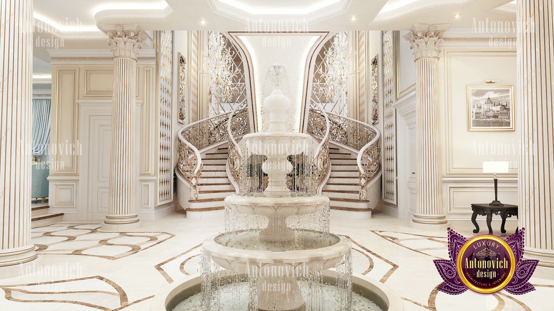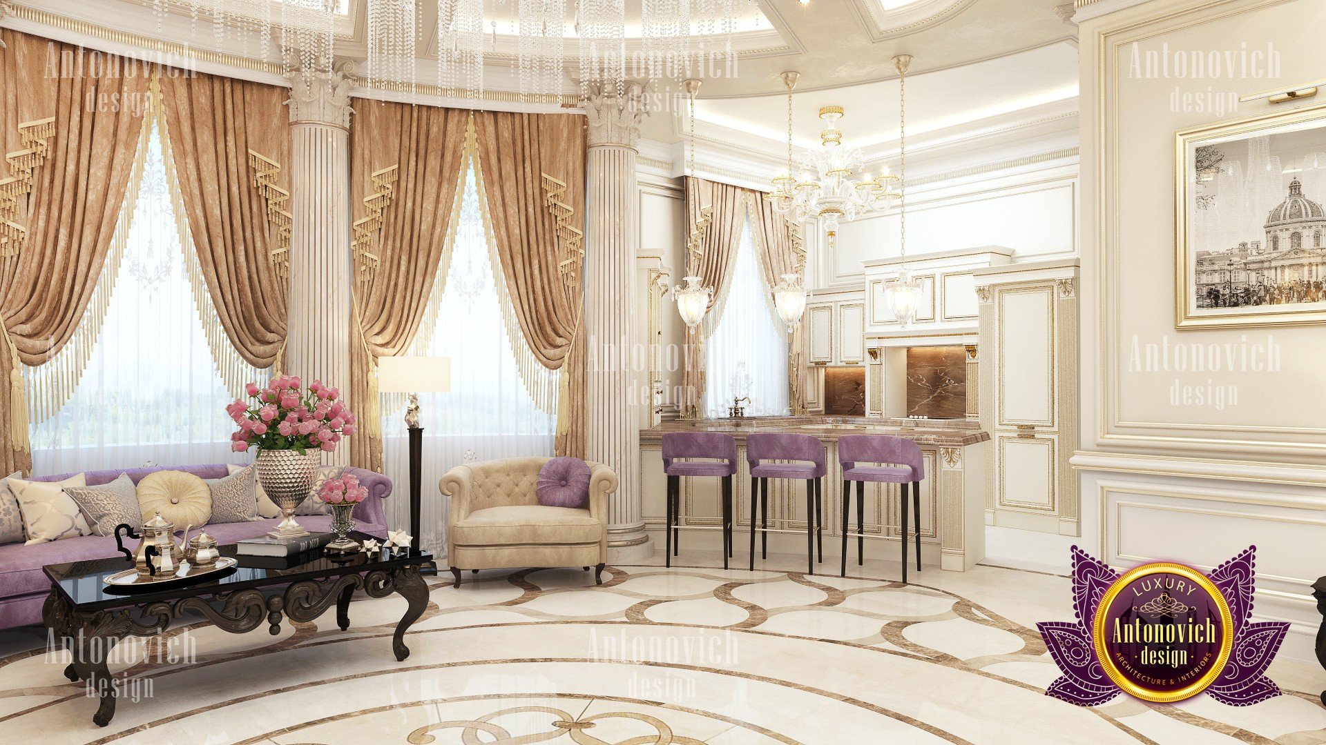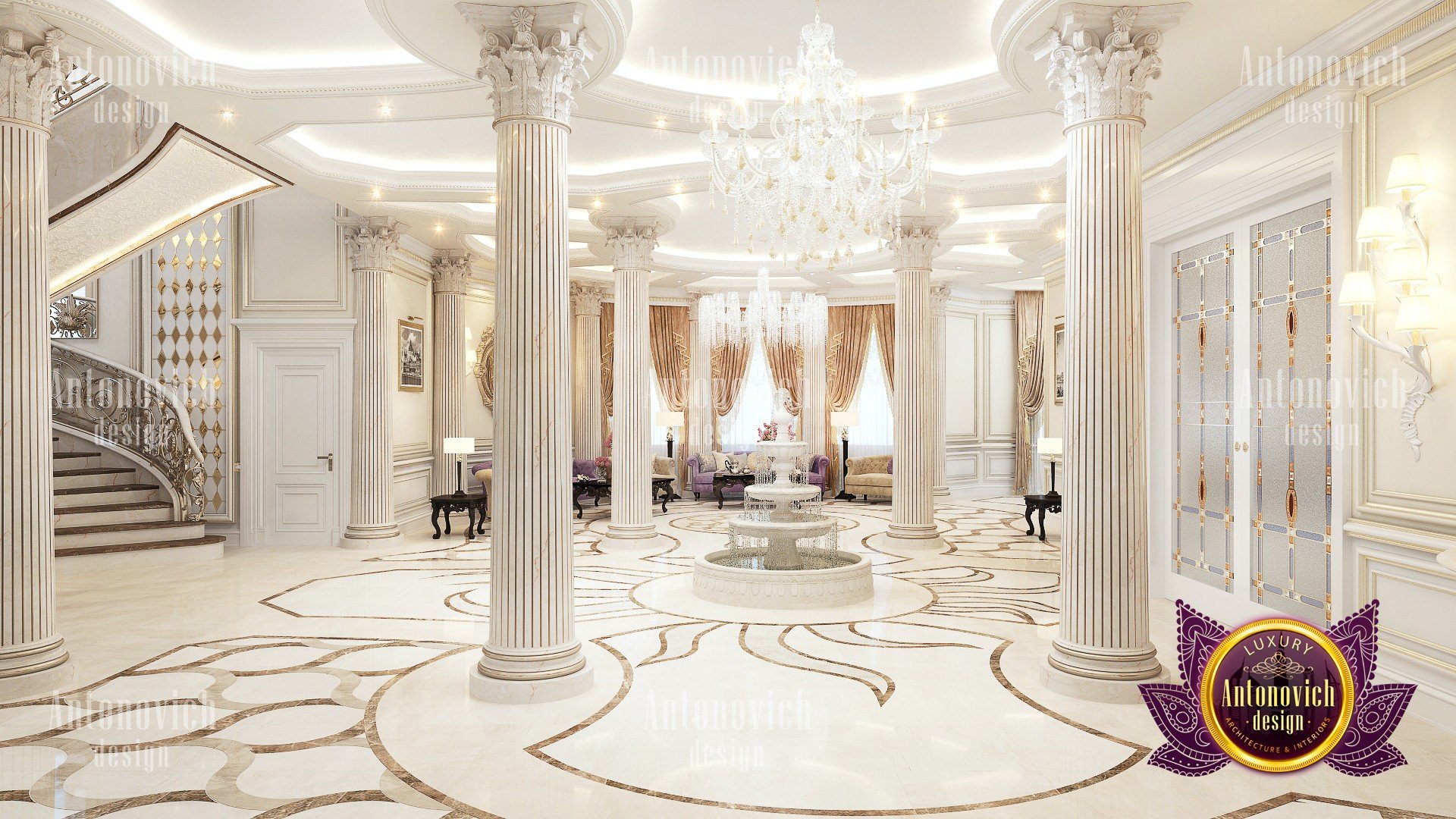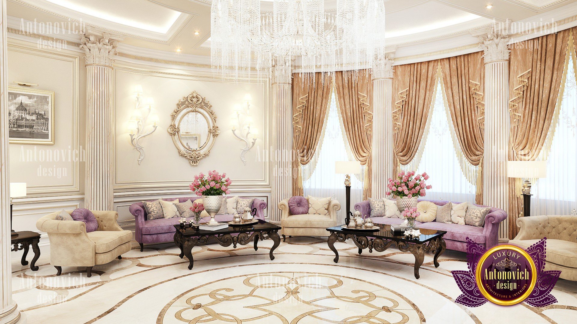 Delightful mood of palatial luxury in the beautiful interior of the villa in Abu Dhabi is based on a set of decorative elements. Each element becomes an integral part of the overall look of luxury. And the floor design plays in this celebration of splendor one of the main roles. Handmade carvings on the floor of a noble marble subtly echo the contours of curls stucco decoration and carved wooden elements. In addition to being luxurious decoration in the interior, carved marble floors wonderfully serve as a refined way of zoning space. Floors design from the studio Luxury Antonovich Design is a work of art. And looking from the second level of the living room, you can endlessly contemplate the beautiful patterns of carved marble, experiencing aesthetic pleasure.