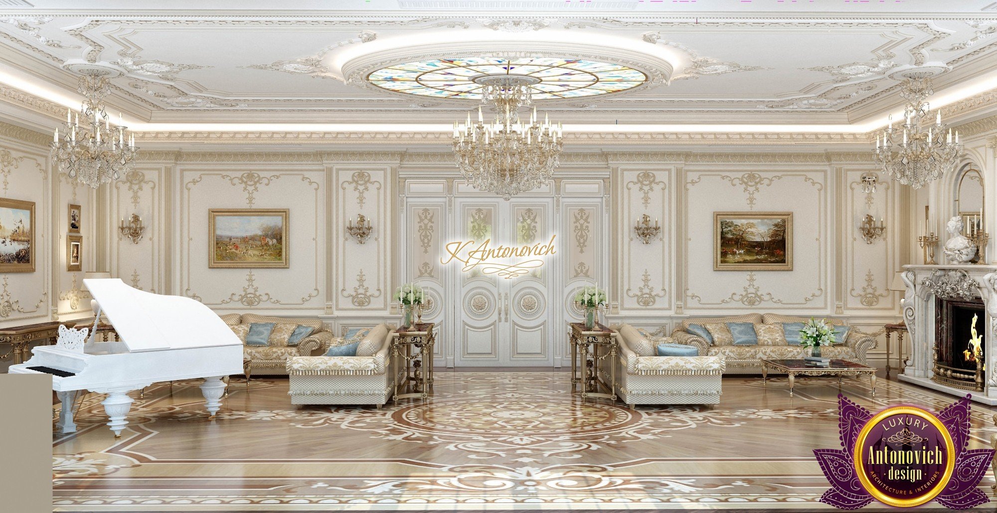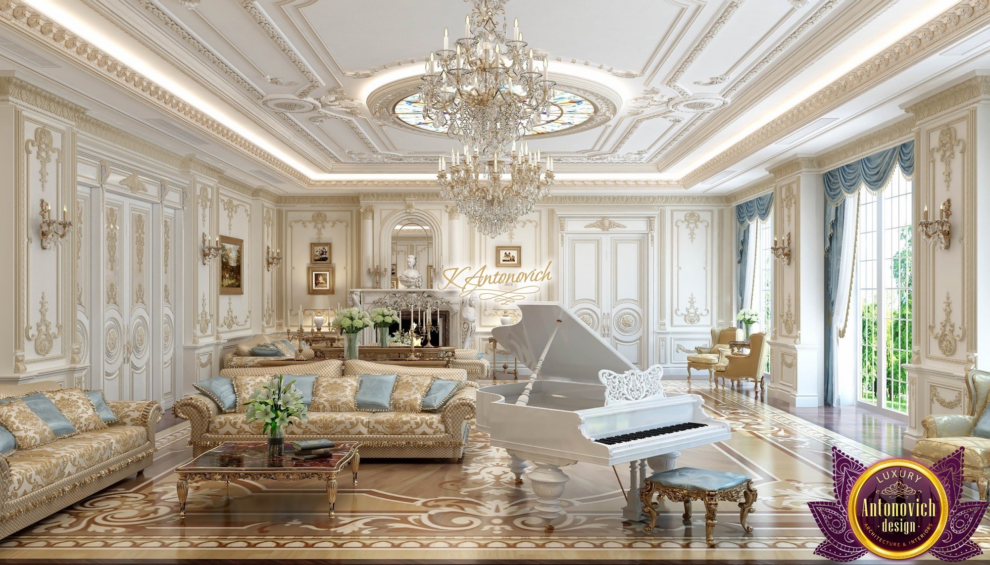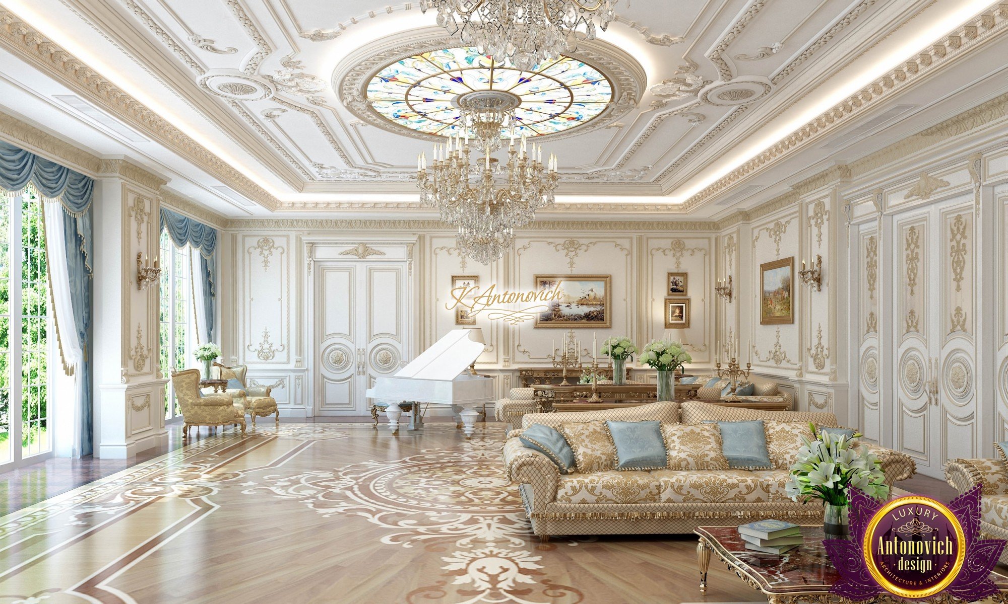 Interior designers managed to combine a maximum of luxurious details in the large living room. The most expensive homes need the most expensive elements of the decor.It requires a lot of talent and experience to create such harmonious and perfect living room interiors in a classic style. Let's look at the ceiling design. There is such of a delightful beauty interior item as stained glass. Luxury stained glass in the Tiffany technique surrounds the elegant crystal chandelier. It is surrounded by soft lighting line, which makes this decor fragment visually floating in the air. The combination of striking design ideas, fine traditions, and modern technology is the basis of the creation of such luxurious and beautiful interiors.But the magnificent decoration of the ceiling does not end there. It snow-white smooth surface is decorated with lush stucco and two additional chandeliers in the classic style. One defines the center of recreation zone near the marble fireplace, the other illuminates area with a white grand piano.In such a living room make soirees by inviting guests. These are the interiors are a real source of pride of house owners. The walls are decorated with cream-colored stucco and graceful swirls of stucco decoration. In such frame worthy looks paintings of artists and refined classic sconces. Art parquet from several kinds precious woods perfectly suited for the decoration of an aristocratic interior.High windows decorated with luxurious classical curtains of blue silk with a golden fringe decor.This is the luxury with perfect accents in the best traditions of the classical style.