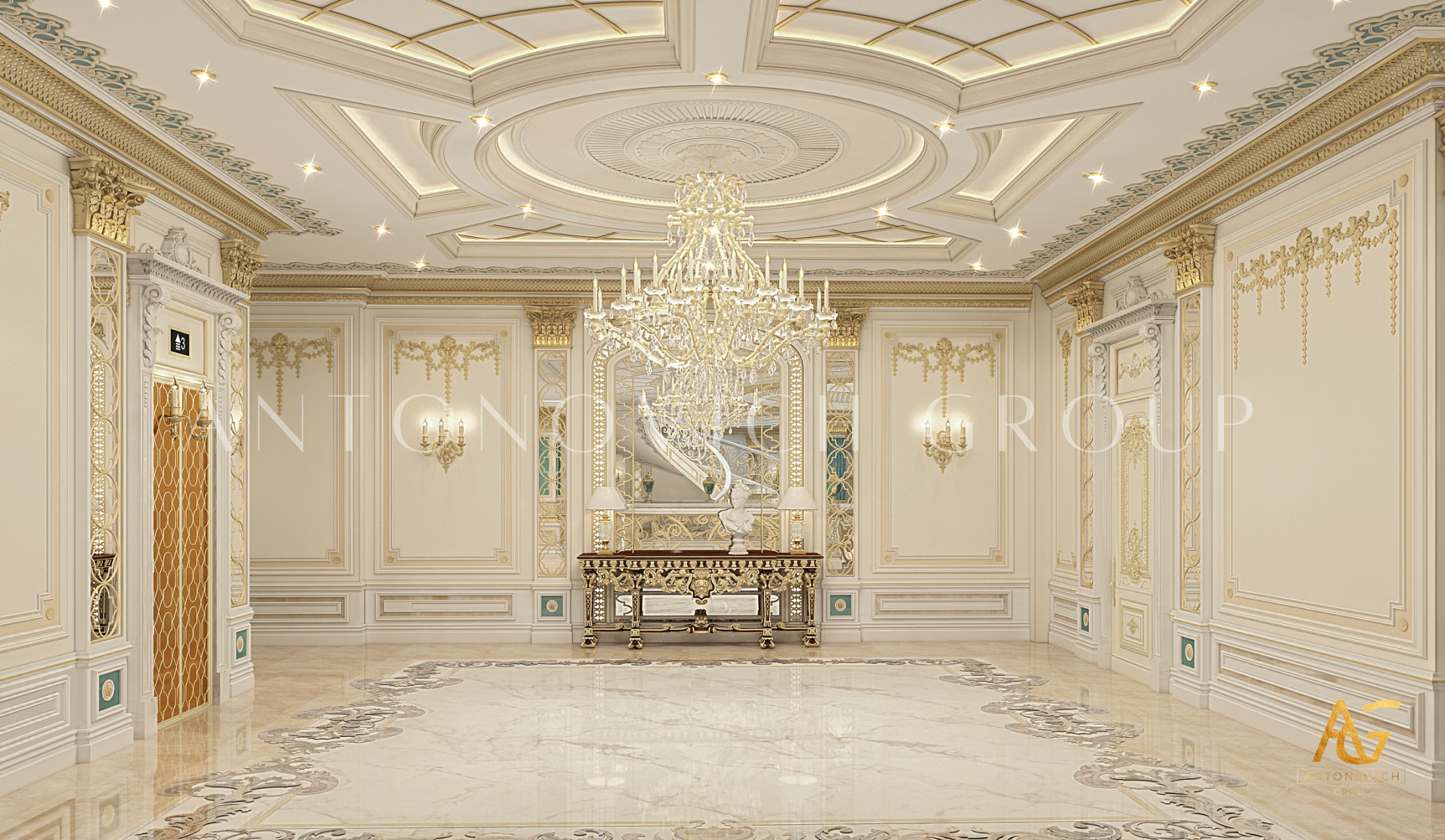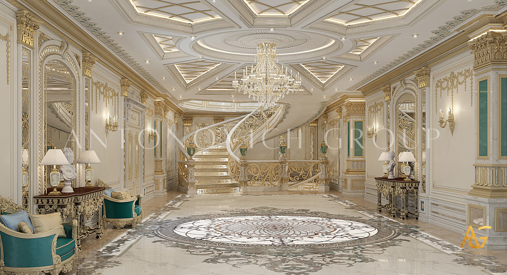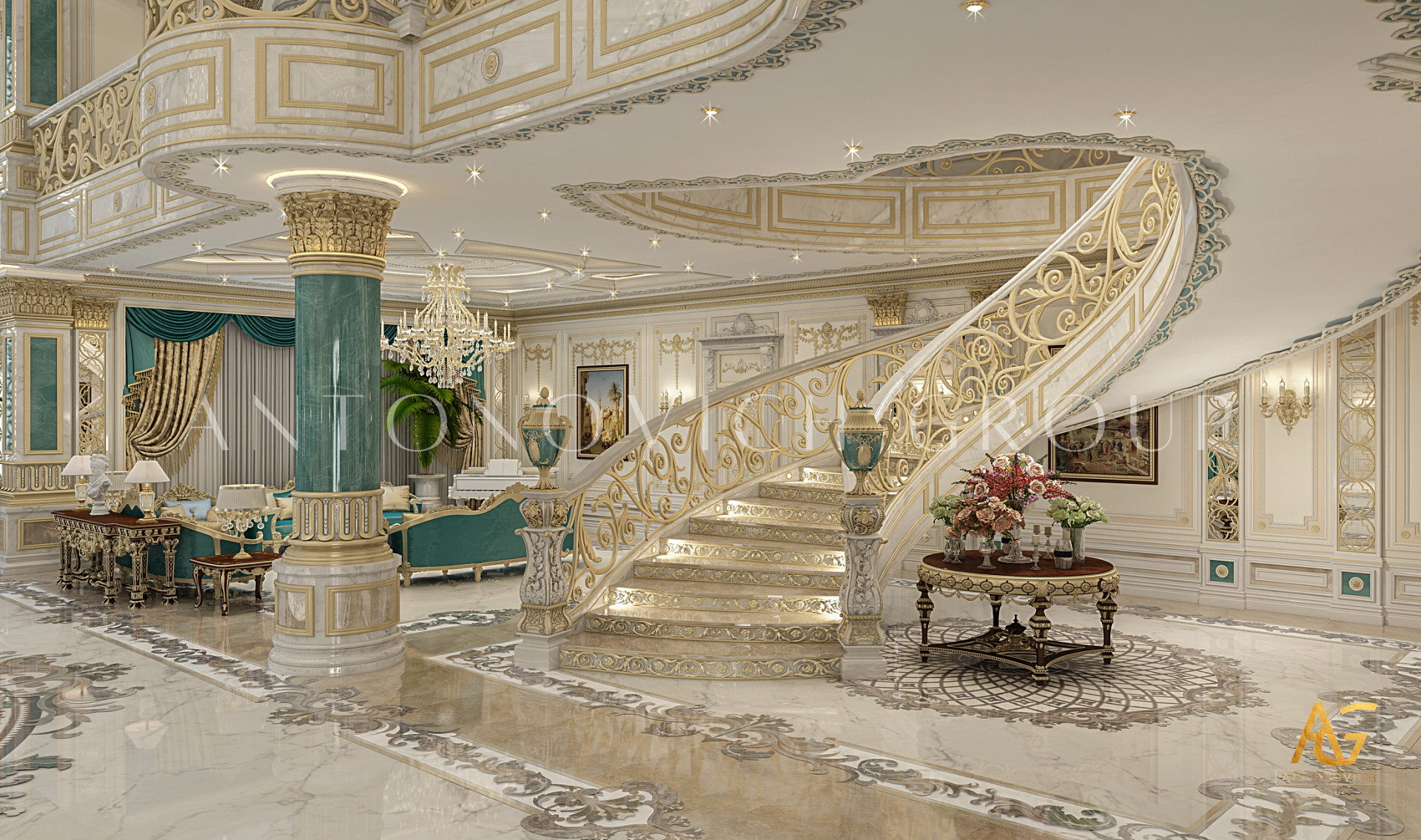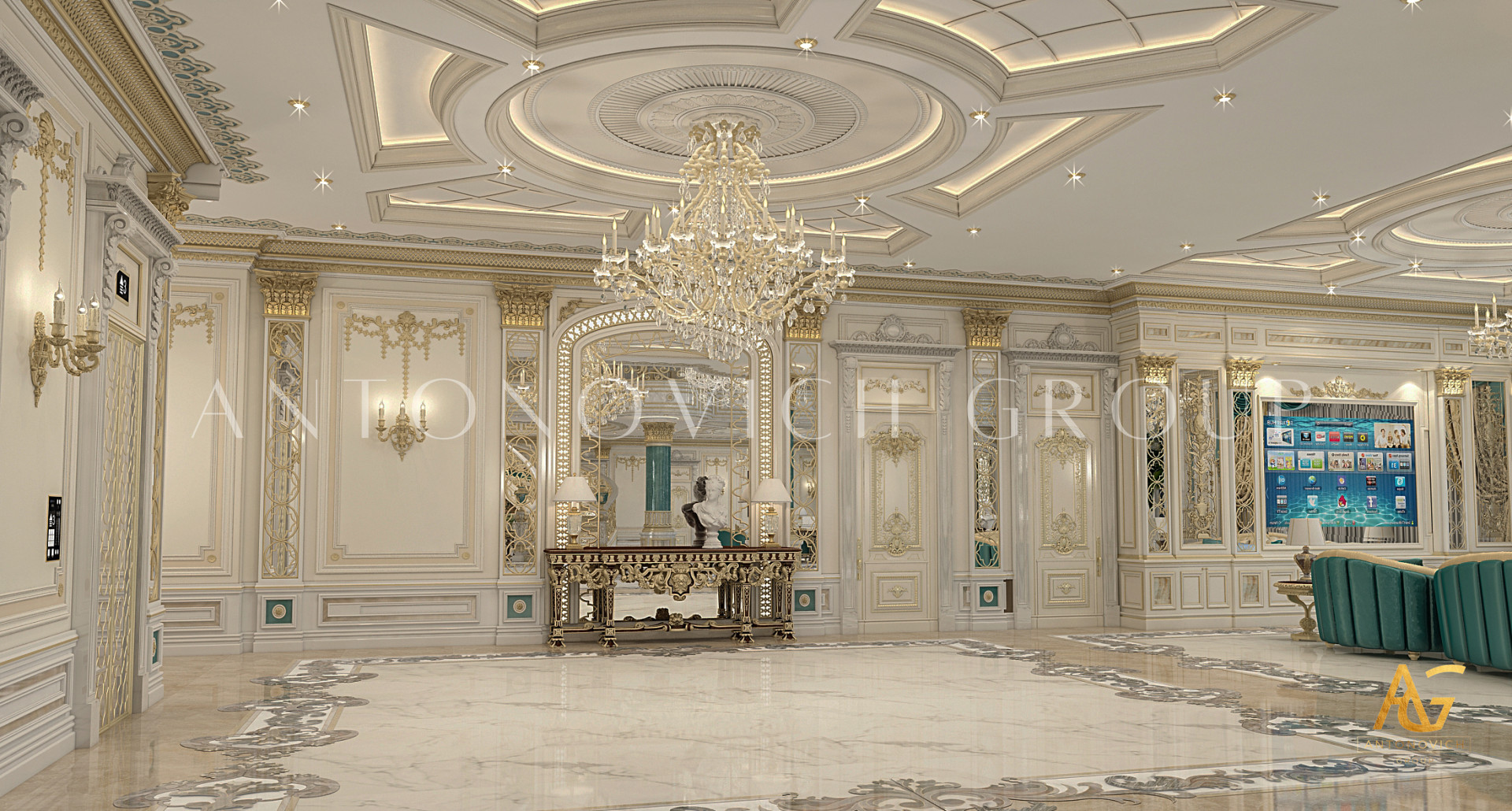 No doubt, Luxury Antonovich Design is always the best choice for every elite client in developing their properties local and international. This Royal style villa is one of the recent greatest examples of outstanding project design execution as it has been perfectly accomplished the style according to every clients requirement at the same time is sticking up with the classical design concept. There is a set of visible luxuriousness that can be seen in every detailed decoration and furniture design, such as the customized huge chandelier at the center of the lobby, out of this world detailed design and craftsmanship towards the flooring of the lobby with a perfect underneath lighting, the dramatic staircase design, perfect selections of extra luxurious furniture’s.