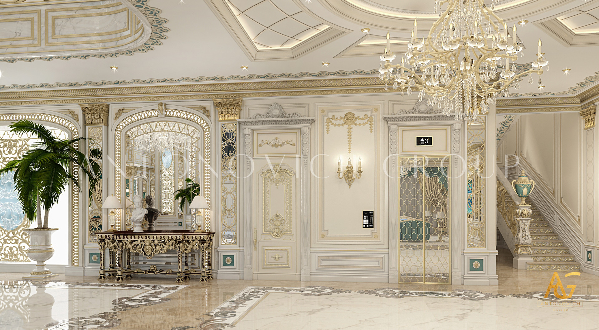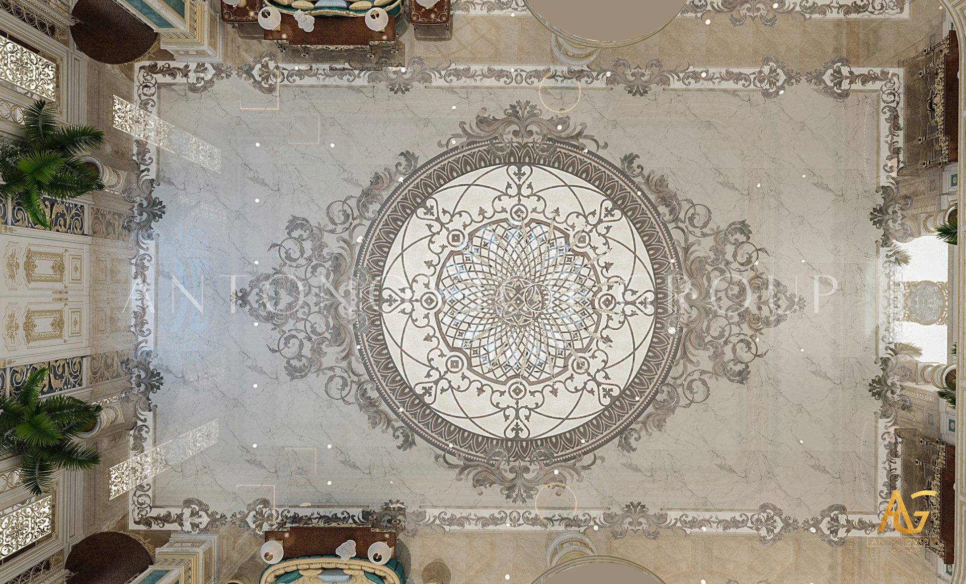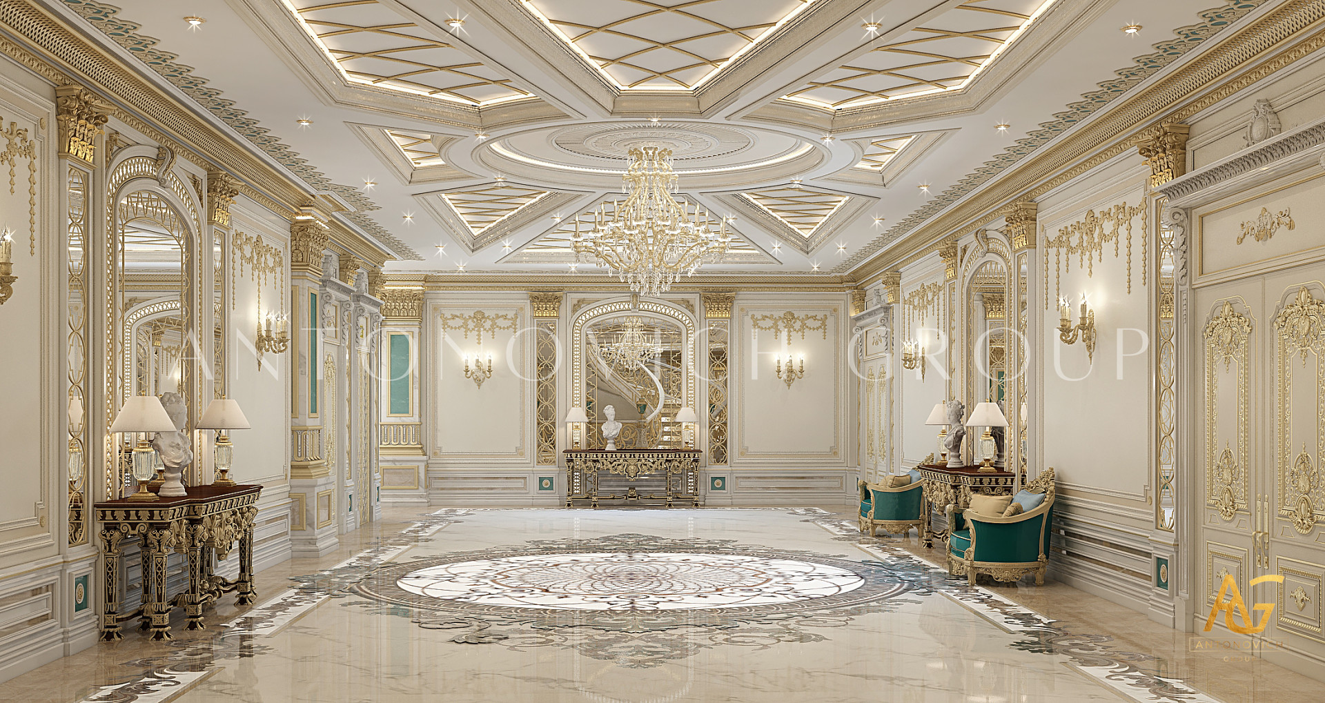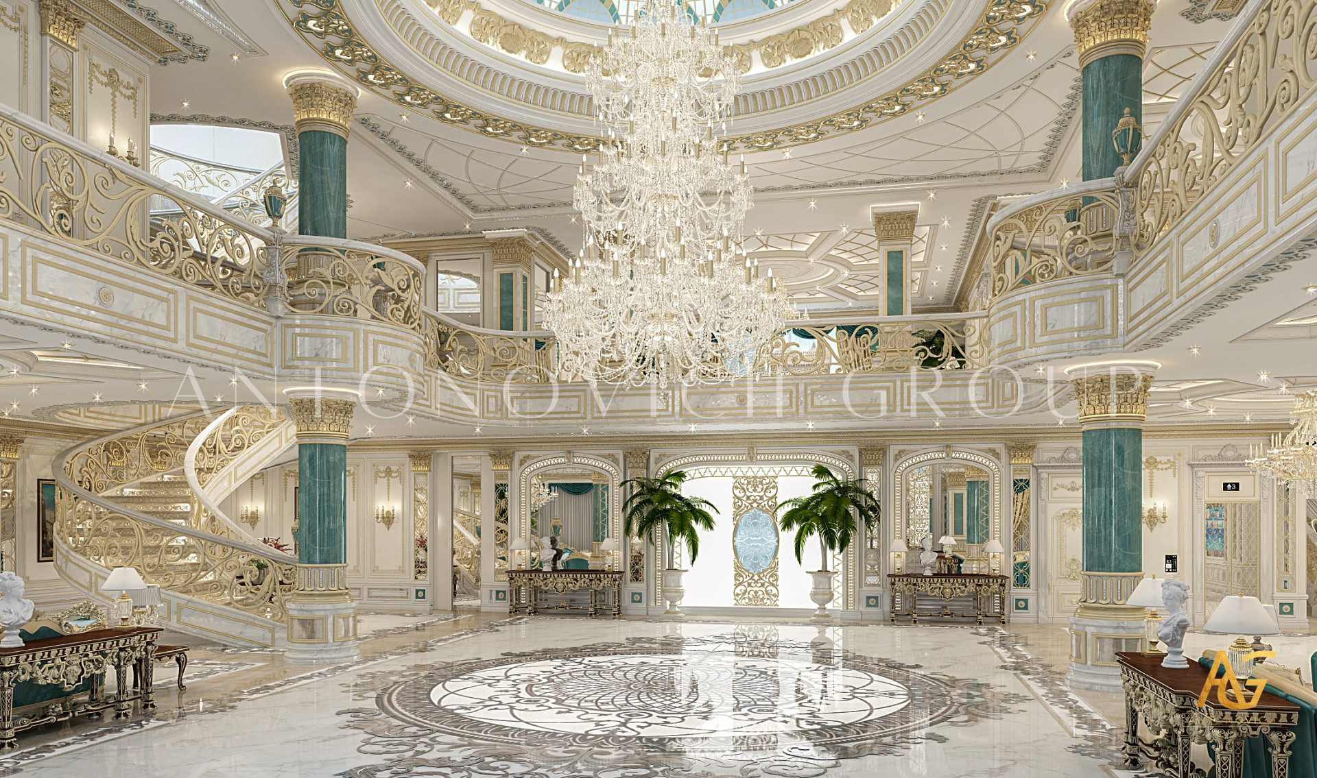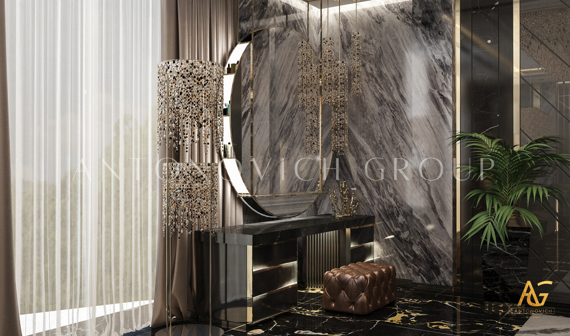 No doubt, Luxury Antonovich Design is always the best choice for every elite client in developing their properties local and international. This Royal style villa is one of the recent greatest examples of outstanding project design execution as it has been perfectly accomplished the style according to every clients requirement at the same time is sticking up with the classical design concept. There is a set of visible luxuriousness that can be seen in every detailed decoration and furniture design, such as the customized huge chandelier at the center of the lobby, out of this world detailed design and craftsmanship towards the flooring of the lobby with a perfect underneath lighting, the dramatic staircase design, perfect selections of extra luxurious furniture’s.