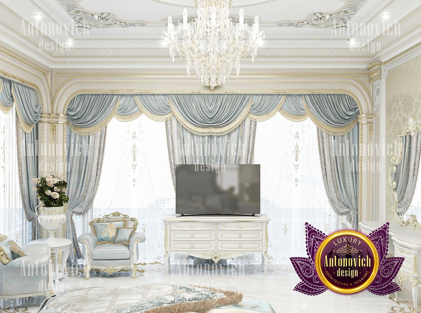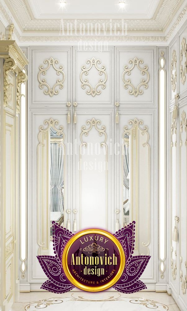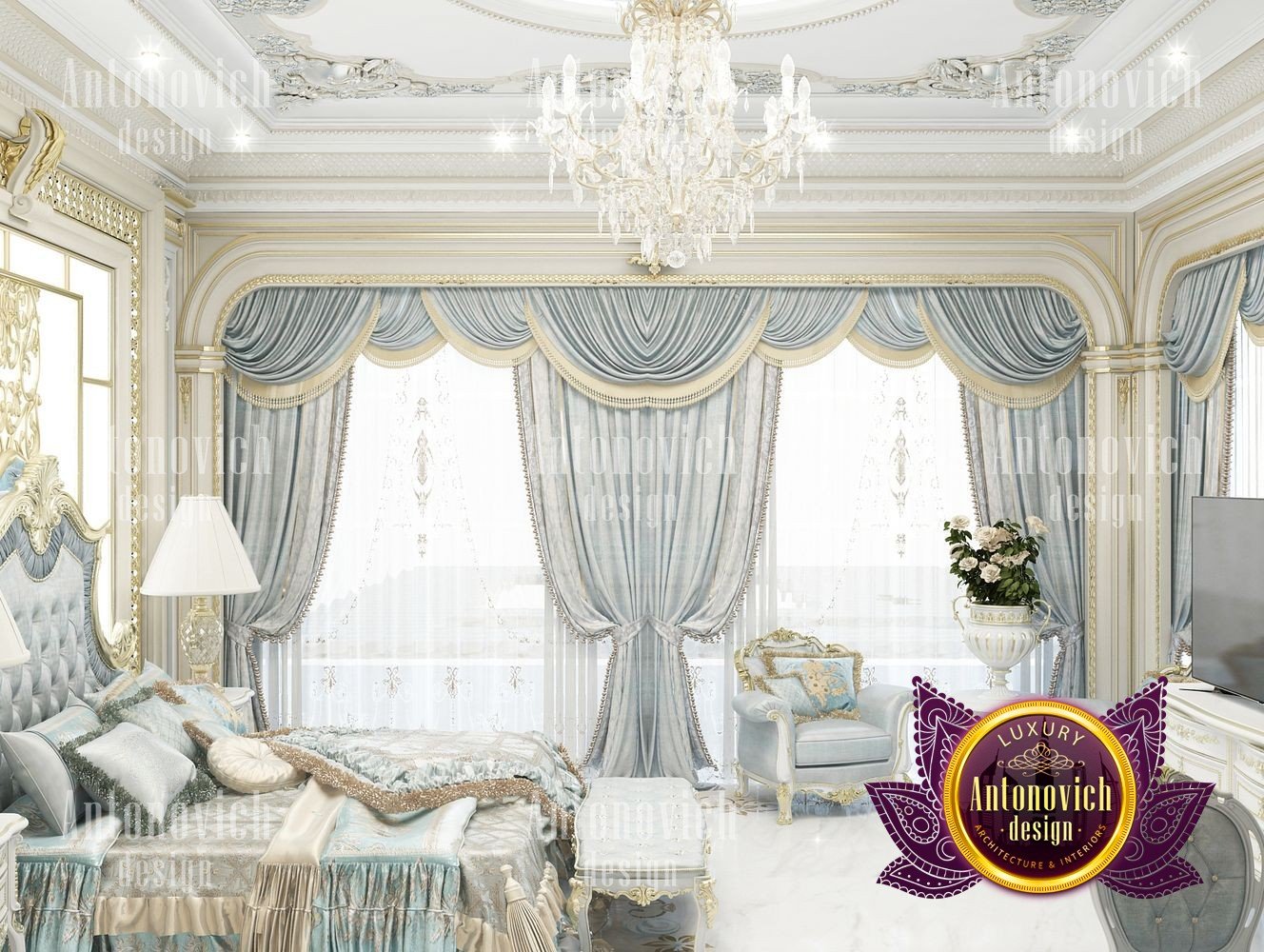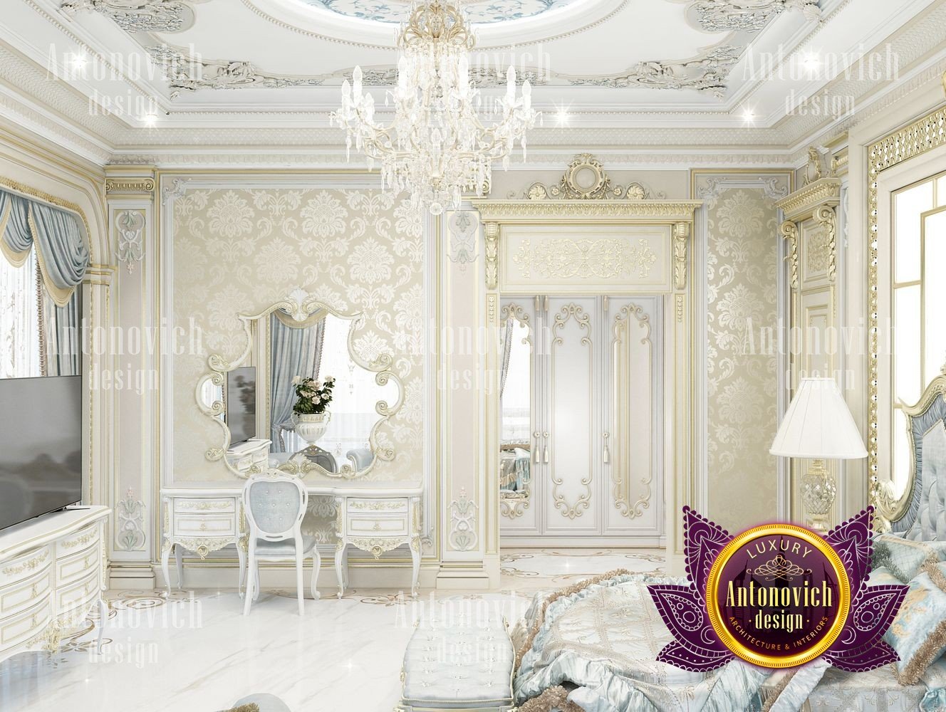 В конце утомительного дня нет ничего лучше, чем вернуться в уютную и комфортную спальню. Каждая спальня, которую мы создаём, становится персонализированной. Мы уделяем время, чтобы узнать о ваших предпочтениях и образе жизни. Это помогает дизайнерам разработать индивидуальное и уникальное пространство. Этот проект действительно демонстрирует дизайн спальни классический роскошный. Помимо сохранения общей концепции дома, все варианты цвета и выбранные материалы полностью соответствовали пожеланиям клиента. В качестве центрального элемента мы подобрали изысканную кровать в пудрово-голубой ткани, гармонирующую со шторами; стены и потолок украшены детализированной резьбой и золотыми линиями. Для поддержания элегантности была установлена полностью хрустальная люстра. Напротив кровати — плазменный ТВ, рядом — стильная и комфортная зона отдыха; также мы предусмотрели небольшую гардеробную и элегантные шкафы.