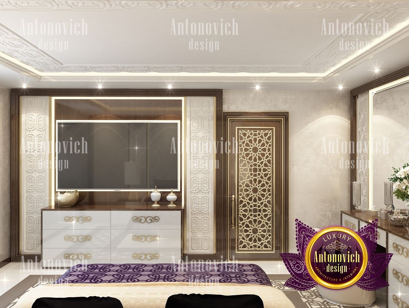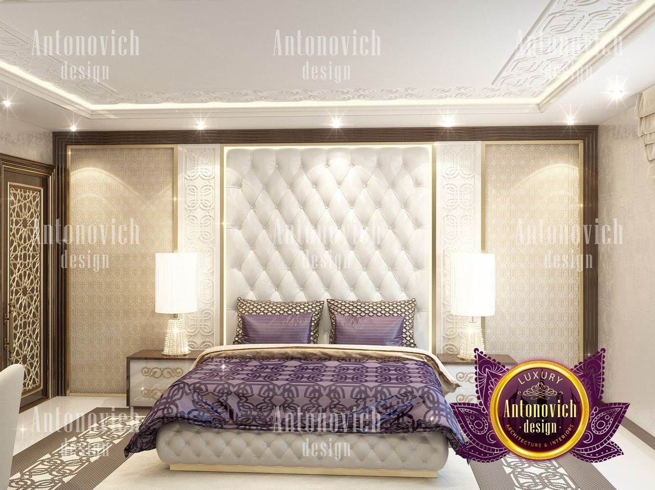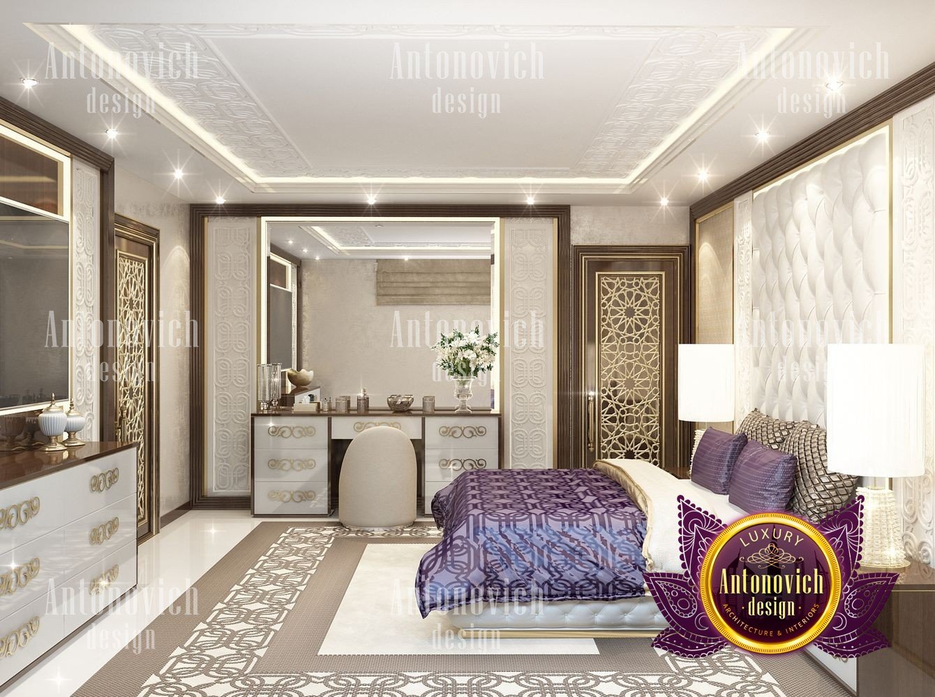 Жизнь наполнена ощущением спокойствия, расслабления и уверенности в будущем. Именно этот мотив использовали авторы — интерьерные дизайнеры студии Luxury Антонович Дизайн (Antonovich Design). Интерьер отличается мягким, уютным характером с нежными акцентами: современный дизайн спальни выражен через сочетание классики и фактур. Эту атмосферу создали с помощью мебели: мягкая мебель для спальни, мягкие кресла притягивают и располагают к отдыху. Просторная комната позволила организовать две зоны — спальную и зона отдыха в спальне; это уютная спальня с зоной отдыха в виде мини-гостиной: спальня с мини-гостиной. Спальная зона оформлена большой кроватью — это спальня с высокой мягкой спинкой кровати; глубокая ромбовая фактура с классическими пуговицами подчёркивает традиционный классический стиль. Настоящим шедевром стали мраморные полы с резными узорами. Современная технология лазерной резки камня позволяет реализовать любые фантазии и создавать роскошные эксклюзивные решения. В палитре преобладают светлые пастельные тона — кремовые, розовые и нежно-лиловые; текстиль для спальни в пастельных тонах и велюровая отделка окон спальни с принтами использованы для оформления двух больших окон. Декор стен элегантен и выразителен: авторы применяют лаконичную декоративную штукатурку вместе со зеркалами и ажурными молдингами — декоративная штукатурка и молдинги для спальни.