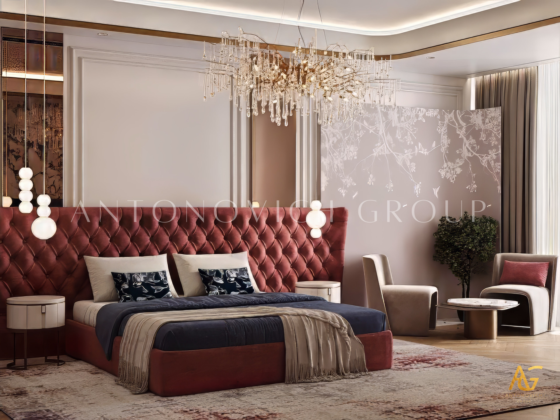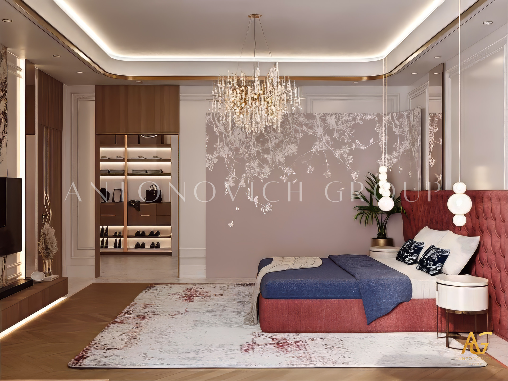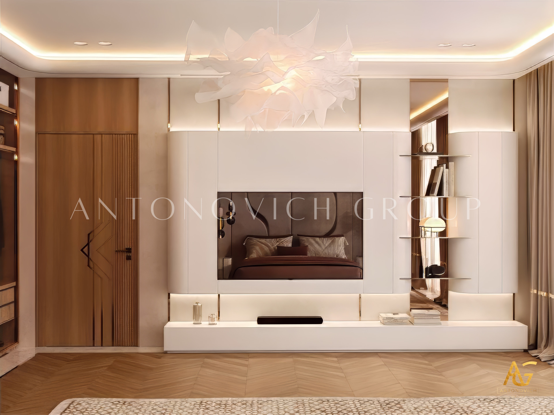 Золотые линии на стене и тёмный акцент придают общему облику дома элегантность и роскошь. Для усиления эффекта к роскошным узорам добавлены детализированные элементы. Этот прекрасный интерьер — бесспорно идеальный выбор для вас благодаря стильной подаче и глэм-эстетике. Перед запуском каждый элемент был тщательно проверен — от люстры до великолепных золотых линий. Цвета гармонируют между собой, а люстра — неизменный атрибут современного и премиального дизайна интерьера.