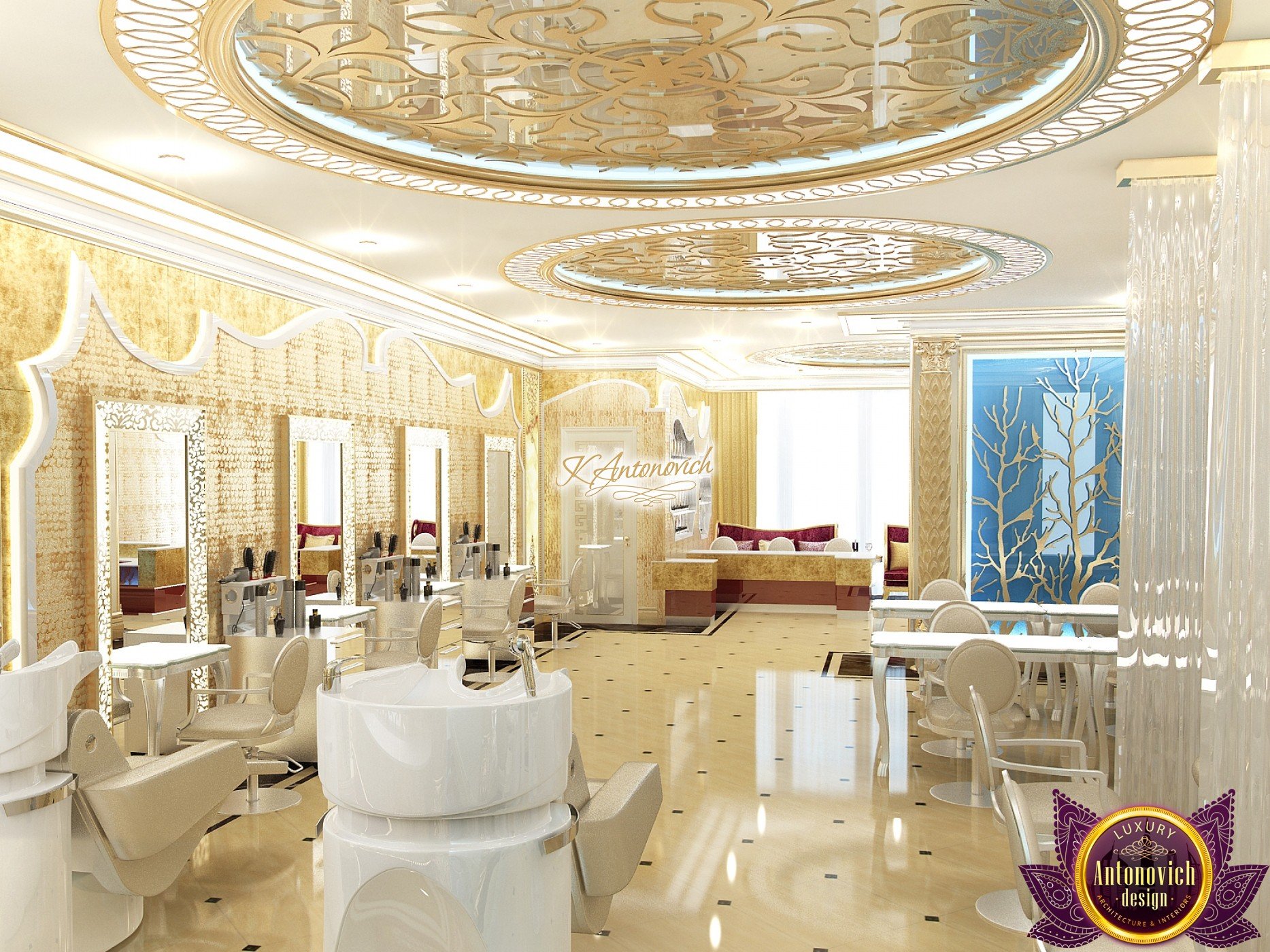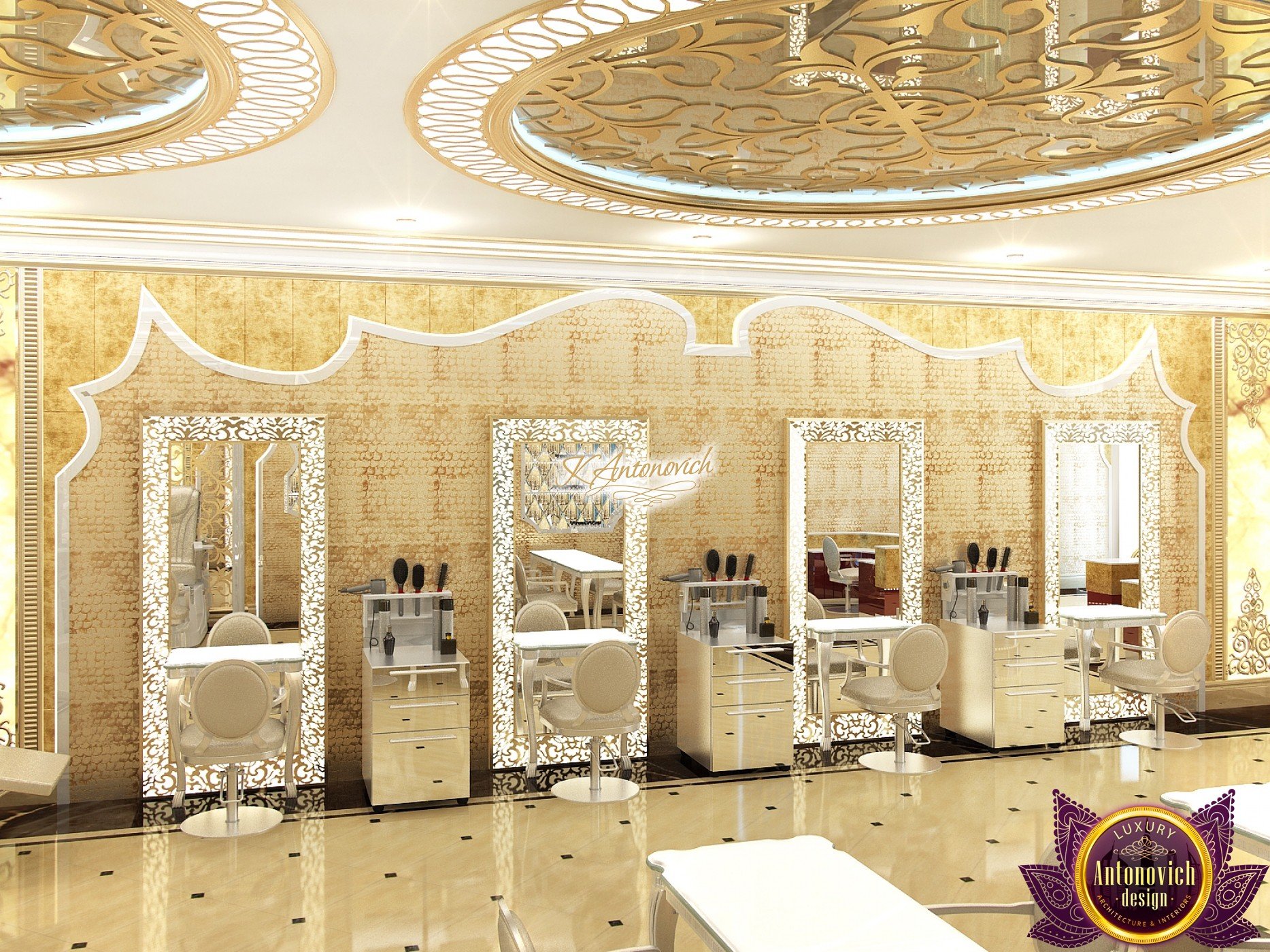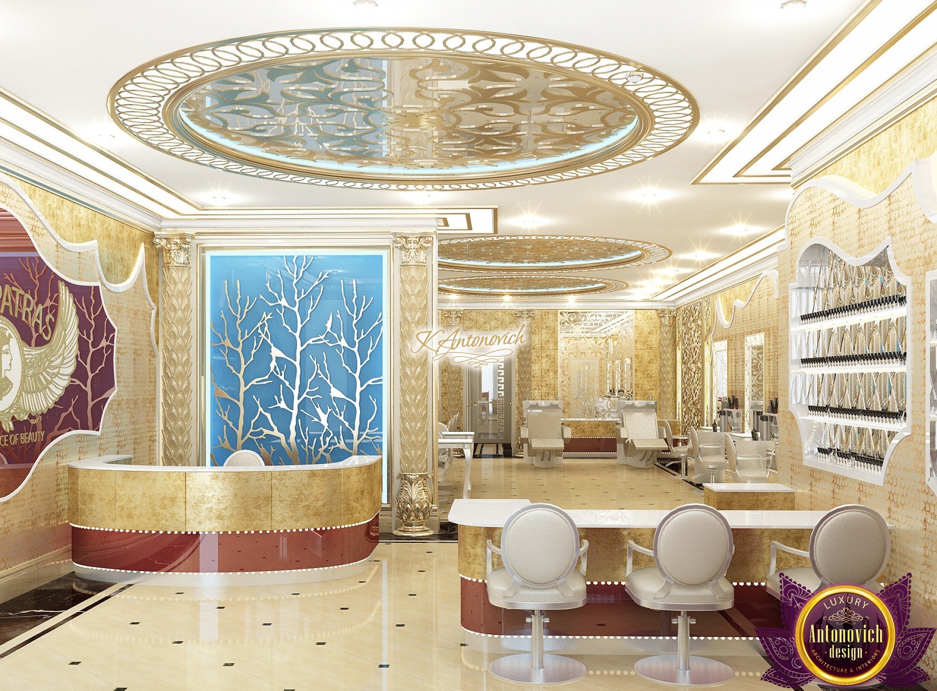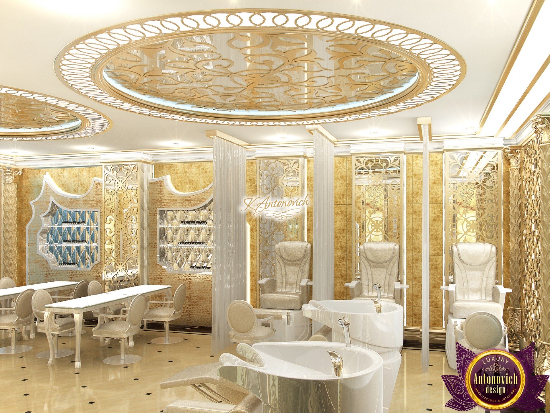 Интерьер салона красоты в Лагосе от Антонович Дизайн (Antonovich Design) прекрасно воплощает концепцию заведения, предлагающего элитные услуги. Дизайнеры стремились создать атмосферу, в которой каждая посетительница будет чувствовать себя королевой. Интерьер салона красоты арт-деко с акцентами ар-нуво отражает мотивы стилей, адаптированных к нигерийскому контексту. В качестве базовой цветовой гаммы авторы проекта предложили золотой. Золотые акценты в интерьере салона подчёркивают торжественность. Современные технологии в сочетании с творческими идеями дизайнеров студии Антонович Дизайн лежат в основе уникальной красоты интерьеров. Этот роскошный интерьер салона красоты стал ещё одним шедевром в портфолио студии и показывает, как дизайн салона красоты в Нигерии может сочетать эстетику и функциональность. Отделка потолка зеркальными панелями с деликатным золотым орнаментом визуально увеличивает пространство. Ниши с зеркалами в салоне, декоративные панели с цветочным орнаментом и декоративные пилястры и лепнина создают цельный образ. Чтобы сделать часть пространства более выразительной и одновременно зонировать его, дизайнеры использовали белую декоративную волну с мягкой подсветкой — так реализовано зонирование подсветкой в салоне красоты. Часть настенного декора — роскошные пилястры с лепестками и лепными капителями, полностью покрытые позолотой. Все эти элементы гармонично интегрированы в проект интерьера салона красоты премиум. Работая над проектом, дизайнеры учитывали технические нормы организации пространства таких салонов.