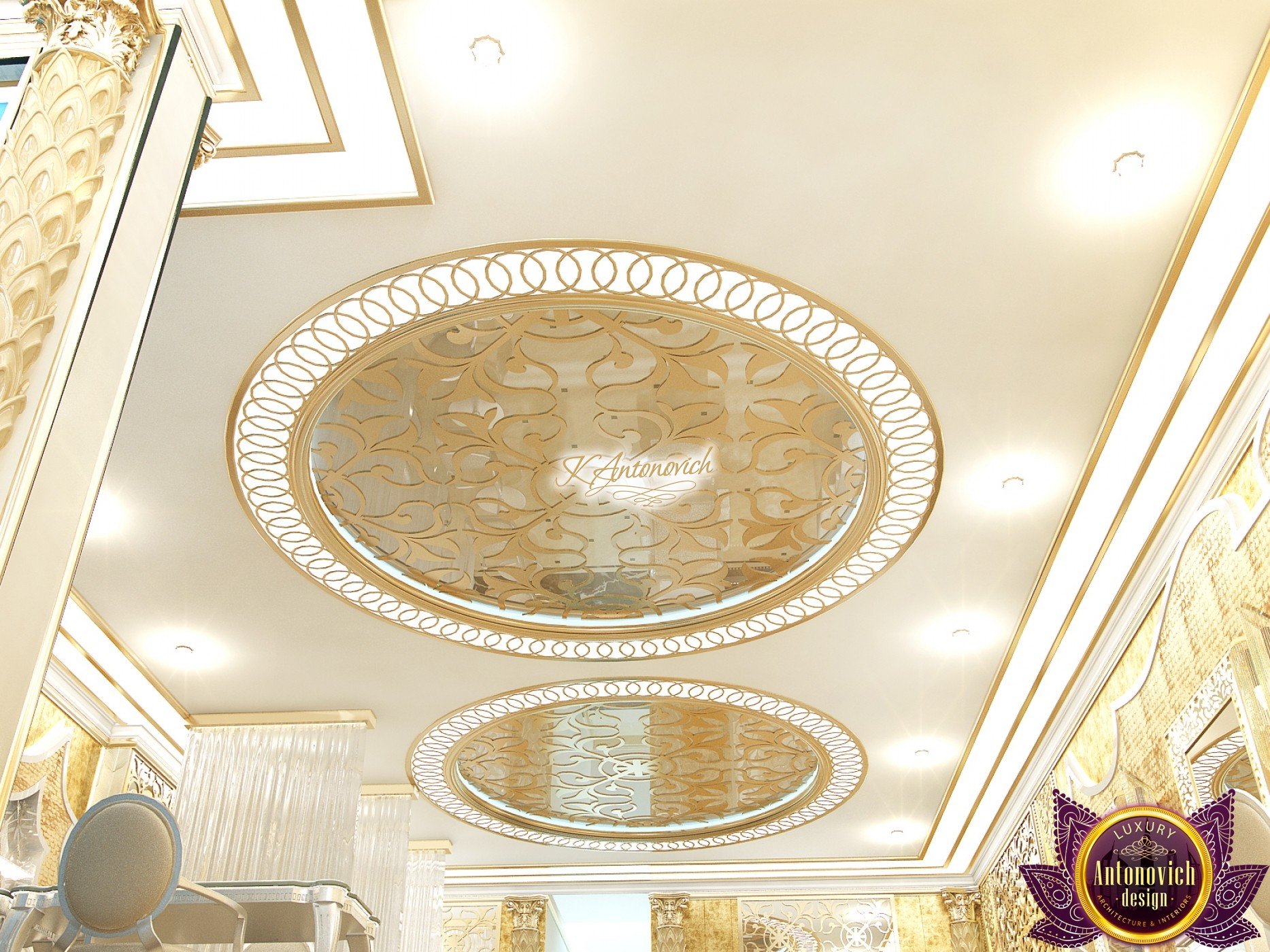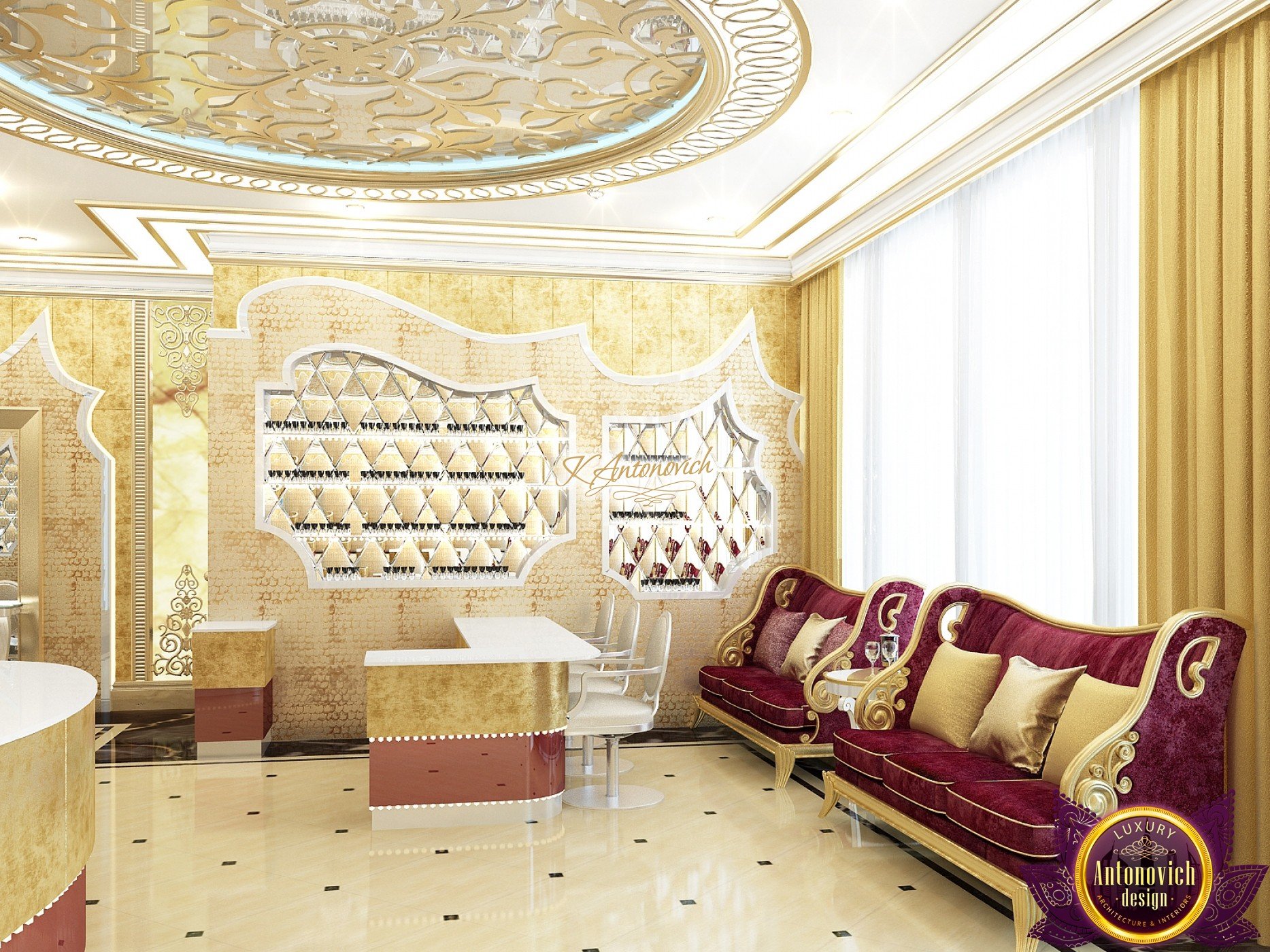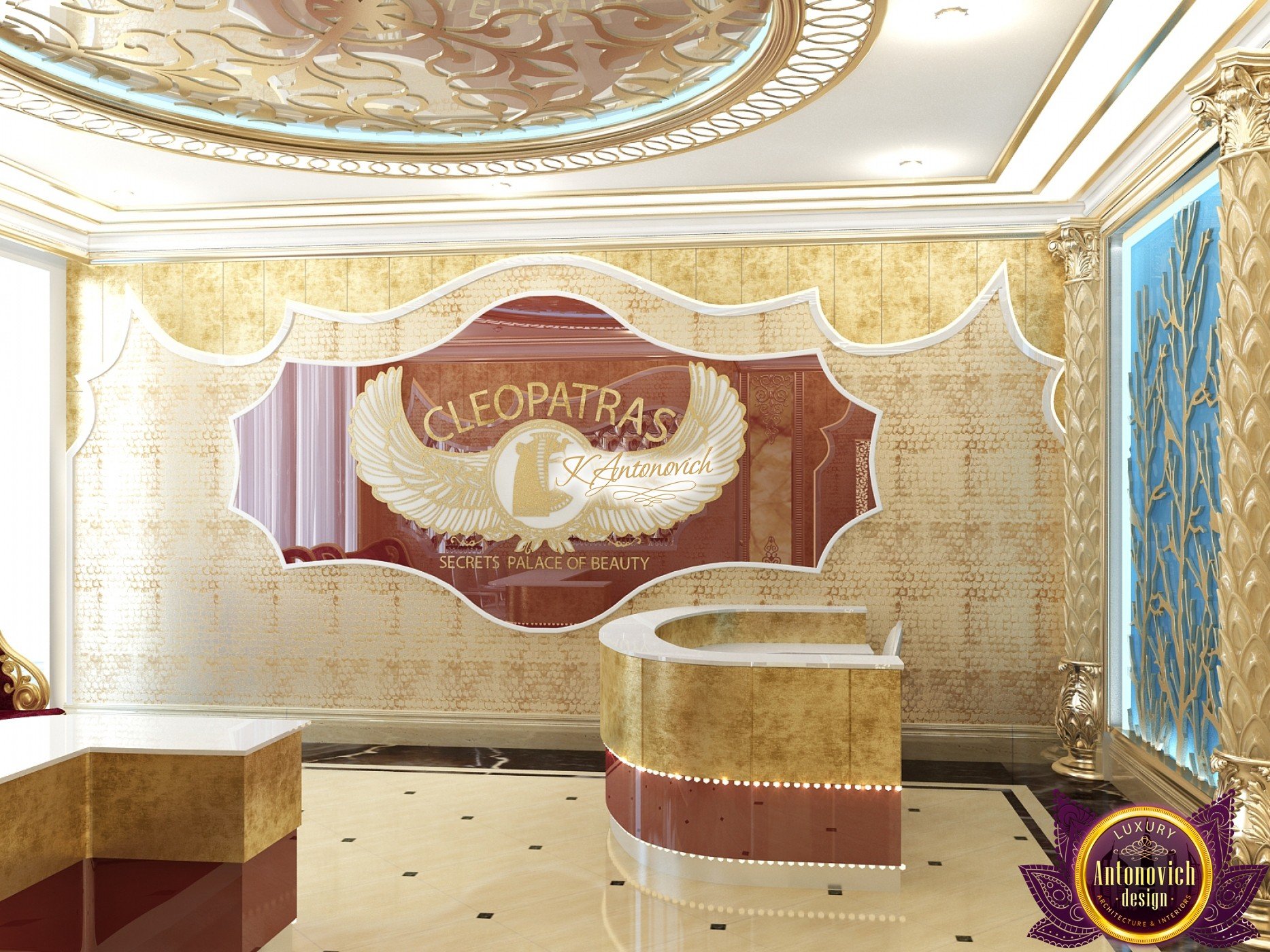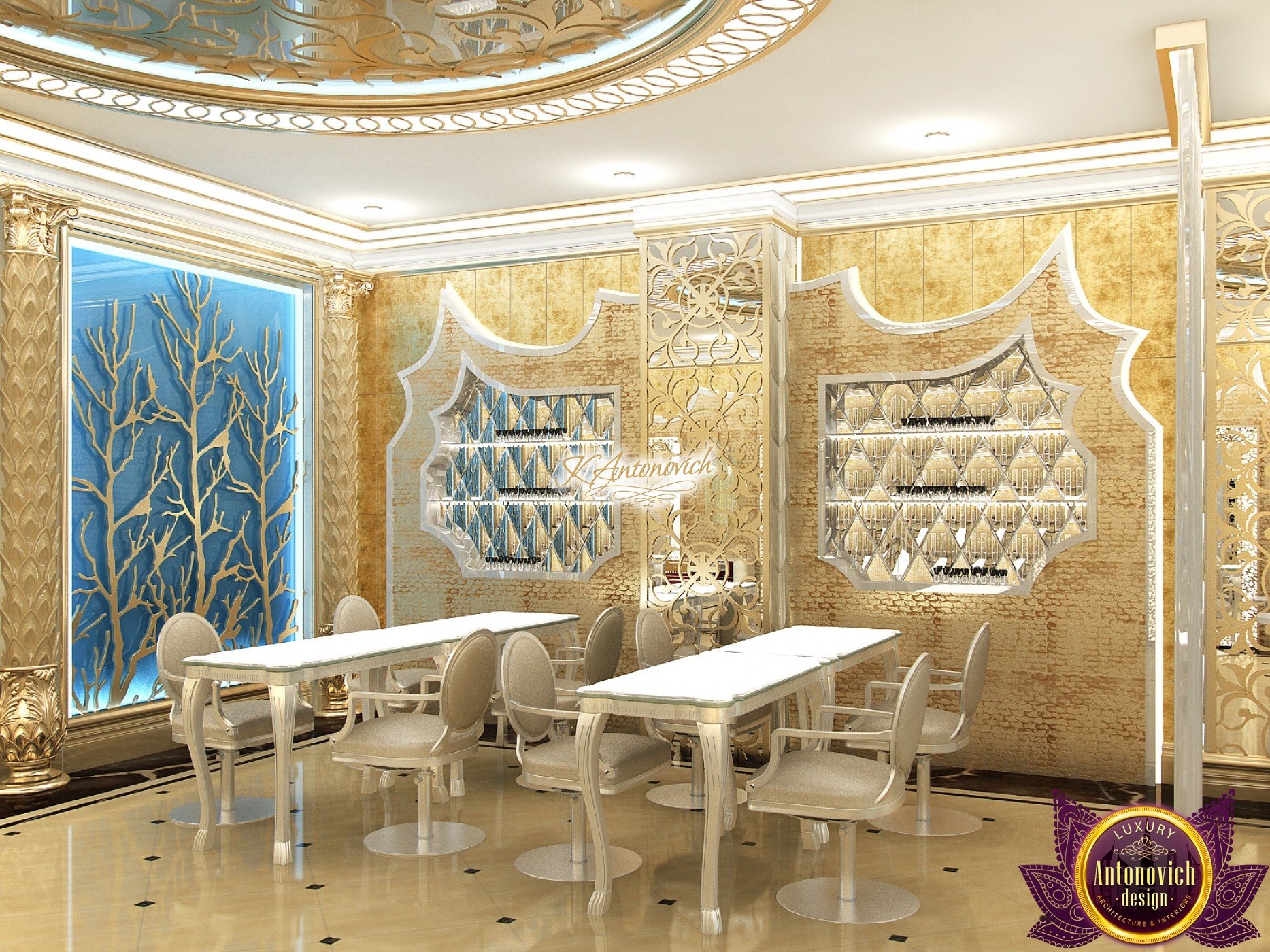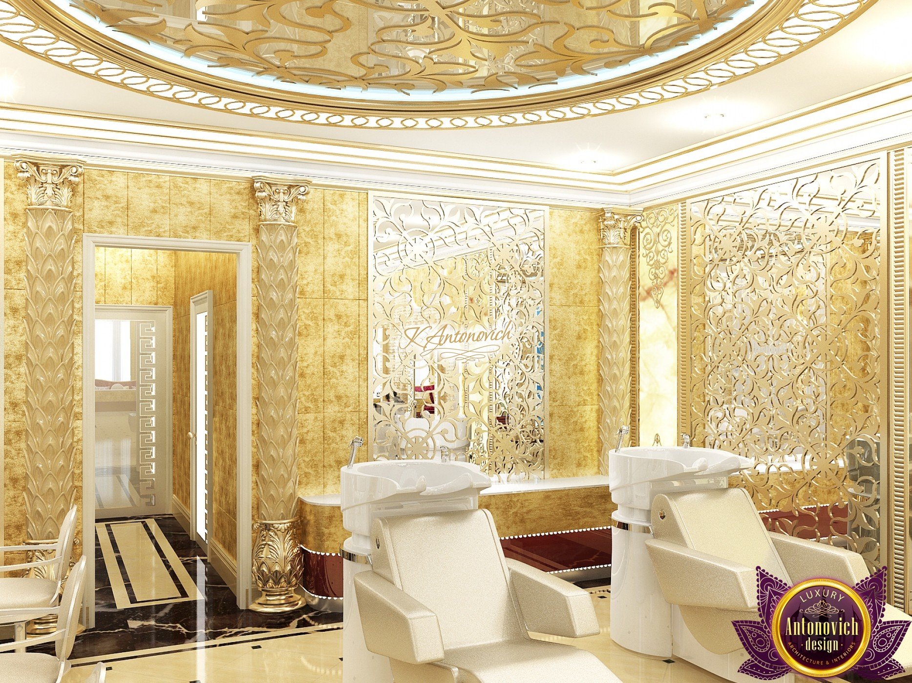 Интерьер салона красоты в Лагосе от Антонович Дизайн (Antonovich Design) прекрасно воплощает концепцию заведения, предлагающего элитные услуги. Дизайнеры стремились создать атмосферу, в которой каждая посетительница будет чувствовать себя королевой. Интерьер салона красоты арт-деко с акцентами ар-нуво отражает мотивы стилей, адаптированных к нигерийскому контексту. В качестве базовой цветовой гаммы авторы проекта предложили золотой. Золотые акценты в интерьере салона подчёркивают торжественность. Современные технологии в сочетании с творческими идеями дизайнеров студии Антонович Дизайн лежат в основе уникальной красоты интерьеров. Этот роскошный интерьер салона красоты стал ещё одним шедевром в портфолио студии и показывает, как дизайн салона красоты в Нигерии может сочетать эстетику и функциональность. Отделка потолка зеркальными панелями с деликатным золотым орнаментом визуально увеличивает пространство. Ниши с зеркалами в салоне, декоративные панели с цветочным орнаментом и декоративные пилястры и лепнина создают цельный образ. Чтобы сделать часть пространства более выразительной и одновременно зонировать его, дизайнеры использовали белую декоративную волну с мягкой подсветкой — так реализовано зонирование подсветкой в салоне красоты. Часть настенного декора — роскошные пилястры с лепестками и лепными капителями, полностью покрытые позолотой. Все эти элементы гармонично интегрированы в проект интерьера салона красоты премиум. Работая над проектом, дизайнеры учитывали технические нормы организации пространства таких салонов.