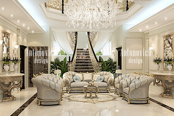 Антонович Дизайн неизменно добивается драматического эффекта через тщательное и методичное воплощение идеи. Каждая деталь лестницы становится выразительной частью общей композиции, формируя безупречную структуру элегантности. Во многих роскошных проектах на Ближнем Востоке преимущественно реализуется лестница в арабском классическом стиле, близкая по образу к викторианской классике: здесь особенно востребовано оформление лестницы в викторианском стиле и монументальные решения.
