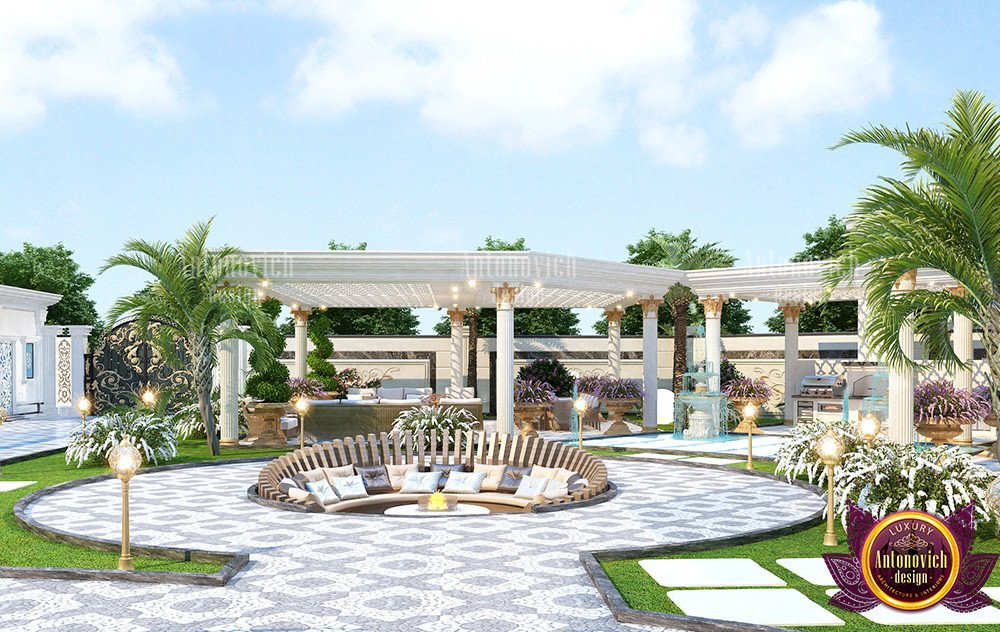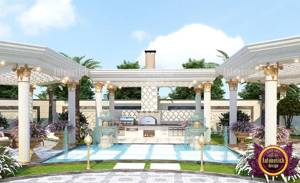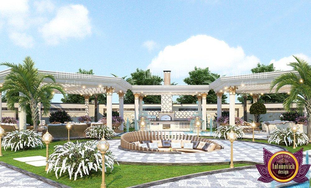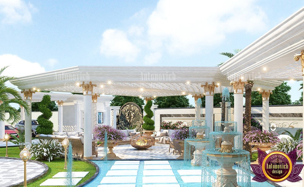 Наружная столовая зона спроектирована для большого гостеприимства: здесь подчёркивается наружный обеденный сектор для гостей, а сама планировка двора для приёмов рассчитана на большое количество людей. Оформление зоны включает скопления декоративных камней и крупный фонтан, что подчёркивает характер пространства как для отдыха, так и для мероприятий. Для оформления наружной столовой можно рассмотреть предложения люстр и мебели в Дубае.