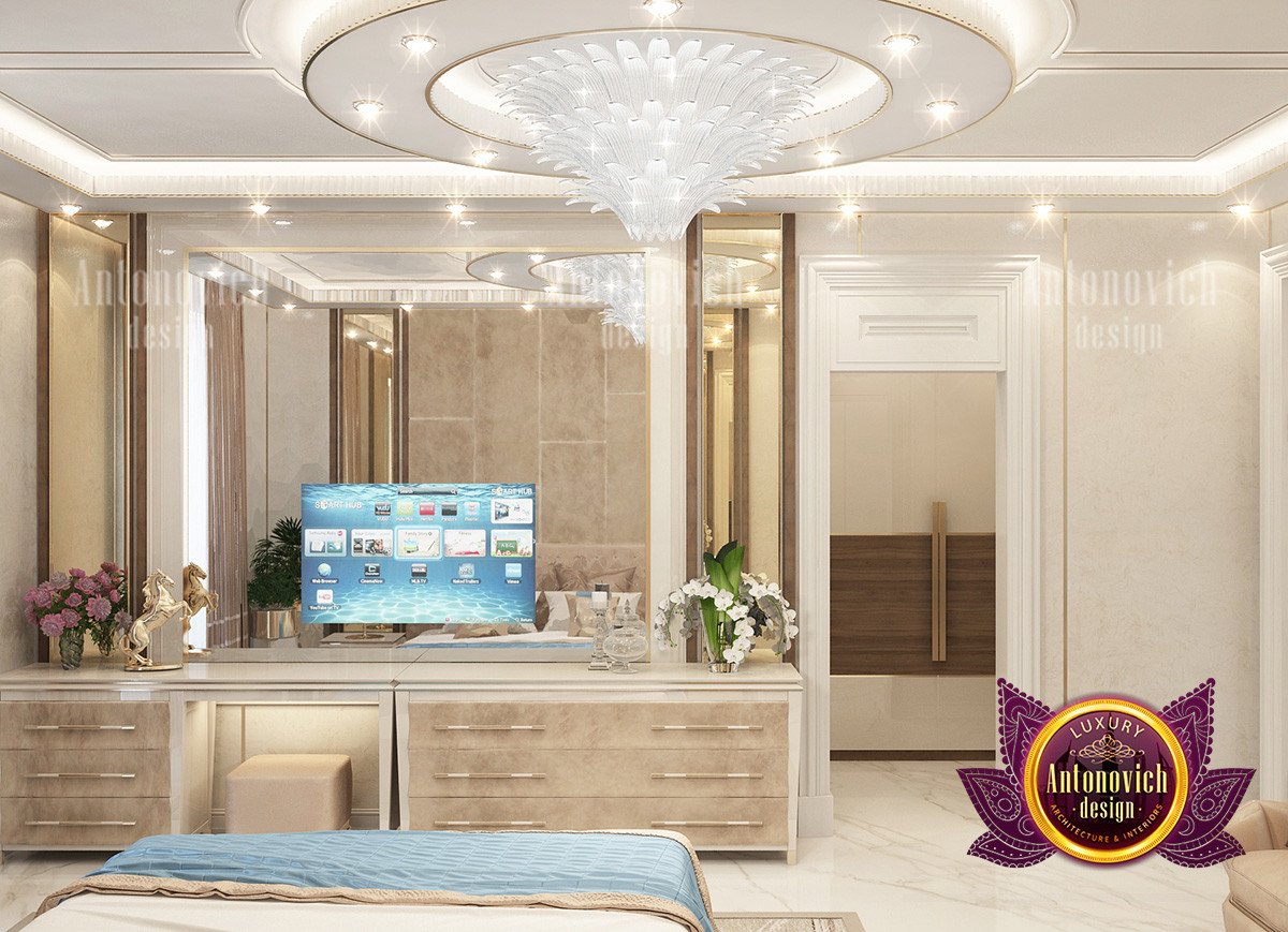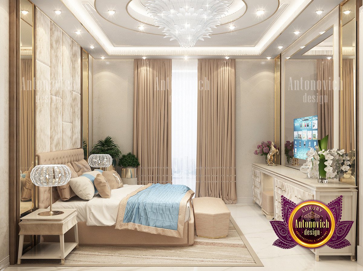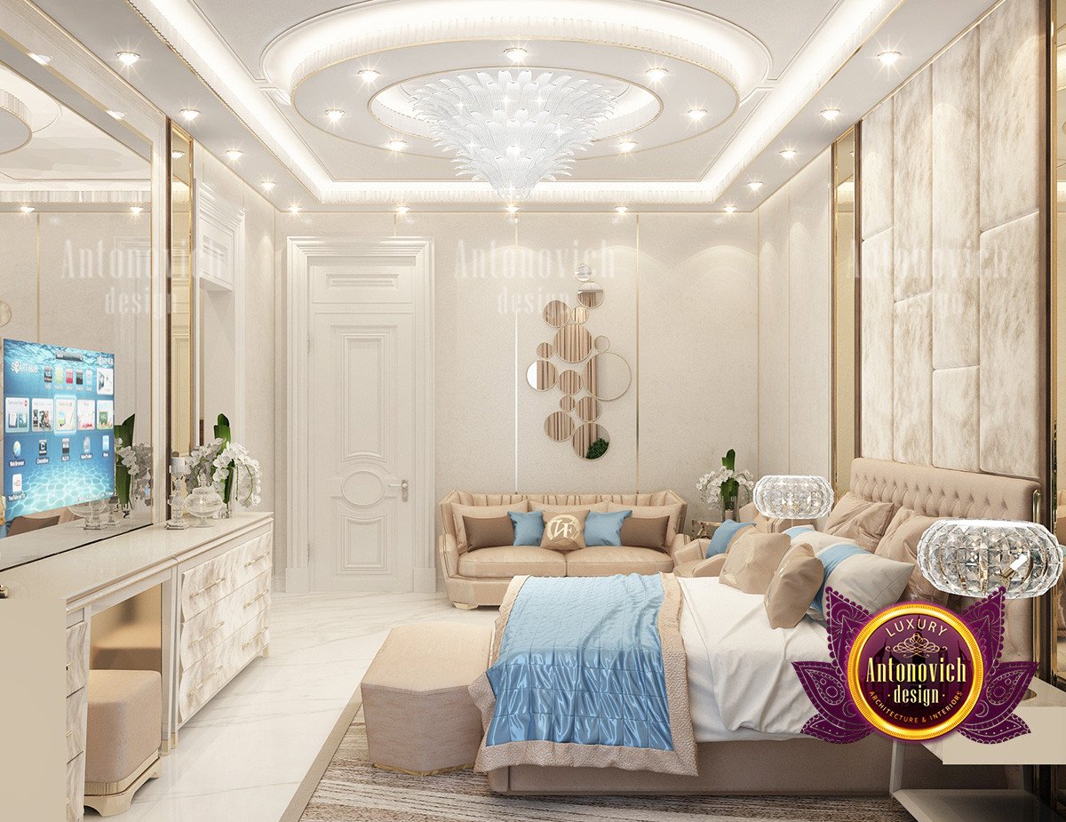 Синие, золотые и другие прекрасные элементы объединены в этом утончённом и роскошном дизайн спальни от Антонович Дизайн (Antonovich Design). Мы — создатели этой великолепной спальни и вложили все наши знания и усилия в создание лучшего дизайна спальни не только в Объединённых Арабских Эмиратах, но и по всему миру. Как лидирующая компания в Дубае, мы реализуем проекты разного масштаба: лидирующая компания в Дубае применяет строгие стандарты контроля качества. Если вы хотите роскошный дизайн спальни, вы можете связаться с нами в один клик. Посмотрите наши эксклюзивные идеи оформления спальни, чтобы подобрать концепцию под ваш дом. Мы также готовы помочь и подробно описать каждый этап, прошедший при создании этого удивительного проекта. Аналогичные приёмы используются в нашем современном дизайне кухни в Дубае, где материалы и композиция сочетаются с общим стилем жилья. Стены в этой спальне выдержаны в классическом стиле: вы оцените их простоту, чистоту и уникальную красоту. Стены дополняются не менее эффектным зеркалом за изголовьем кровати. зеркала за изголовьем кровати выполнены безупречно, они имеют форму от пола до потолка и сами по себе являются эффектной архитектурной деталью. Для отделки таких деталей используются слэбы полудрагоценных камней, которые придают интерьеру глубину и текстуру. Вы с удовольствием увидите в них свой образ дня. Главный элемент любой спальни — кровать. Кровать, специально разработанная Антонович Дизайн, великолепна. Синие и мягкие коричневые акценты прекрасно сочетаются; это сочетание синего и коричневого в спальне стало особенно популярно, и мы усилили его идеальным оттенком коричневого. Изголовье впечатляет, а мягкие акценты и декоративные подушки придают образу завершённость. Нежно-голубой цвет выглядит благородно, а белые мелкие акценты в оформлении кровати — восхитительны.