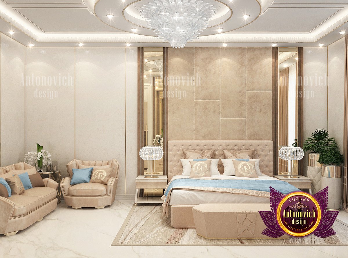 Спальня не была бы завершена без изысканных диванов и соф. Площадь рассадки в этой изящной коричнево-синей спальне продумана досконально. оформление спальни в синих тонах подчёркивает глубину и спокойствие интерьера. Диван расположен сбоку и не занимает большую часть пространства в просторной комнате. В гармонии с ним — декоративные подушки тёмно-коричневого и синего оттенков. В интерьере также есть растения, которые добавляют немного зелени в сочетание синего и коричневого в спальне; они аккуратны и не отвлекают внимания, выступая идеальным акцентом. Абажуры по бокам кровати выглядят так же привлекательно, как и остальные детали. Они соседствуют с компактными, но элегантными прикроватными тумбами. Чтобы утро было особенно прекрасным, мы добавили шторы от пола до потолка для спальни в мягком пастельном коричневом оттенке. Такая мебель для роскошной спальни и продуманная композиция делают спальню в стиле люкс по-настоящему завершённой. Для интеграции гардеробных решений мы применяем столярные решения для хозяйской гардеробной, а также предлагаем услуги по производству мебели в Дубае для точной подгонки под интерьер. Эти решения актуальны и для дизайн спальни Москва; ознакомьтесь с нашим руководством по дизайну спальни в Дубае для практических советов. Вы по достоинству оцените утончённый и великолепный интерьер этой спальни Антонович Дизайн. В контексте местных тенденций также полезно изучить тренды дизайна интерьера в ОАЭ, чтобы корректно сочетать материалы и оттенки.