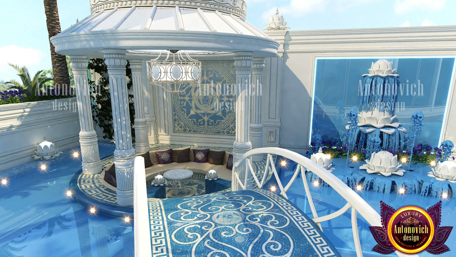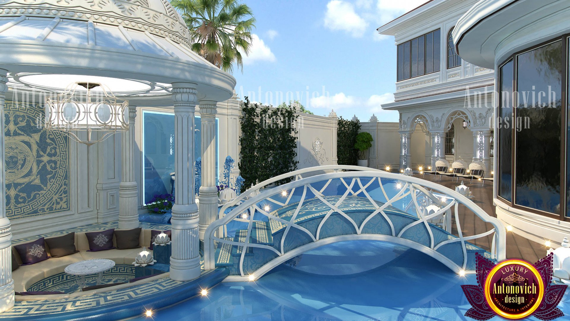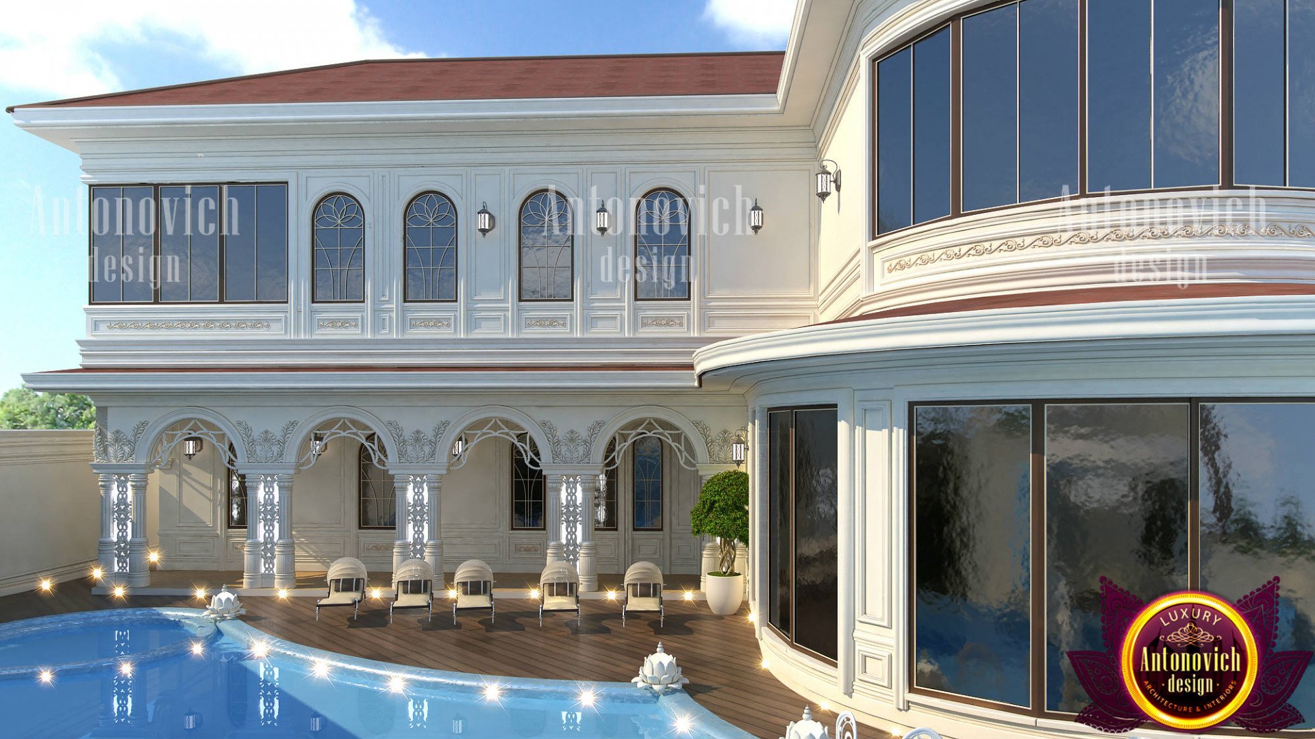 Образ этого дома формируют как архитектурный экстерьер, так и окружающее пространство: сад, двор с бассейном и зона патио в виде круглой беседки в классическом стиле с колоннами и резным декором. Каждый вариант экстерьера имеет свои особенности и правила. В этом проекте мы уделяем внимание ландшафтному дизайну вокруг дома и созданию гармоничных видов, включая экстерьер дома с бассейном и утончённые детали экстерьера с колоннами и резьбой. Особое внимание уделяется покрытию и отделке полов патио, где применяется премиальный дизайн пола для согласования с общим стилем.