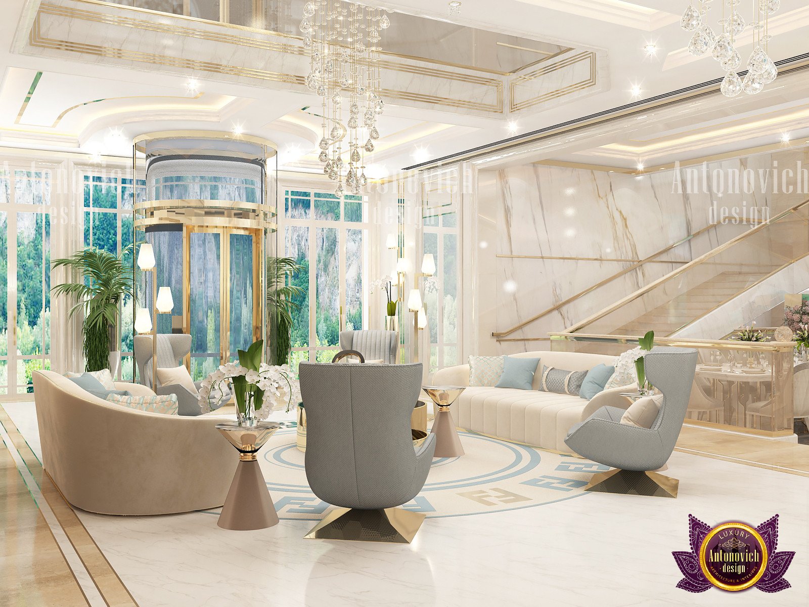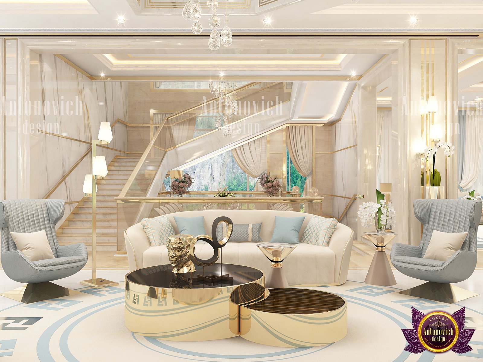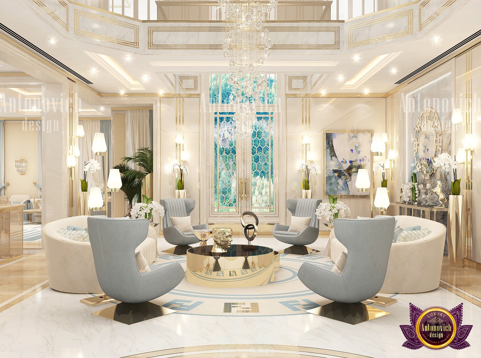 Текущий дизайн гостиной был тщательно подобран нашими дизайнерами. Кастомный диван для гостиной напоминает футуристичную капсулу роскошного кресла. Золотые геометрические узоры на стене добавляют игривую, но сдержанную деталь. В центре стоит двойной круглый кофейный стол с золотой отделкой, который усиливает общую элегантность. Концепция открытого пространства позволила учесть потребности клиентов: мрамор в интерьере делает интерьер воздушным и чётким. Мы добавили большие оконные панели для света, чтобы обеспечить естественное освещение в дневное время. Чтобы связать интерьер с экстерьером, мы предлагаем экологичный ландшафтный дизайн. Вверху подвешена кристальная люстра на заказ, выполненная специально, чтобы дополнять эстетику гостиной. Её дополняют идеи с гипсовой лепниной. От ламп и настенного искусства до зеркал и ковра — наша команда подбирает уникальные решения для того, чтобы предложить современный дизайн гостиной с динамичной и сбалансированной композицией. Мы также разрабатываем функциональные планировки кладовки.