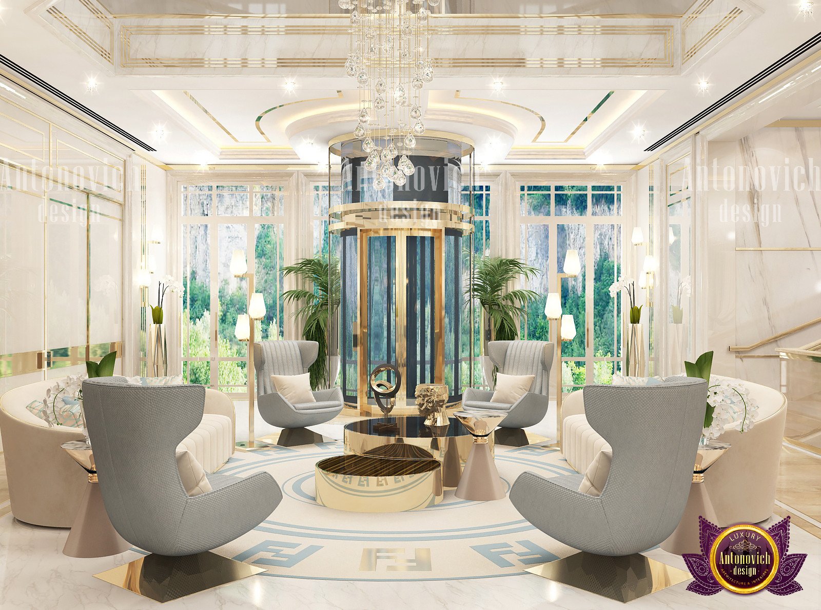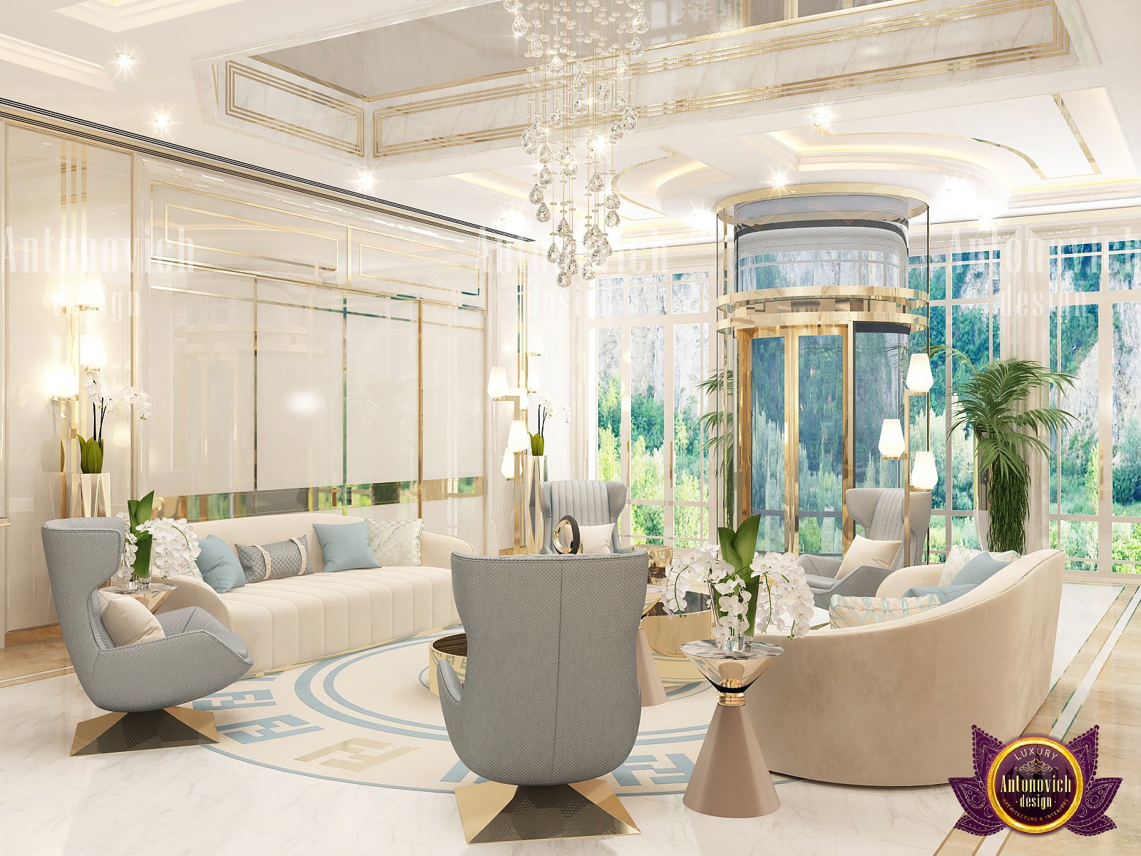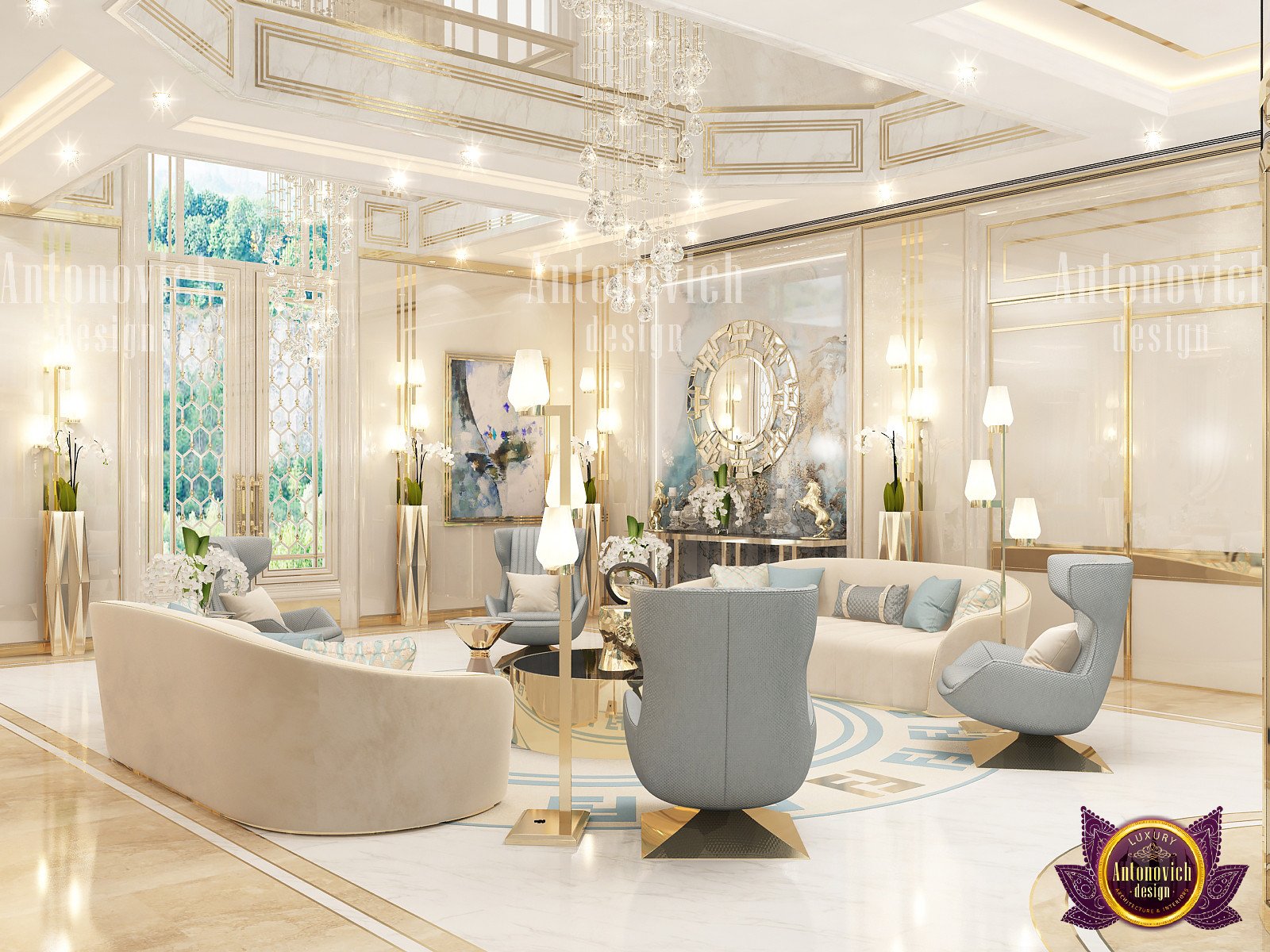 Текущий дизайн гостиной был тщательно подобран нашими дизайнерами. Кастомный диван для гостиной напоминает футуристичную капсулу роскошного кресла. Золотые геометрические узоры на стене добавляют игривую, но сдержанную деталь. В центре стоит двойной круглый кофейный стол с золотой отделкой, который усиливает общую элегантность. Концепция открытого пространства позволила учесть потребности клиентов: мрамор в интерьере делает интерьер воздушным и чётким. Мы добавили большие оконные панели для света, чтобы обеспечить естественное освещение в дневное время. Чтобы связать интерьер с экстерьером, мы предлагаем экологичный ландшафтный дизайн. Вверху подвешена кристальная люстра на заказ, выполненная специально, чтобы дополнять эстетику гостиной. Её дополняют идеи с гипсовой лепниной. От ламп и настенного искусства до зеркал и ковра — наша команда подбирает уникальные решения для того, чтобы предложить современный дизайн гостиной с динамичной и сбалансированной композицией. Мы также разрабатываем функциональные планировки кладовки.