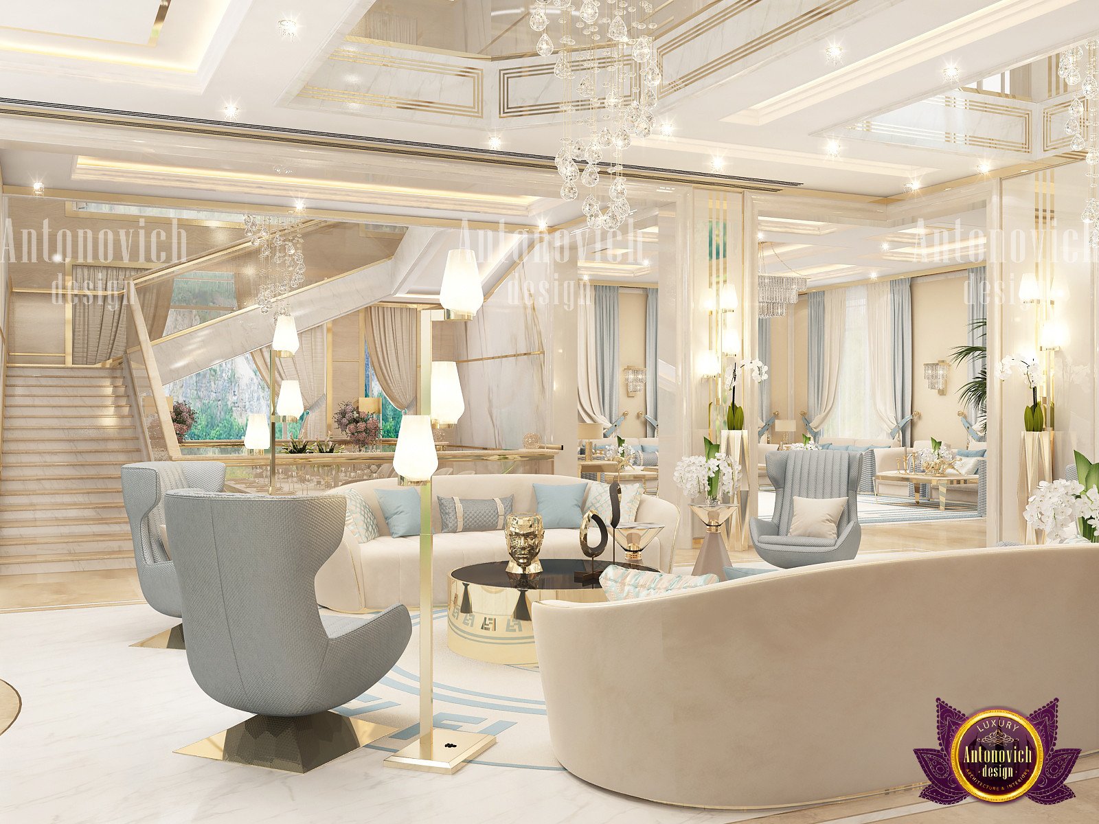 В последние годы пастельные оттенки уверенно возвращаются в дизайн — пастельные тона в интерьере делают пространство современным и мягким. Наши дизайнеры предложили смелый акцент, гармонирующий с пастелью, чтобы интерьер выглядел более модным и современным, но не чрезмерно сладким. Нежная пастельная гамма использована в отделке стен и элементах, а золотые акценты в гостиной придают металлизированное сияние, делая пространство ярче и изящнее. Для любителей традиционной эстетики есть варианты гостиная в классическом стиле. Нейтральная и синяя обивка сочетается с пышными декоративными подушками, а мягкие голубые и бежевые тона в текстиле создают тёплый, привлекательный эффект. В этой работе мы объединили нейтральные стены и полы с золотыми деталями и синими акцентами, формируя дизайн гостиной с золотом.