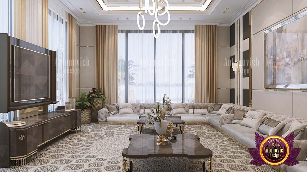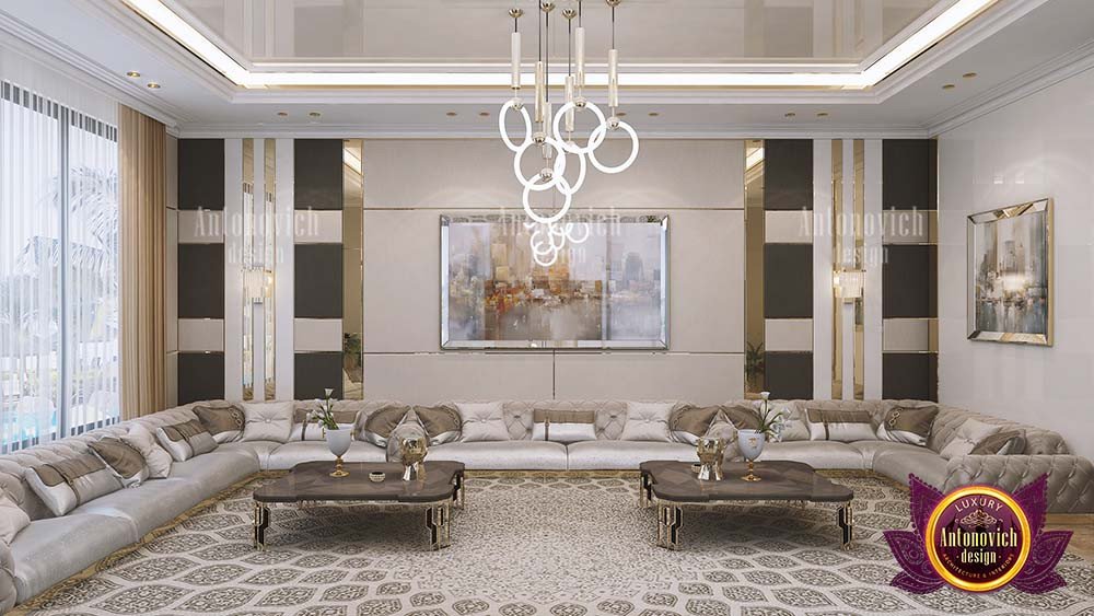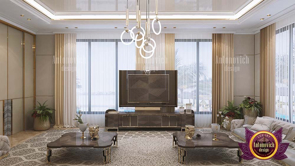 Эта семейная зона отдыха впечатляет — она даёт семье достаточно пространства для общения и полноценного времяпрепровождения. Здесь установлены большие стеклянные панели, связывающие комнату с верандой. В таких проектах часто учитывают водные элементы — интерьер виллы с бассейном. Гостиная выполнена в роскошном стиле. Для взыскательной семьи, стремящейся к благородству и уникальности, золото — удачный приём. С Антонович Дизайн (Antonovich Design) вы получите пространство, которое одновременно роскошно, изысканно, современно и эргономично. Наши услуги включают самые тонкие решения в индустрии дизайна интерьера и дизайн кухни в ОАЭ. Антонович Дизайн остаётся приоритетом в сфере интерьерного проектирования. Лучшие образцы роскошного дизайна гостиной созданы для вас и вашей семьи. Наше мастерство в оформлении интерьеров — высочайшего уровня. Созданные нами проекты качественны, и мы гарантируем удовлетворённость клиентов. Мы предлагаем дизайн гостиной. Мы предлагаем роскошный дизайн гостиной, интерьер гостиной в стиле люкс, проект роскошной гостиной, дизайн уютной семейной гостиной и индивидуальный дизайн гостиной под ключ.