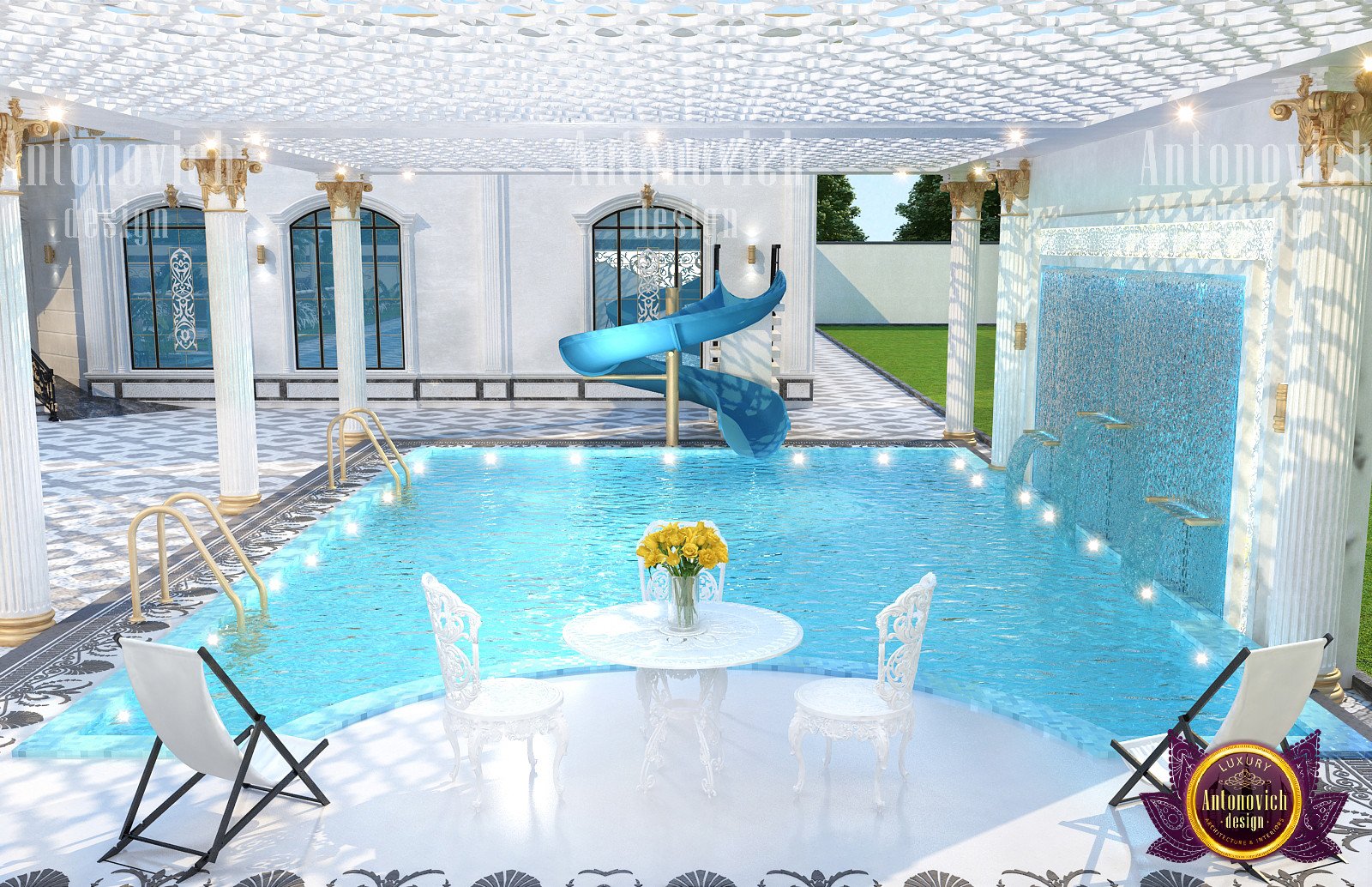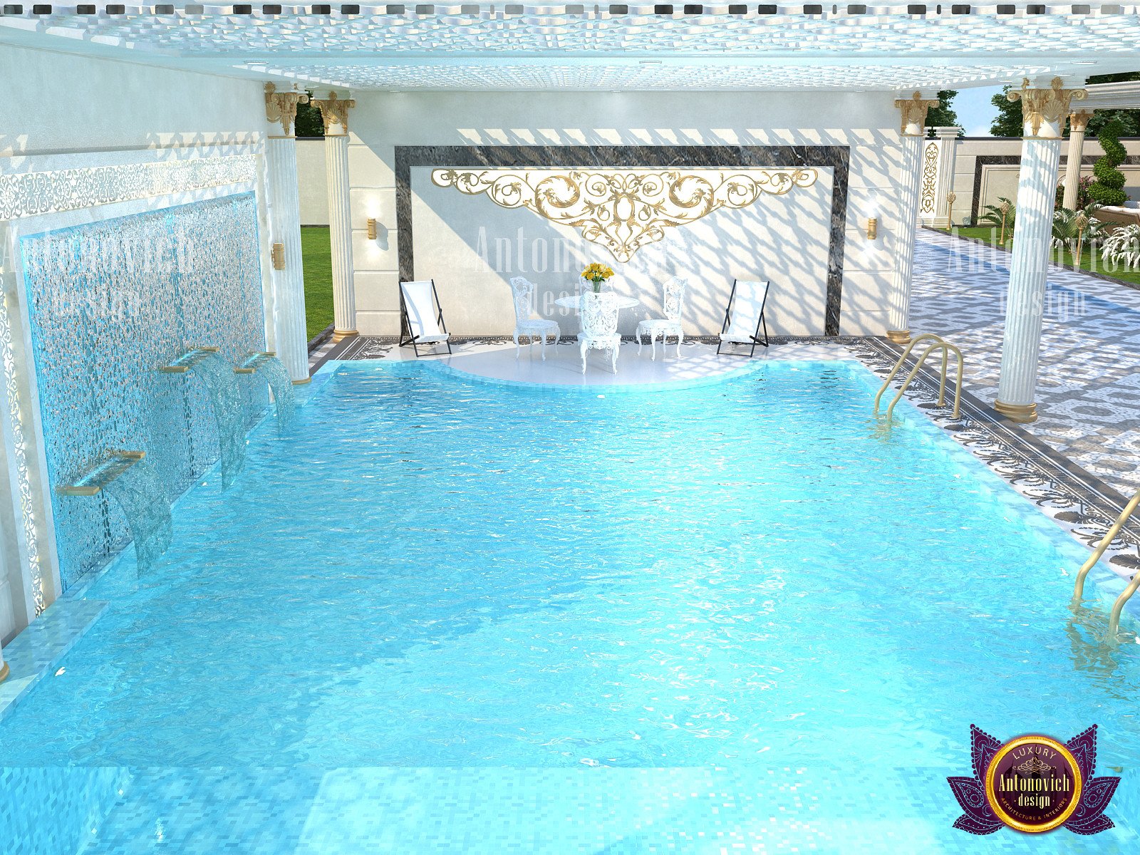 - Дизайн: зона бассейна теряет смысл без единой эстетической темы. В этом проекте бассейн выдержан в неоклассическом средиземноморском стиле — неоклассический дизайн бассейна и неоклассический средиземноморский бассейн выглядят одновременно классически и актуально. Для похожей эстетики см. дизайн интерьера дома в французском стиле.