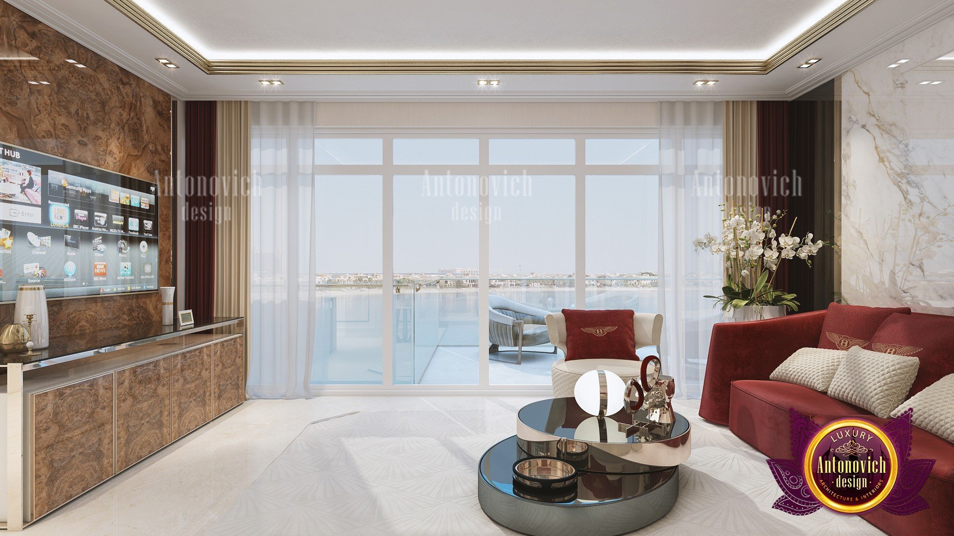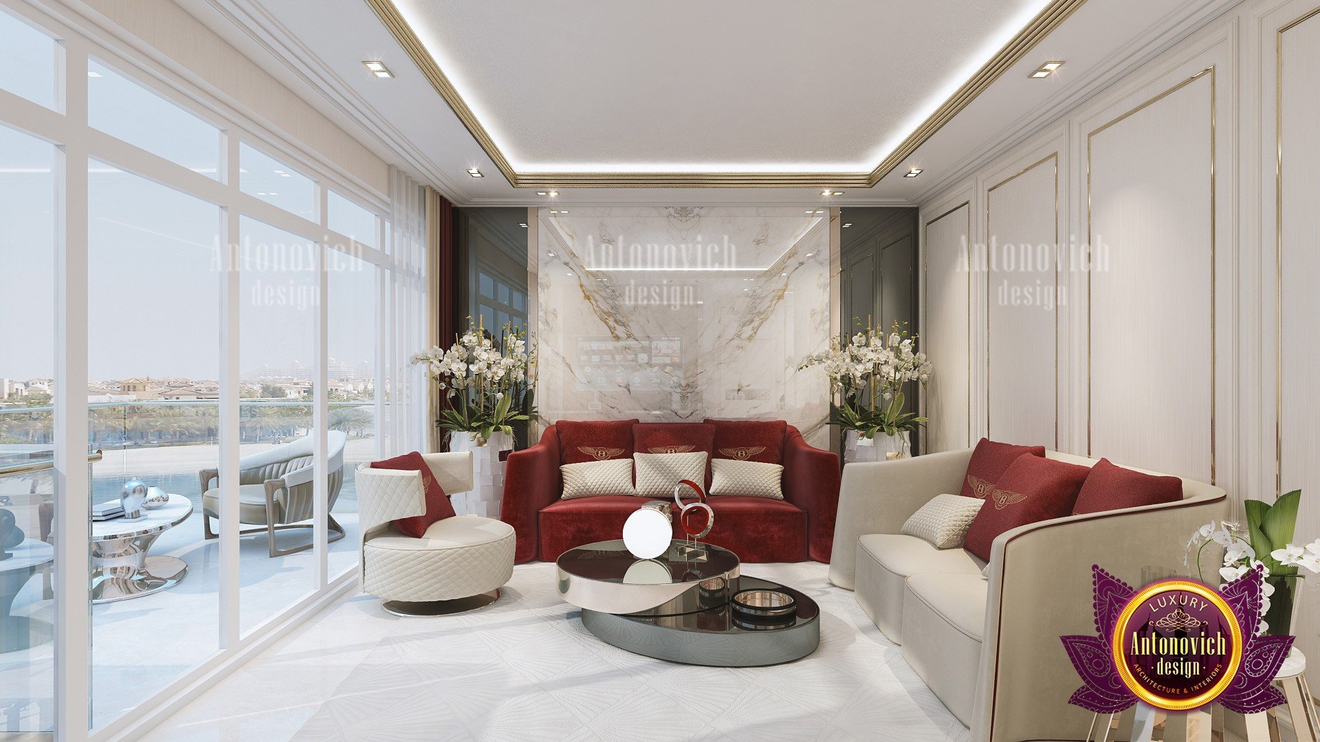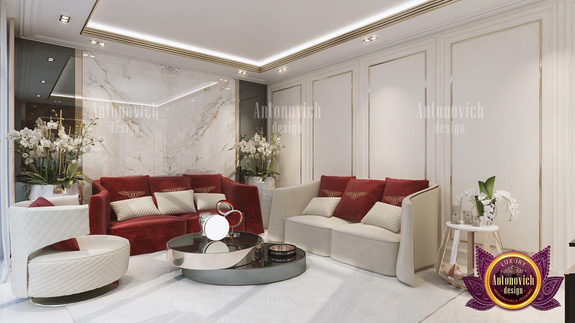 Эта просторная семейная гостиная особенно примечательна тем, что обеспечивает семье достаточно места для общения и отдыха. Это уютная семейная гостиная с большими стеклянными панелями, которые соединяются с верандой — по сути, просторная гостиная с верандой. Центр композиции — изящный журнальный стол, рядом стоит крупная лампа. Стены подчёркивают красные диваны, а мраморные детали интерьера впечатляют; по бокам — серебряные акценты в декоре. Ваш дом — ваше счастливое место, и мы стремимся создать для вас и вашей семьи лучшее пространство. С Антонович Дизайн (Antonovich Design) вы получите роскошное, изысканное и современное решение — современный и эргономичный интерьер гостиной, где комфорт сочетается с эстетикой. Мы гибки в условиях сотрудничества и поможем вам подобрать желаемый образ и атмосферу дома. Наши услуги — одни из самых тщательных в индустрии дизайна интерьера! Мы предоставляем лучшие решения в области интерьерного дизайна в Азии, Африке и Америке. Посмотрите наш проект великолепной гостиной. Также мы работаем над зарубежными проектами, включая дизайн интерьера Мальдив. Антонович Дизайн остаётся приоритетом в мире архитектуры и дизайна интерьеров. Архитектура и интерьер — наша сфера. Лучшие роскошные решения для дизайна роскошной гостиной доступны для вас и вашей семьи. Наша экспертиза по интерьеру семейной гостиной входит в число ведущих в мире; мы создаём качественные проекты и заботимся о том, чтобы клиенты были довольны.