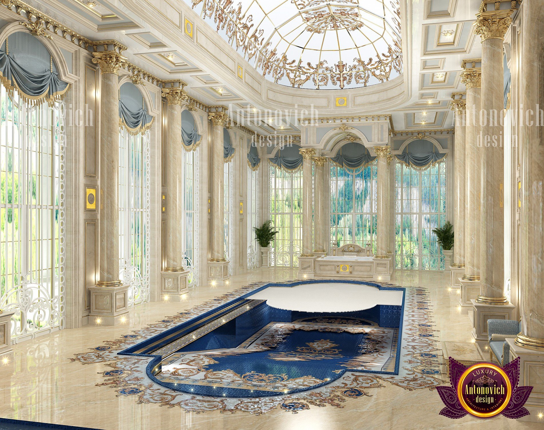 - Flooring: Напольное покрытие выполнено из мрамора с декоративными узорами и инкрустациями — инкрустированные цветочные мотивы добавляют пышности дизайну. Материалы для крытого бассейна мрамор плитка; мы также разрабатываем дизайн ванных комнат с подобным подбором материалов.