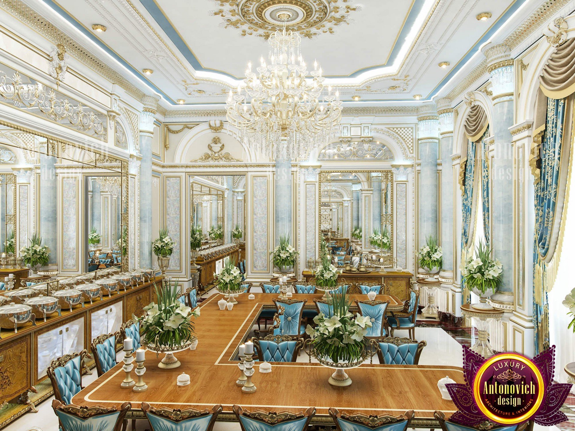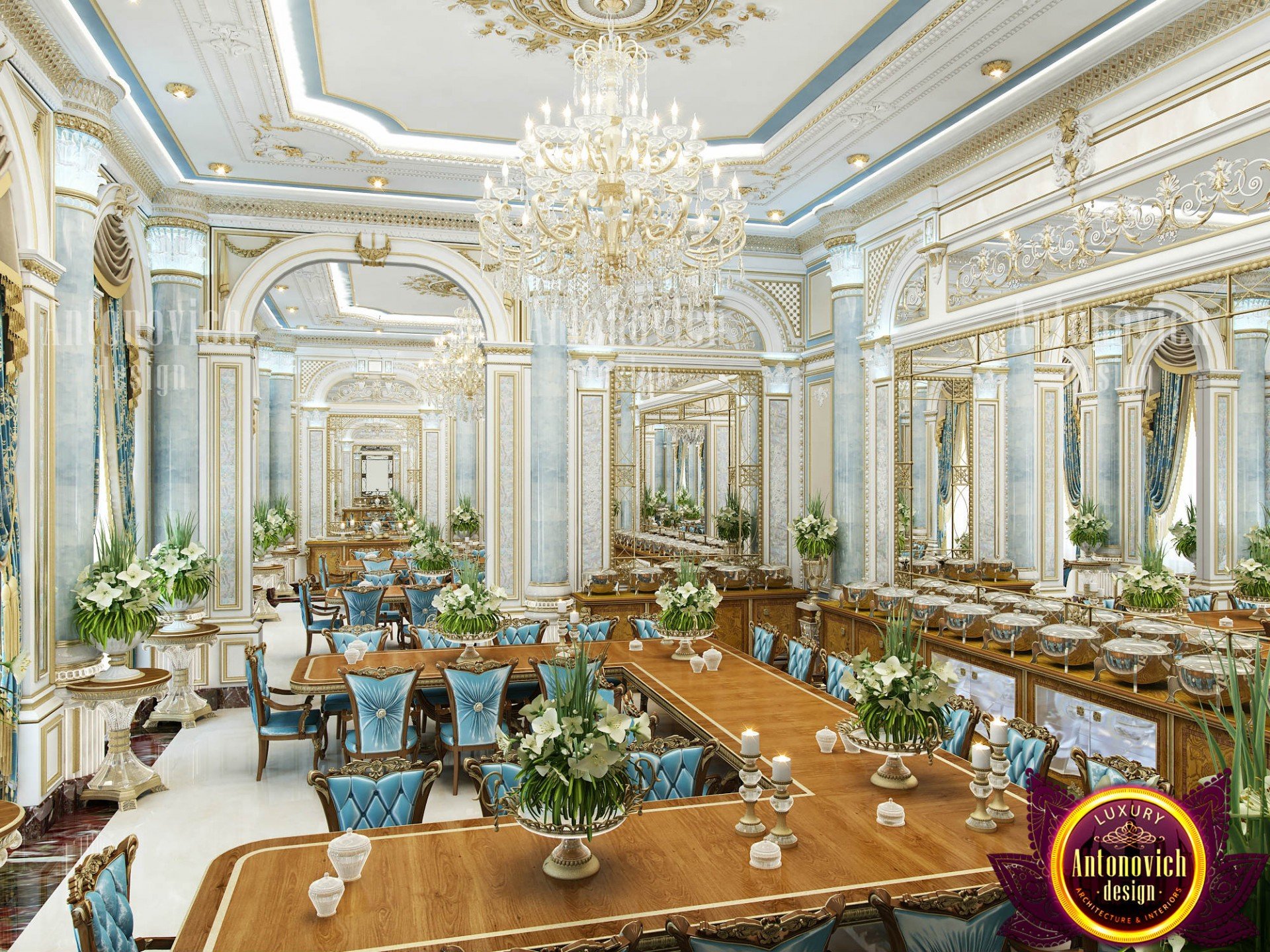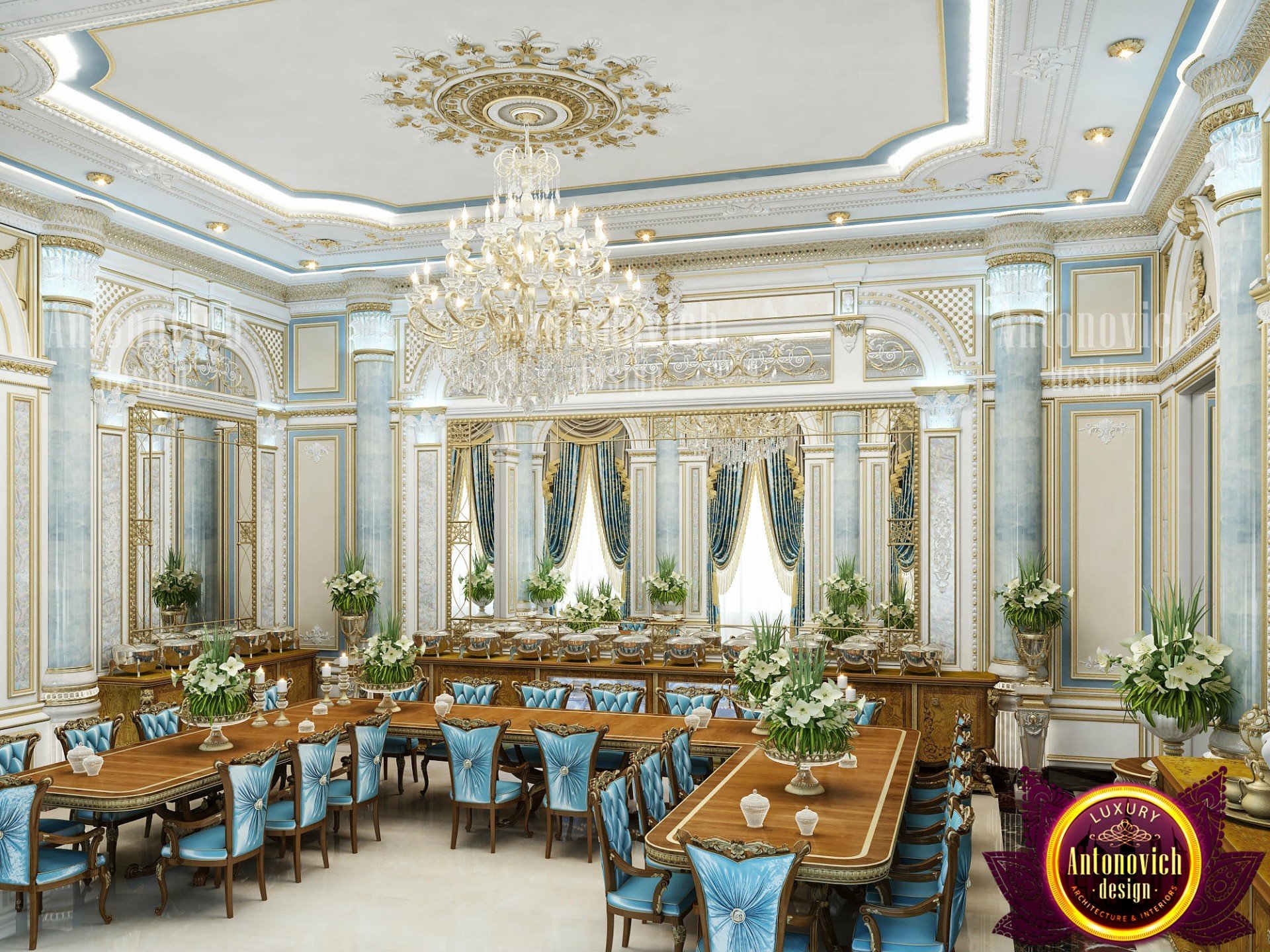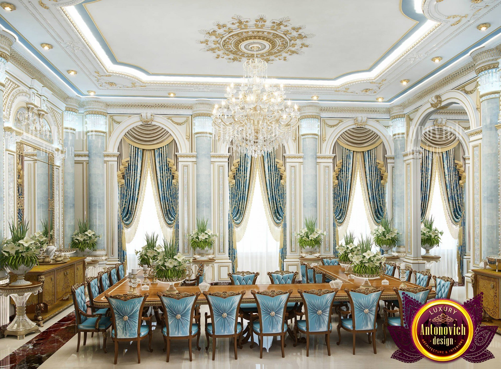 Поскольку конфигурация столовой часто сложна, наши дизайнеры уравновешивают это декоративными элементами и продуманной палитрой. Главное в этом — планировка столовой и декор. Многослойная цветовая гамма задаёт атмосферу, не концентрируясь на одном оттенке: королевский синий в интерьере стал объединяющим тоном. Множество окон, украшенных жаккардовые портьеры с золочением, подхватами и ламбрекенами, наполняют пространство приятным естественным светом и акцентируют внимание на каждой детали дорогого декора; иногда мы опираемся на решения из проектов, таких как интерьер спальни для молодой девушки, чтобы подобрать ткани и фактуры.