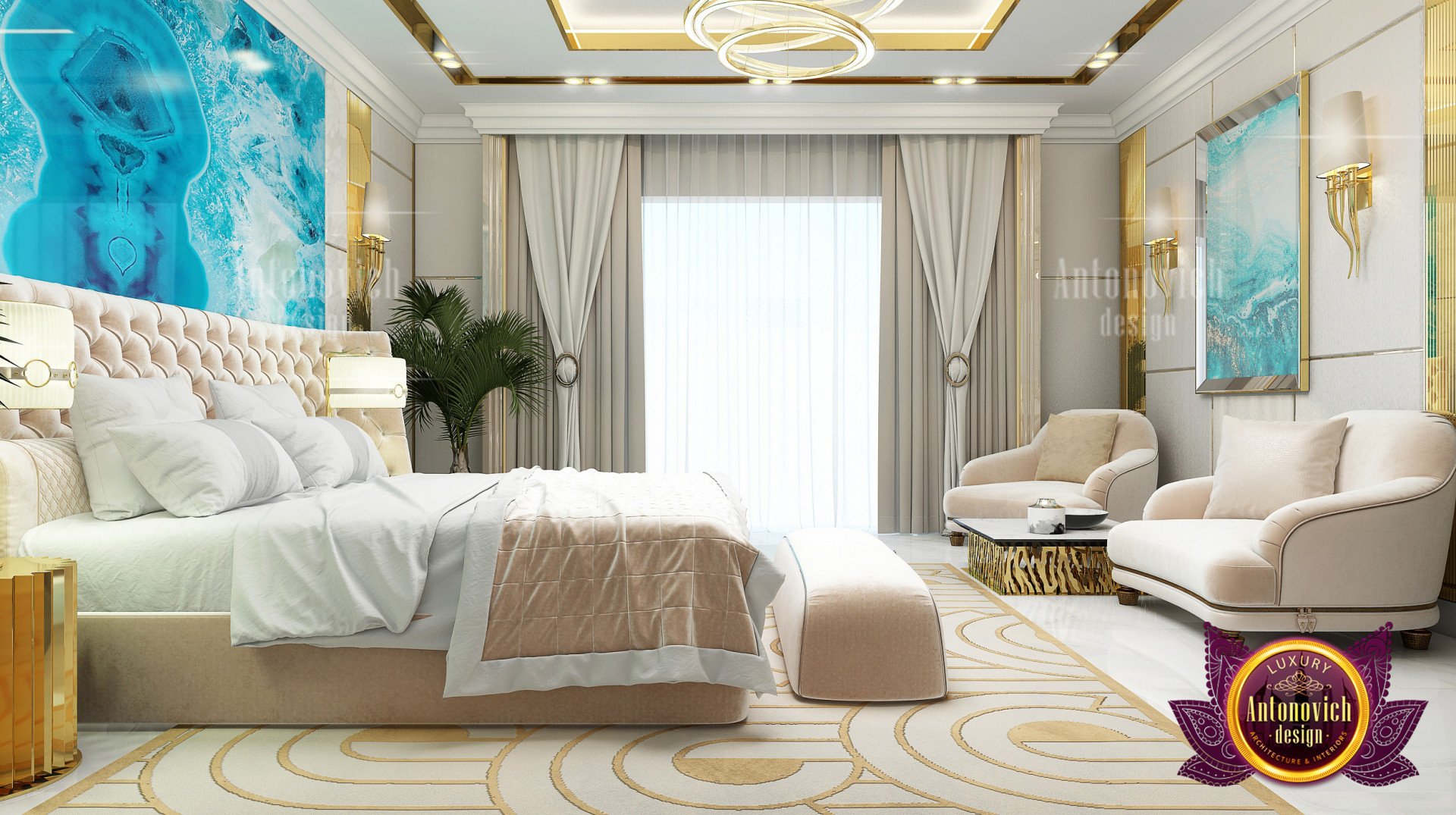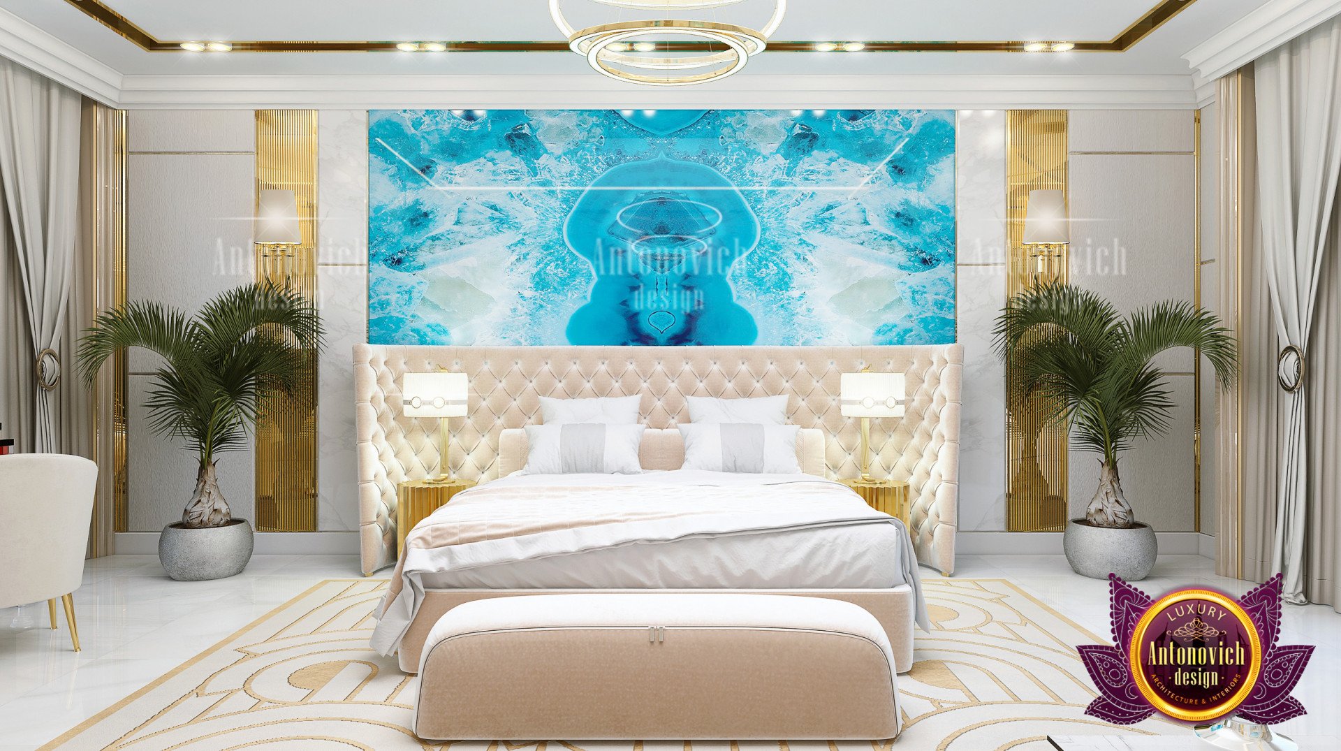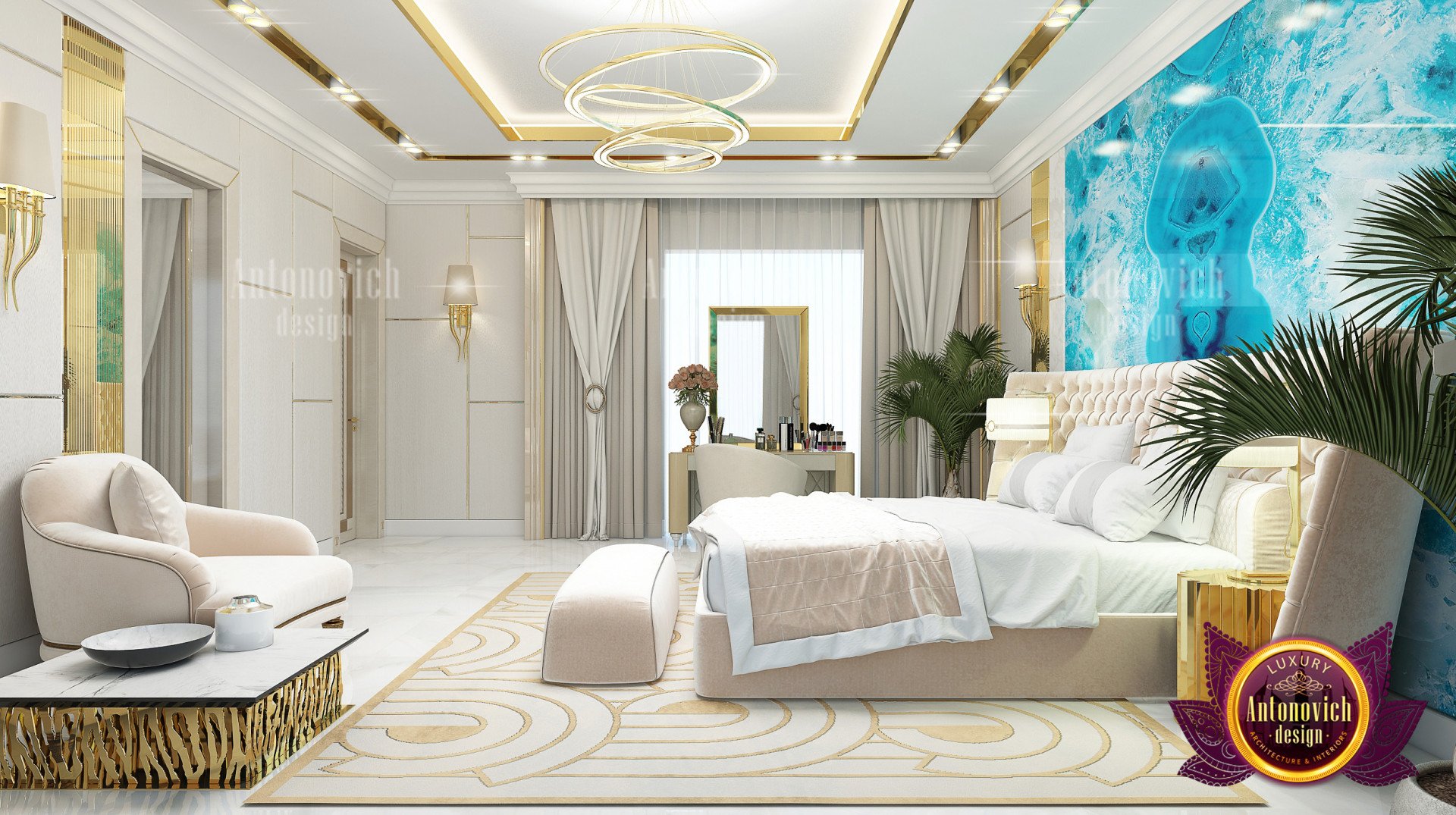 С Антонович Дизайн (Antonovich Design) мы создаём продуманное пространство, где благородные оттенки, тонкая роскошь, ощущение простора и безупречная стилистика подчёркивают красоту интерьера — тёплого и одновременно изысканного. В этом проекте представлен роскошный интерьер спальни, в котором дизайн спальни с синим и золотым акцентом оживляет нейтральную палитру и подчёркивает, что это тропическая спальня в стиле люкс. В основе — интерьер спальни с большой кроватью, которая служит центром комфорта в дорогой отделке. Для завершения образа выбрано освещение для спальни люкс, а в оформлении использовано мягкое изголовье для спальни. В других проектах мы создаём и кухни — стильный дизайн роскошной кухни.