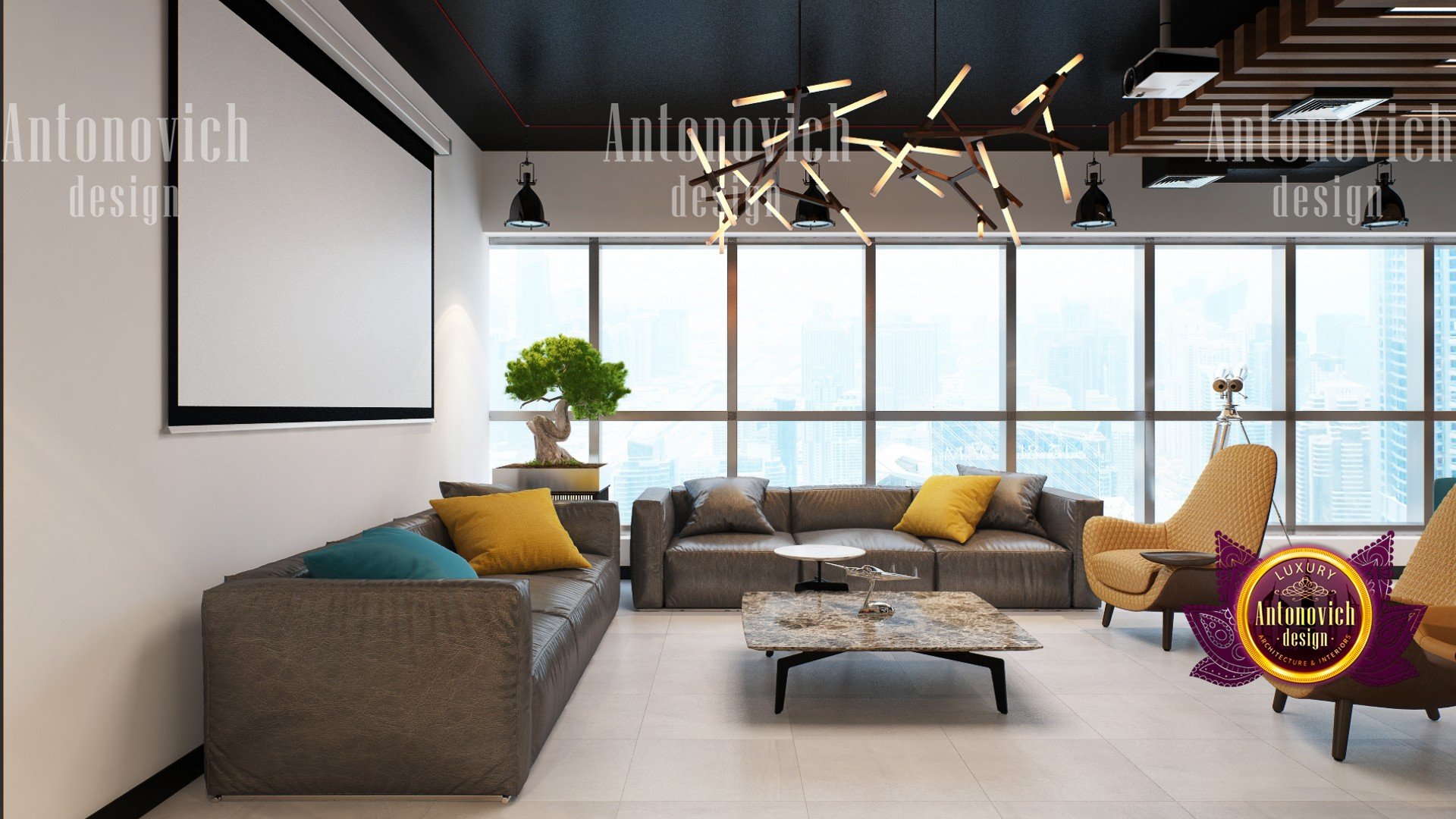 - Акцентный стиль — в оформление мы обязательно вносим нашу роскошную подпись. Как видно на модели, в центре комнаты размещена современная люстра, которая становится визуальным центром и делает пространство более притягательным и гармоничным. Это простой приём, чтобы офис выглядел привлекательнее.