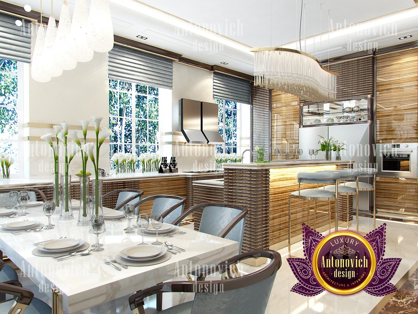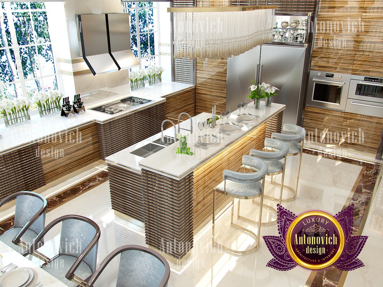 Эта кухня — пример современный дизайн кухни, остающийся тёплым и гостеприимным. Использование натуральных материалов в интерьере, таких как дерево, создаёт более деревенский, но изысканный характер. Мраморная отделка пола обеспечивает практичное, простое в уходе покрытие — идеальное для активной кухни. Дерево подчёркивает золотые и белые оттенки стен, придавая пространству вечную и ненавязчивую элегантность. Компания продумала сочетание мрамора и дерева, чтобы обеспечить более сбалансированный стиль для дома. Привлекательность кухни усиливается за счёт открытого острова — кухня с островом в современном стиле часто становится центром оформления и общения в доме.