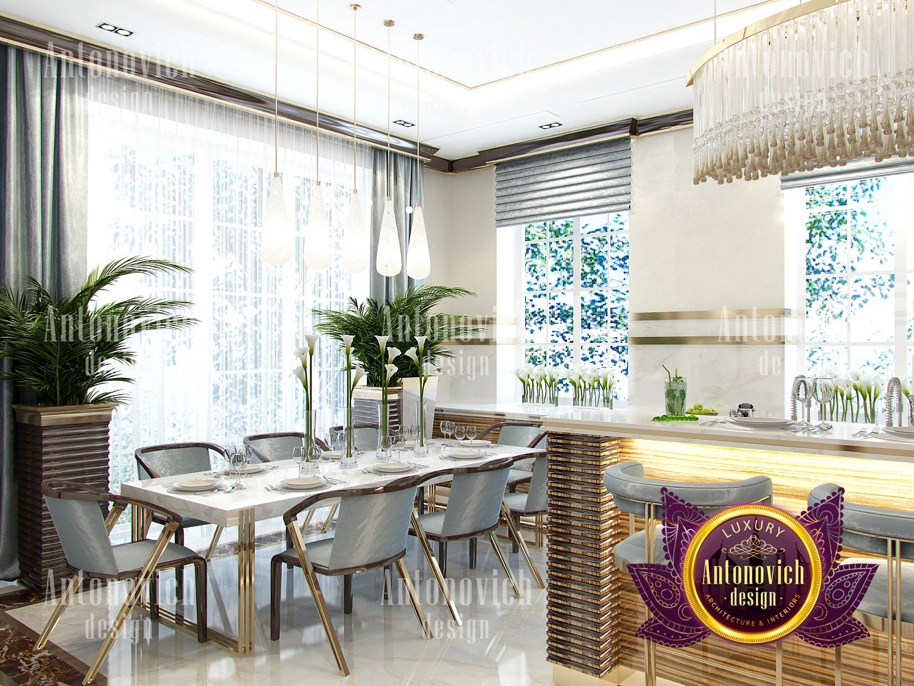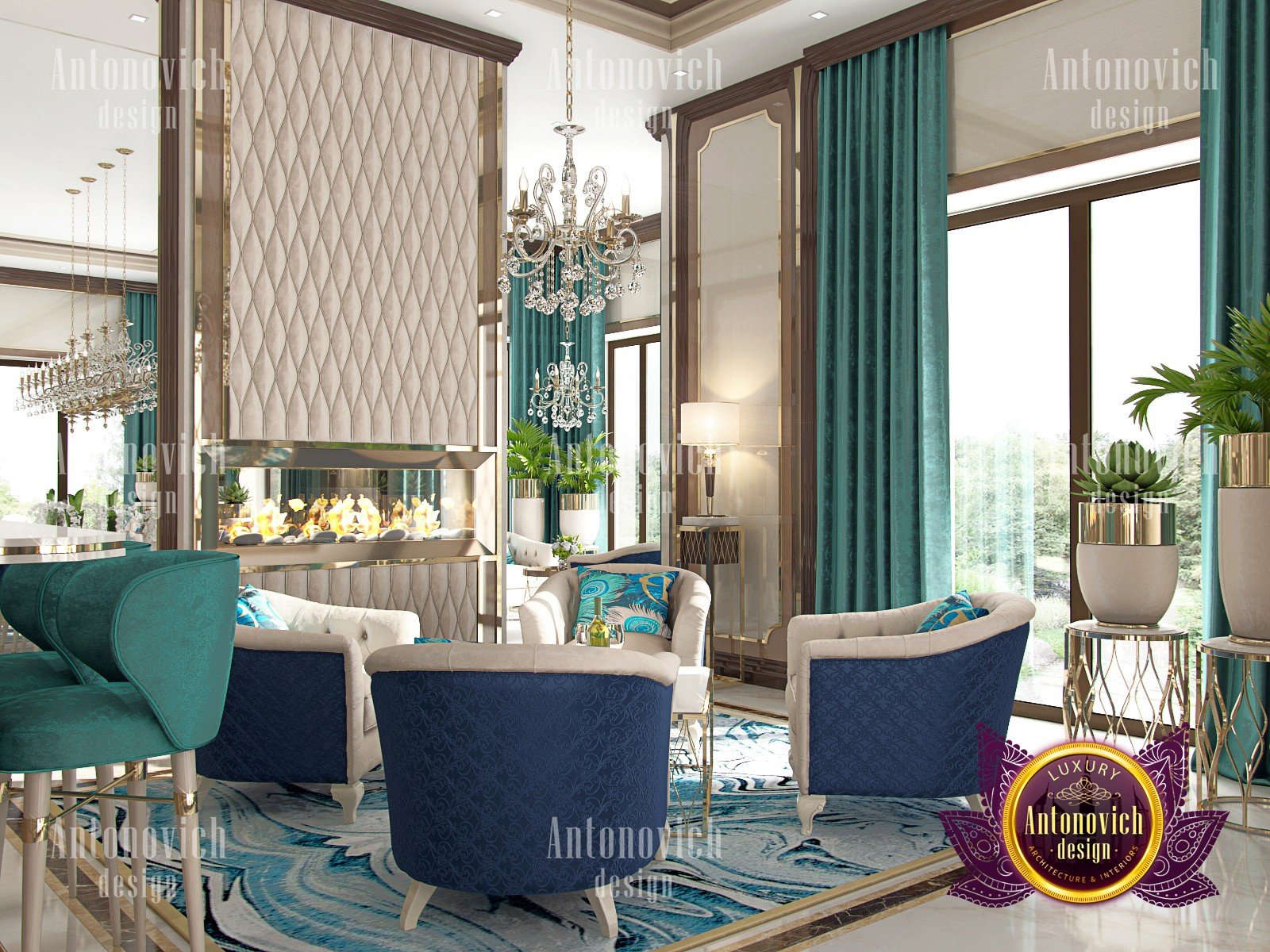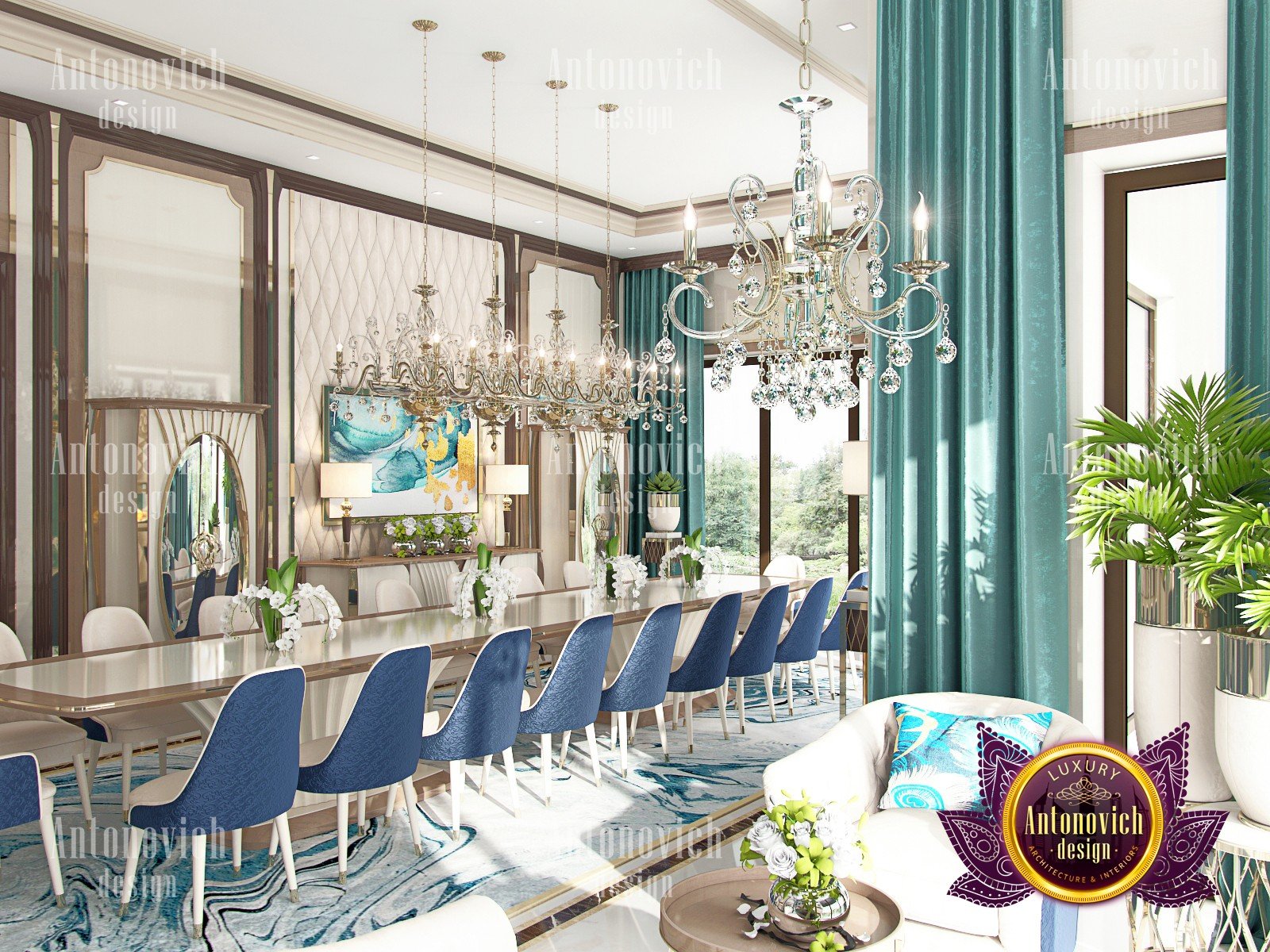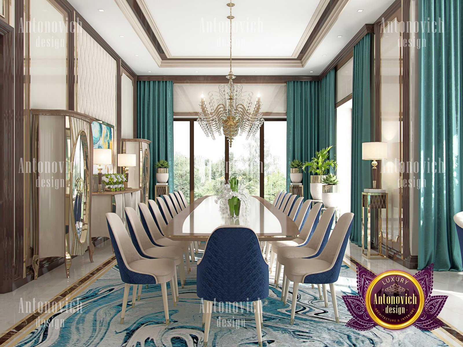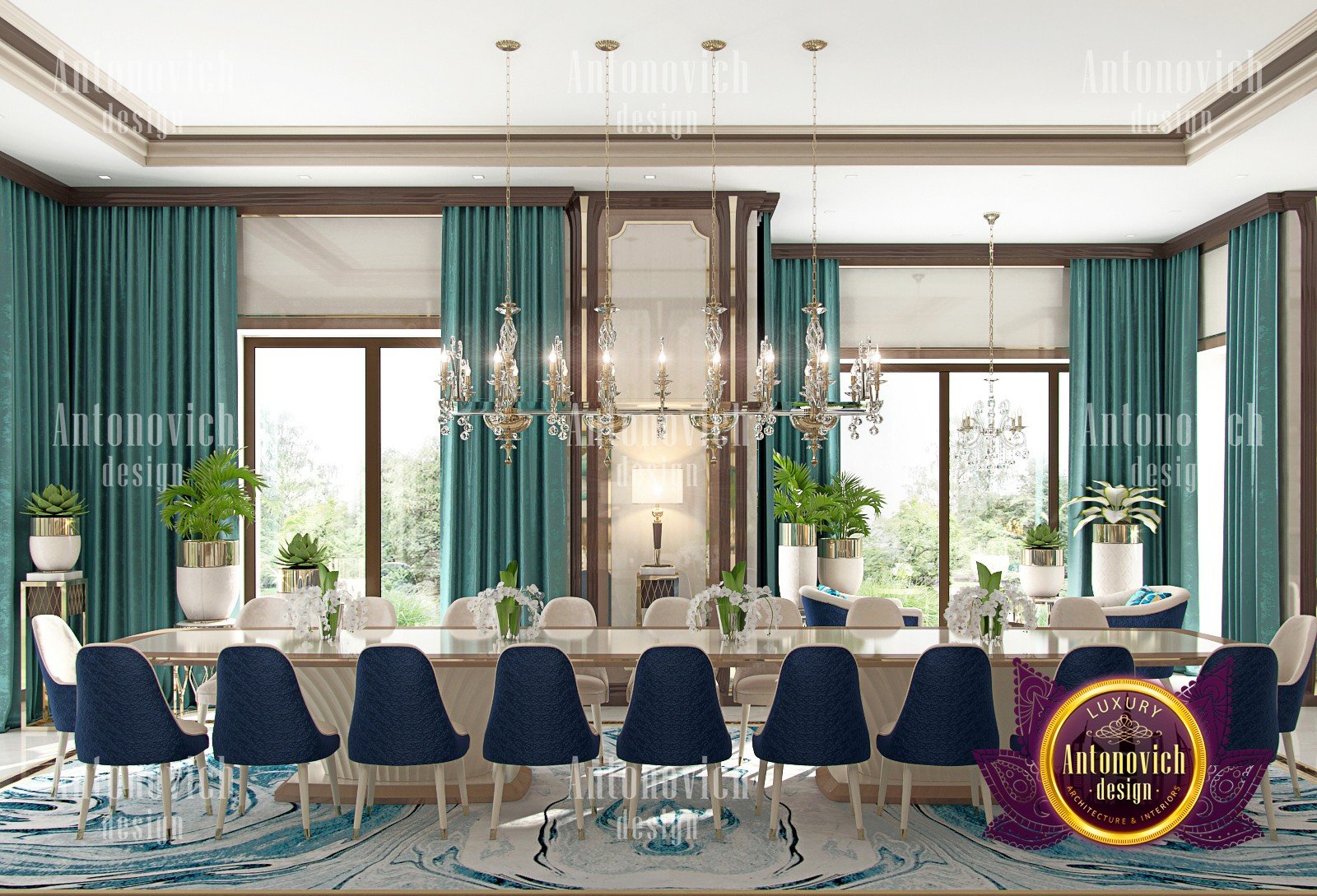 В модельном проекте выше бирюзовый интерьер столовой выглядит освежающе при оформлении дома. Это идеальная зона для такого оттенка, который подчёркивает палитру и тему столовой. Проще всего включить зелёные и бирюзовые тона в столовую через элементы — шторы, стулья и декоративные подушки. Нейтральный фон создаёт баланс и даёт бирюзовому акценту собственную сцену, делая современный дизайн столовой заметным. Бирюзовые обеденные стулья добавляют очарование в великолепную композицию; в сочетании с тонкими драпировками это смелое и элегантное решение.