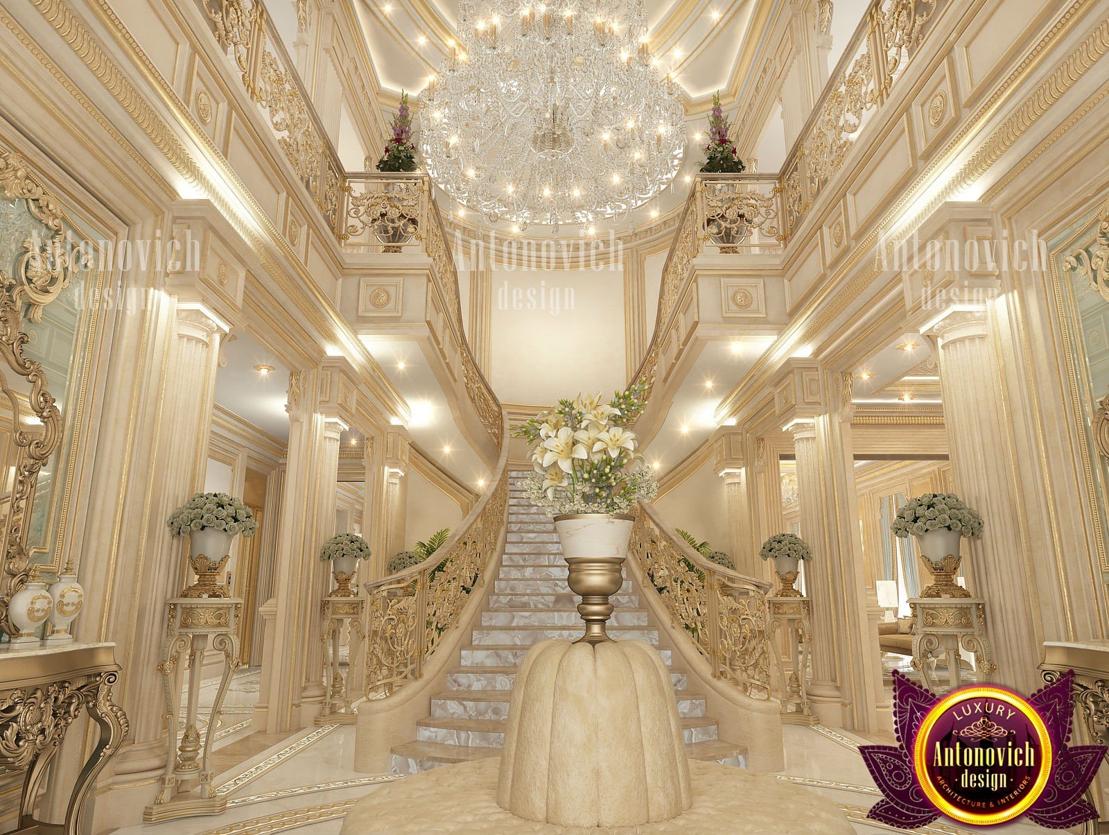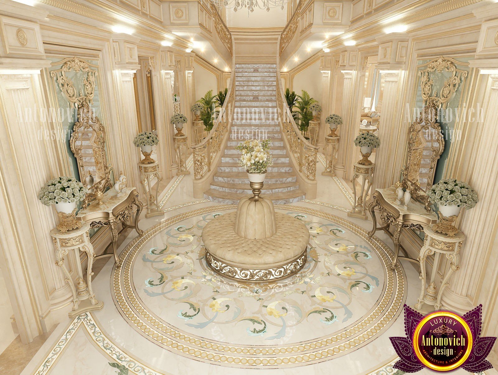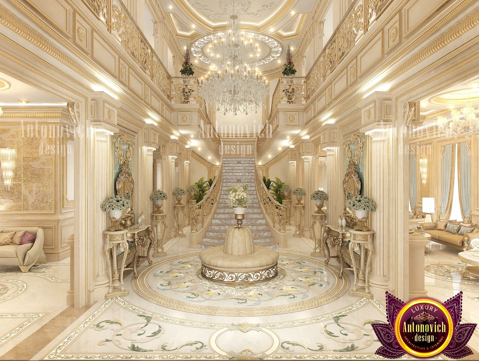 Холл, с его богатством отделочных материалов — мрамор, гипсовая лепнина, элегантное золочение дверей, выразительные светильники — обладает собственной архитектурной особенностью. Светло‑бежевые стены и потолок украшены золотой лепниной.