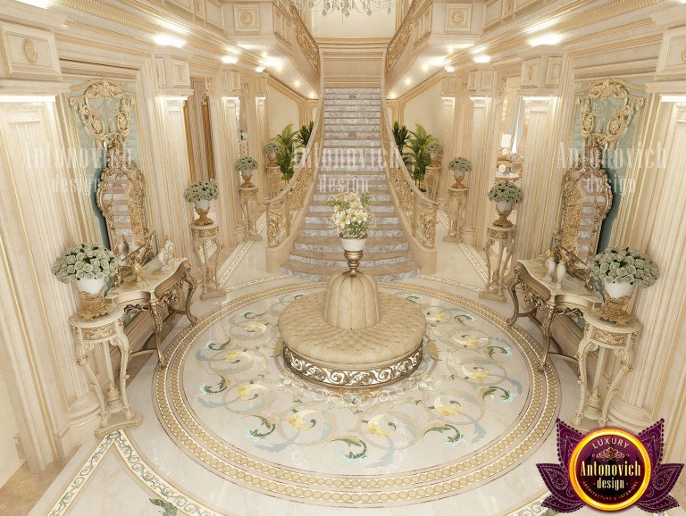 — Композиционная целостность интерьера холла. В этом проекте невероятный композиционный центр — лестница, выполненная из мрамора: лестница из мрамора как композиционный центр, выложенная мрамором двух цветов — белого с тонкими серыми жилками и бежевого в тон окружающего интерьера.