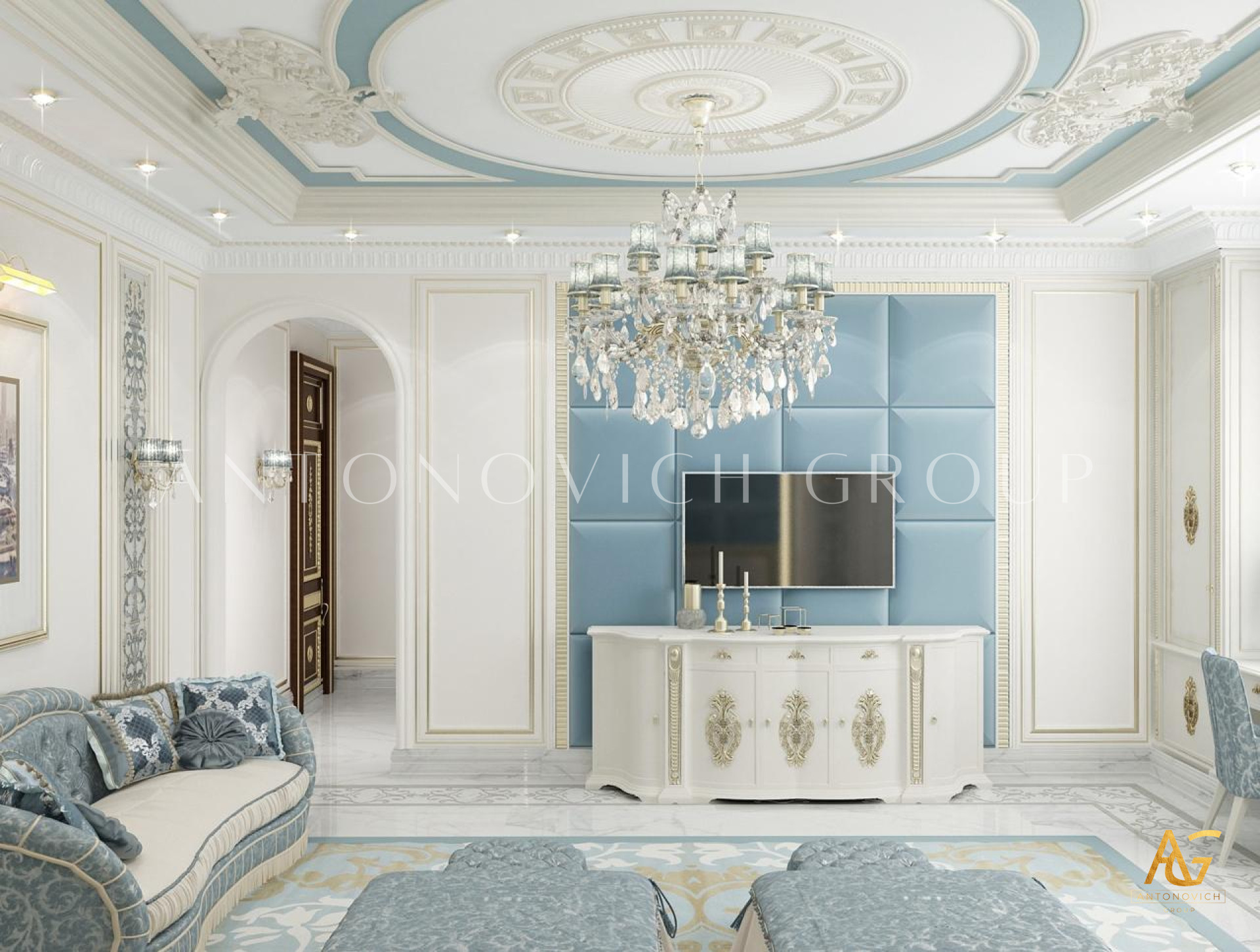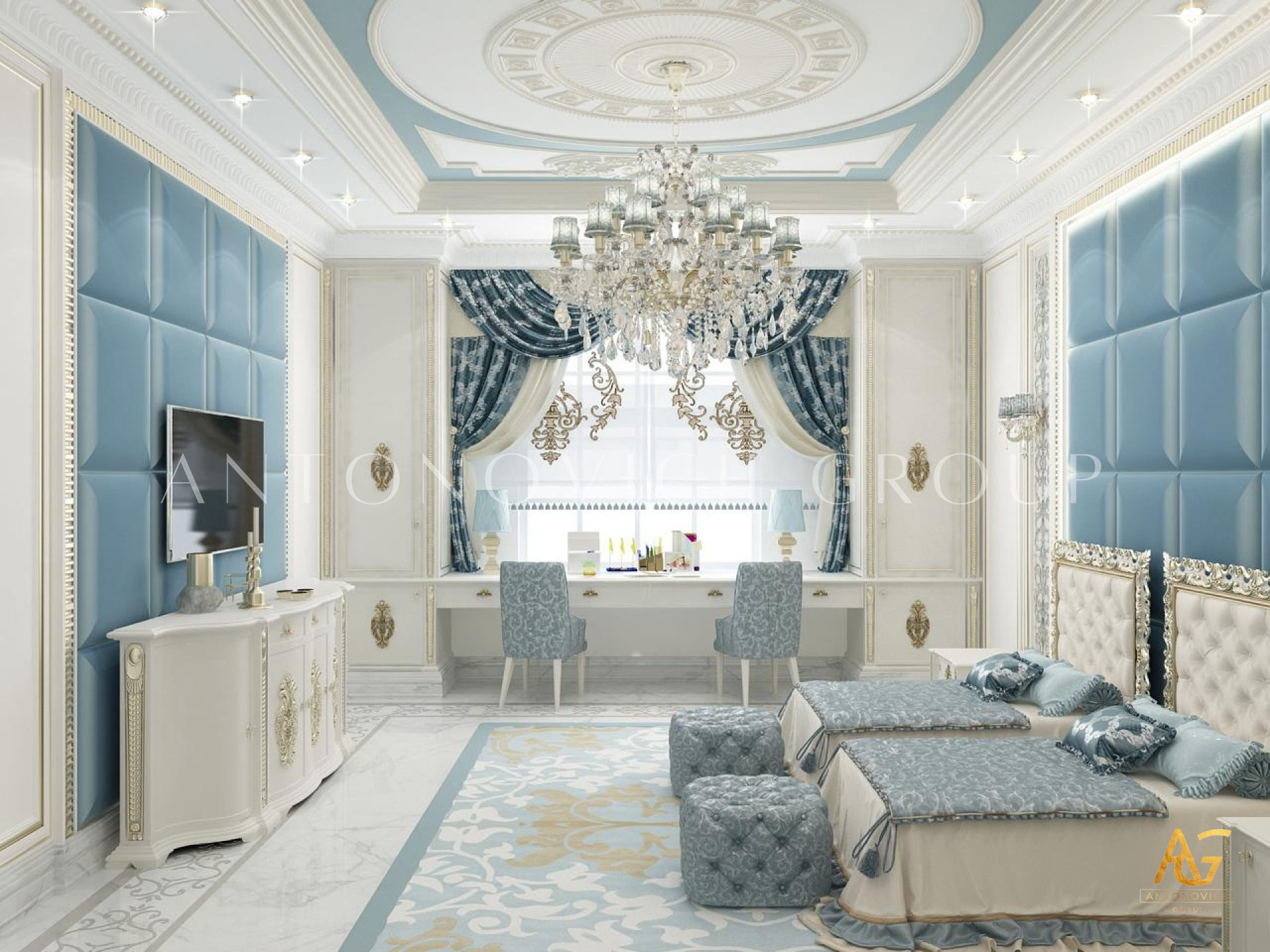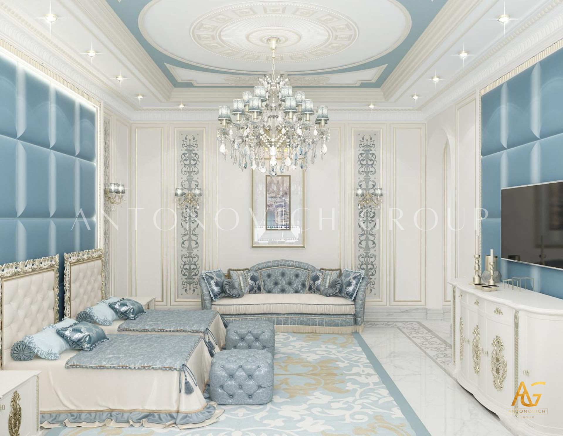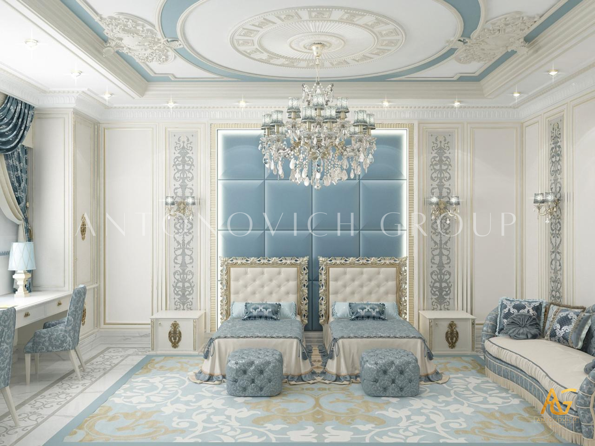 Работать над дизайном детской спальни для подростков интересно и непросто. В этом проекте речь шла о создании красивого и комфортного интерьера для двух братьев 13 и 14 лет. В рамках задания был реализован дизайн детской спальни 13 лет и 14 лет для совместного проживания. Дети разделяют общий интерес к футболу и спорту. Студия «Антонович Дизайн (Antonovich Design)» предложила современный дизайн детской комнаты с акцентом на минимализм. В палитре доминируют белый и голубой — получилась голубая детская спальня в современном стиле, где оригинальный текстиль играет ключевую роль. Дизайнеры объединили оформление окна с декором стен: шторы из шелка голубого оттенка с бронзовой окантовкой красиво переливаются при свете люстры и солнца, перекликаясь со снежно-белыми тюлями. Эти мотивы поддержаны в декоре стен. Две ниши, ставшие основой для зонирования спальных мест, отделаны тем же шелком. Покрывала на кроватях продолжают этот блеск ткани. Бронзовые акценты присутствуют в отделке мягких изголовий с ромбовидной фактурой. Для пола идеален натуральный паркет из ценных пород. Минимализм в детской спальне позволил оставить достаточно места для активных игр и хранения. Тщательно продуманное освещение детской спальни создаёт комфортные учебные и игровые зоны. Мы учитываем особенности и при выборе решений для дизайн спальни подростка. На практике это позволяет реализовать дизайн двухместной детской комнаты и дизайн спальни для двух братьев с индивидуальными решениями для каждого. Такие приёмы подходят для дизайн комнаты для подростков и легко адаптируются для интерьер детской комнаты. Если вы рассматриваете проект детской спальни под ключ, текстиль для детской спальни и качественные материалы станут основой атмосферы.