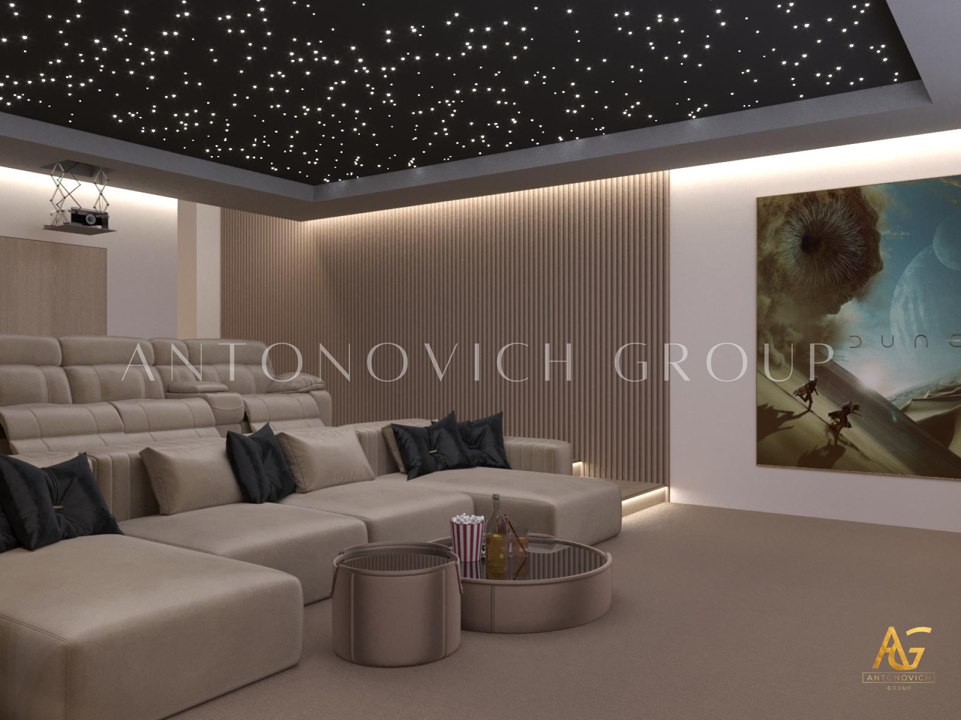 Роскошный дизайн домашнего кинотеатра — олицетворение комфорта и развлечений, где передовые технологии сочетаются с изящным интерьером. Антонович Дизайн (Antonovich Design) — ведущая компания по отделке вилл в Дубае, специализируется на создании индивидуальных домашних кинотеатров с захватывающим опытом просмотра. Наша экспертиза в отделке интерьеров вилл в Аджмане гарантирует, что каждый кинозал проектируется с учётом элегантности, функциональности и современного аудиовизуального оборудования.