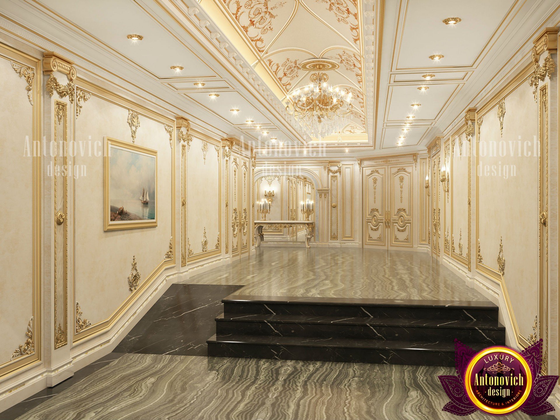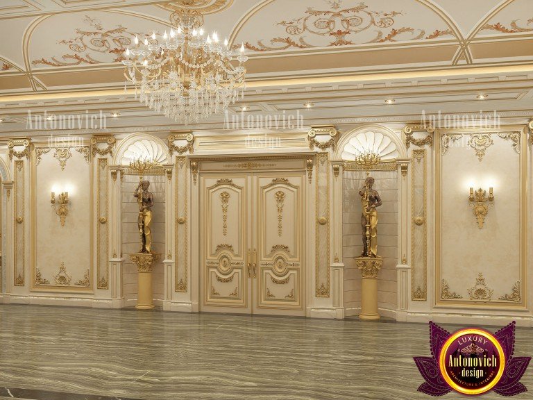 Лаконичный лепной декор с позолотой служит рамкой для картин и задаёт геометрию пространства. Элегантный сводчатый потолок — характерный приём античного образа — придаёт интерьеру торжественность, создавая игру теней от встроенных светильников и роскошных хрустальных люстр с позолоченными элементами: освещение холла классика и тщательно продуманное расположение источников света усиливают эффект.