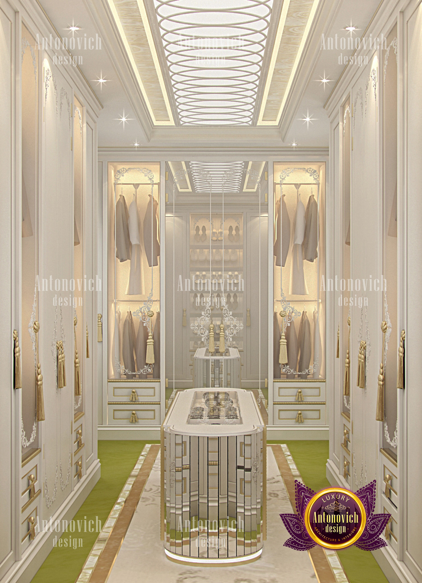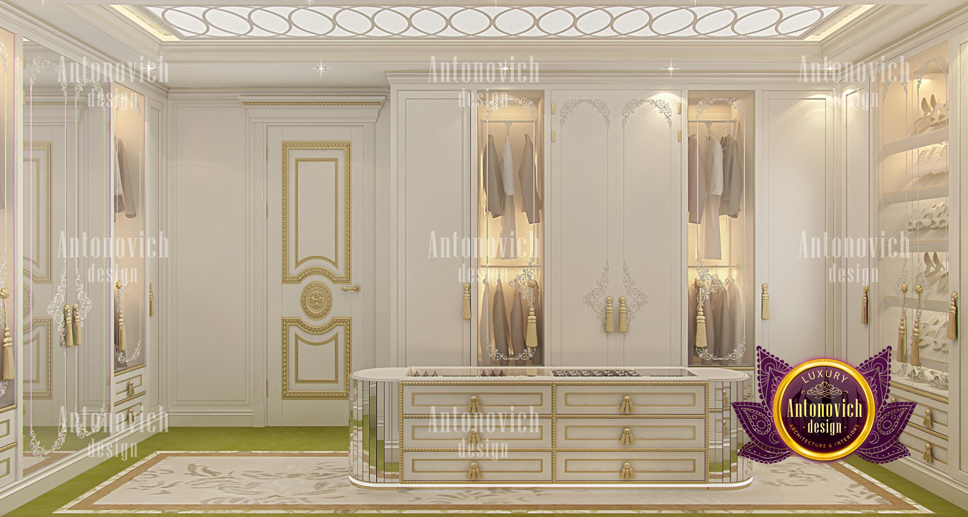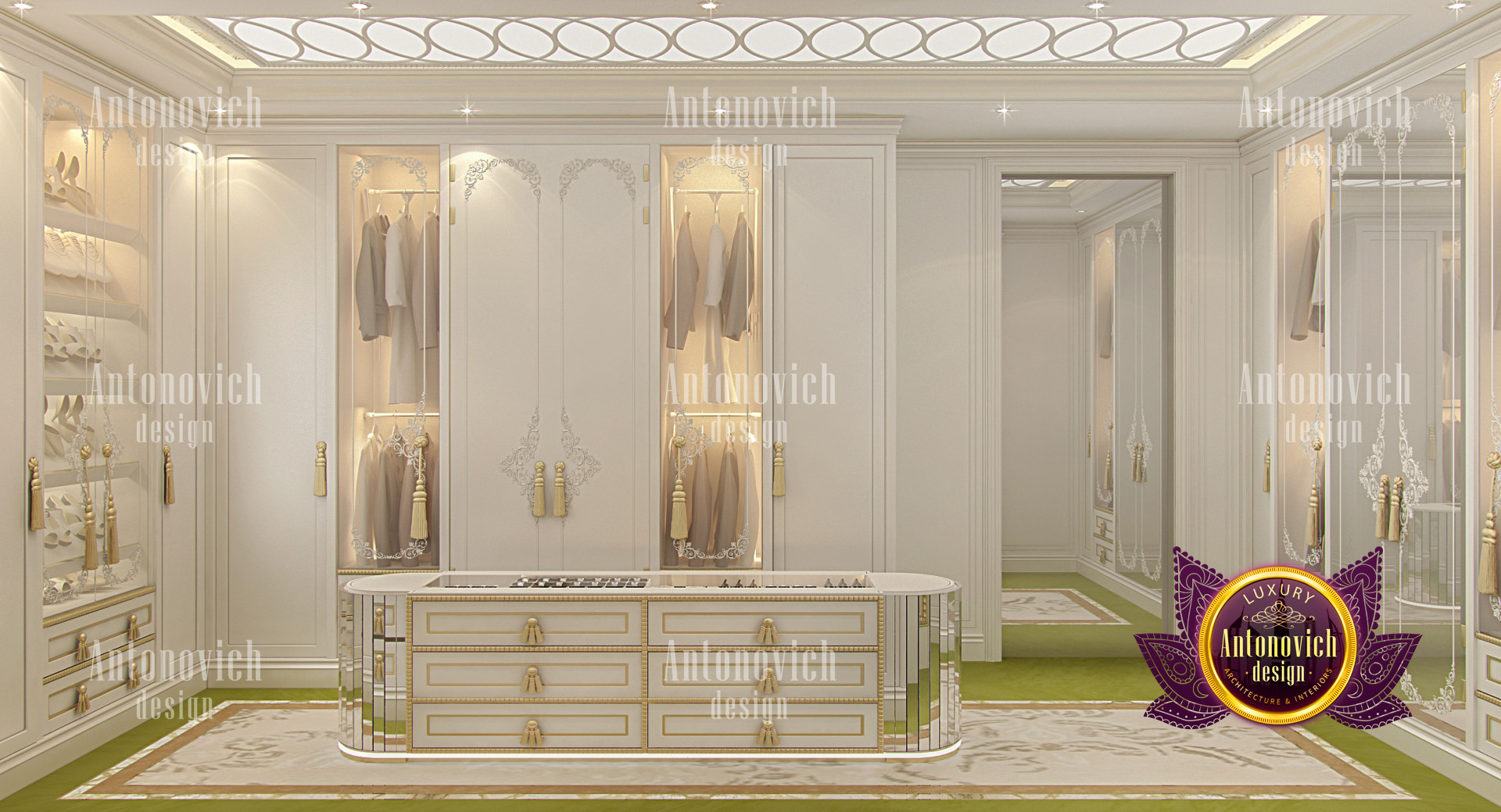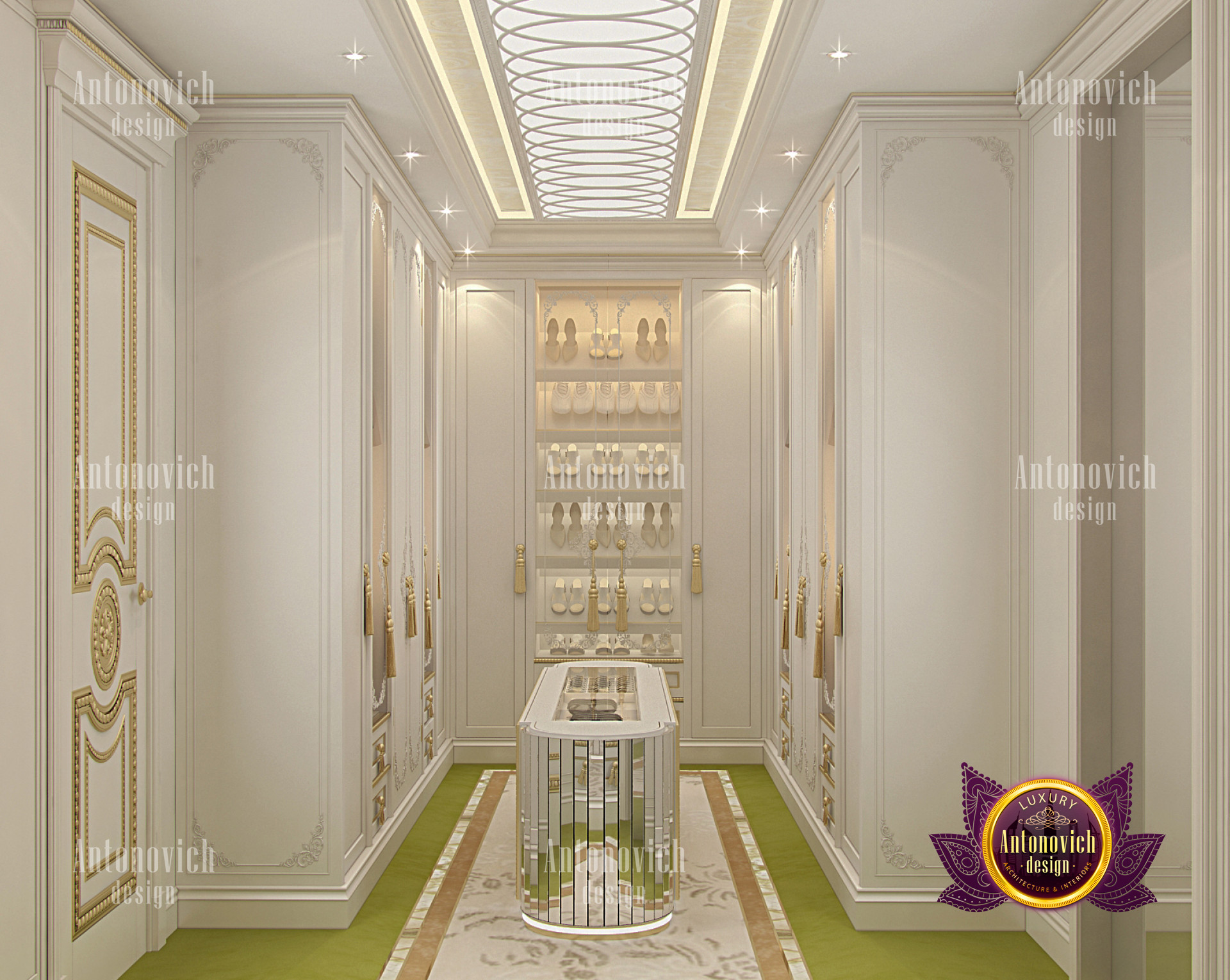 Важно выбрать благородный оттенок. Здесь представлен кремовый интерьер гардеробной, который сохраняет уют и не делает пространство монотонным — такой стиль ценят самые состоятельные в Дубае. Эта работа — дизайн гардеробной в Дубае. Этот проект гардеробной для квартиры демонстрирует продуманную планировку гардеробной комнаты и аккуратно организованы встроенный шкаф-гардероб и полки. Обращает на себя внимание планировка гардеробной комнаты. Здесь виден интерьер гардеробной комнаты. Результат — гардеробная мечты для женщин. Талантливые дизайнеры Антонович Дизайн (Antonovich Design) отвечают за привлекательность интерьер гардеробной комнаты.