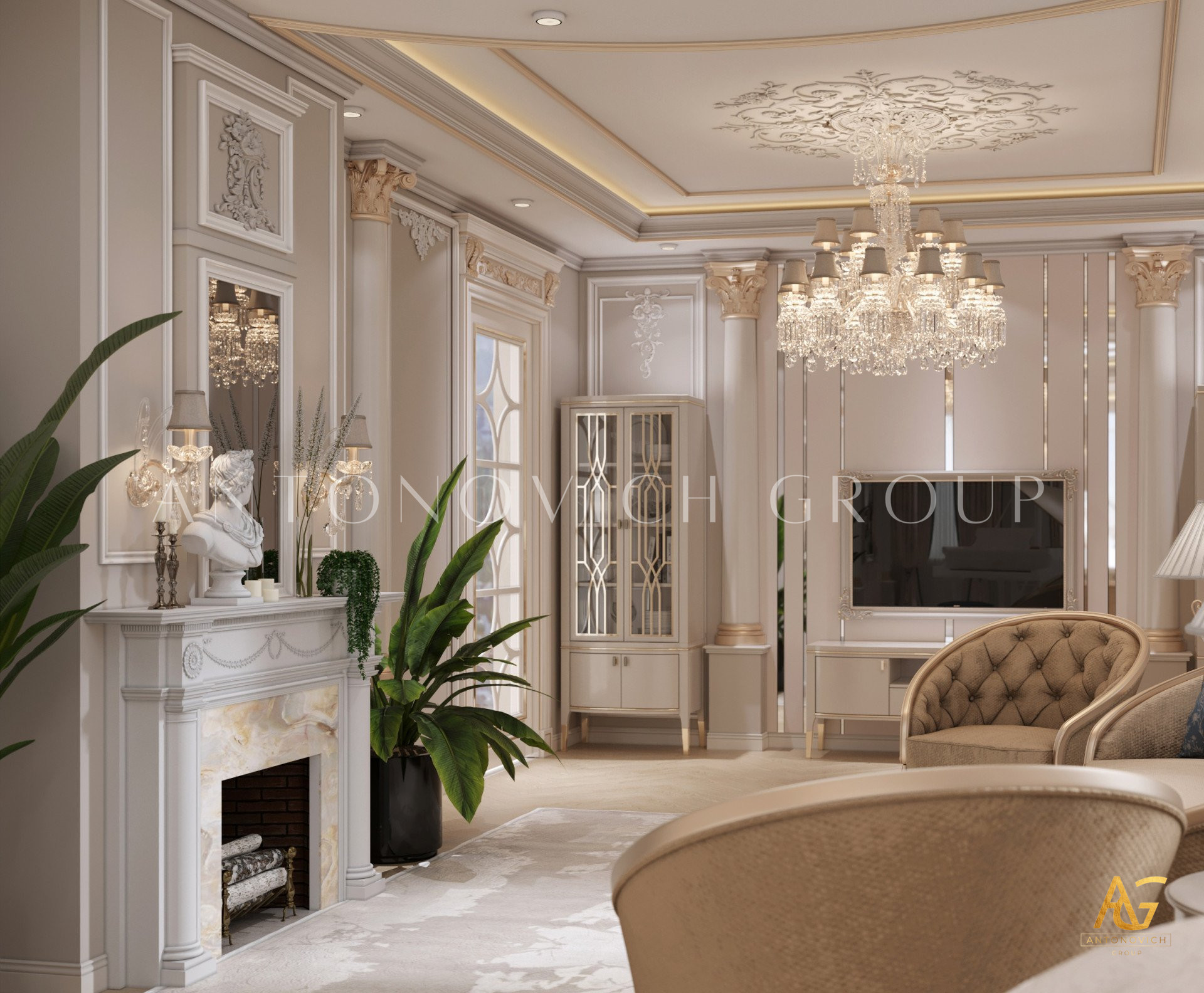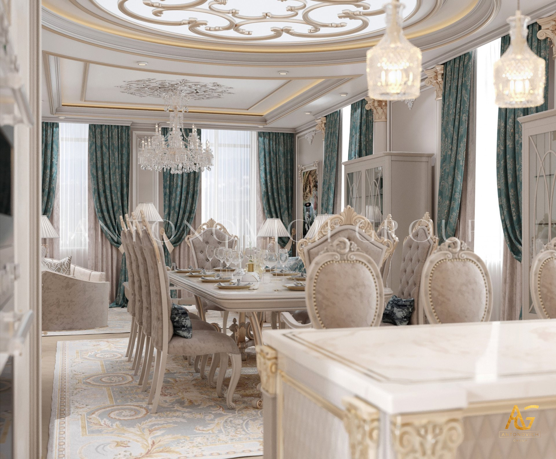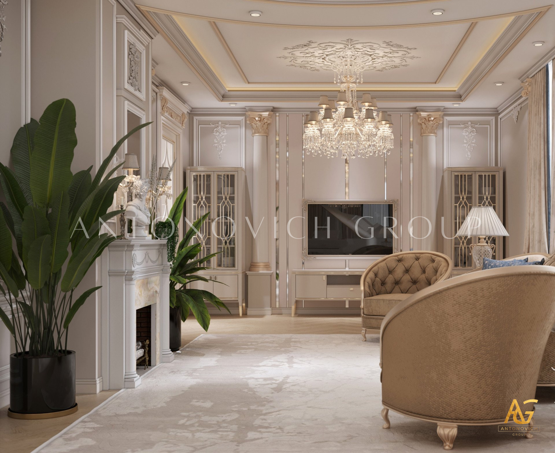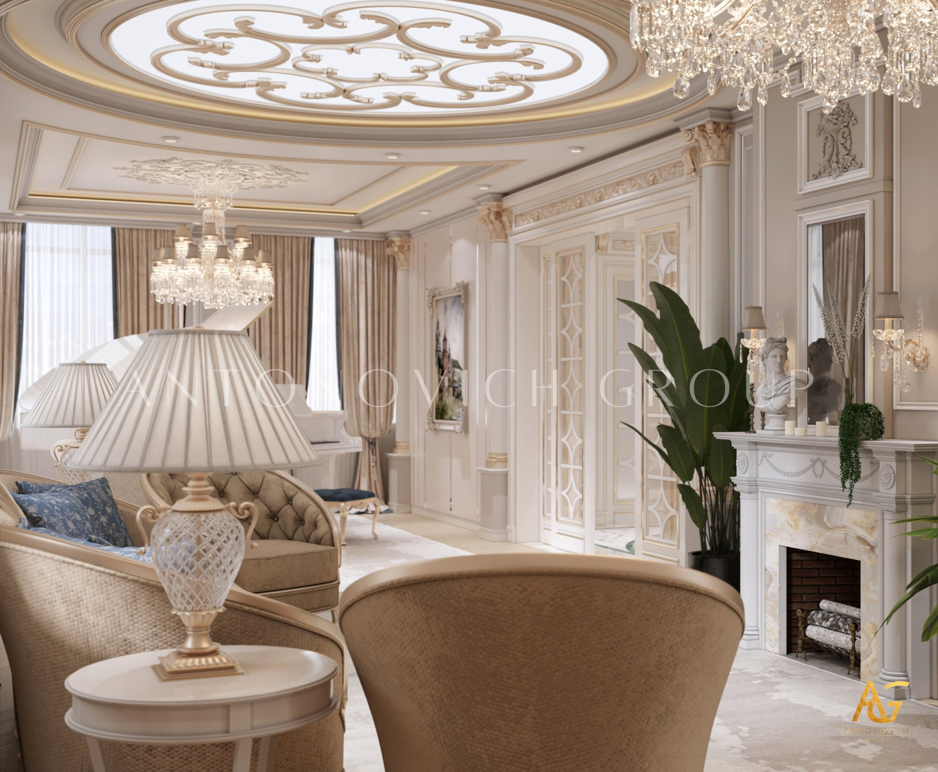 Нежный мягко-коричневый оттенок роскошного классического дизайна виллы в Дубае используется по всей площади. От пола до потолка пространство окружено изящными орнаментами. Сложность рисунков заметна уже на ковре — продолжение прослеживается в шторах с богатым узором, которые ассоциируются с благосостоянием и статусом. Стены украшены декоративными мотивами, которые гармонируют с общей темой интерьера виллы в Дубае. Благодаря рациональной расстановке мебели Антонович Дизайн (Antonovich Design) смог максимально использовать доступное пространство. Картины и рамы на стенах придают помещению гостиничную атмосферу в доме. Служба профессиональной отделки Антонович Дизайн организует все элементы вокруг этого роскошного классического интерьера — каждая деталь работает на цельный образ.