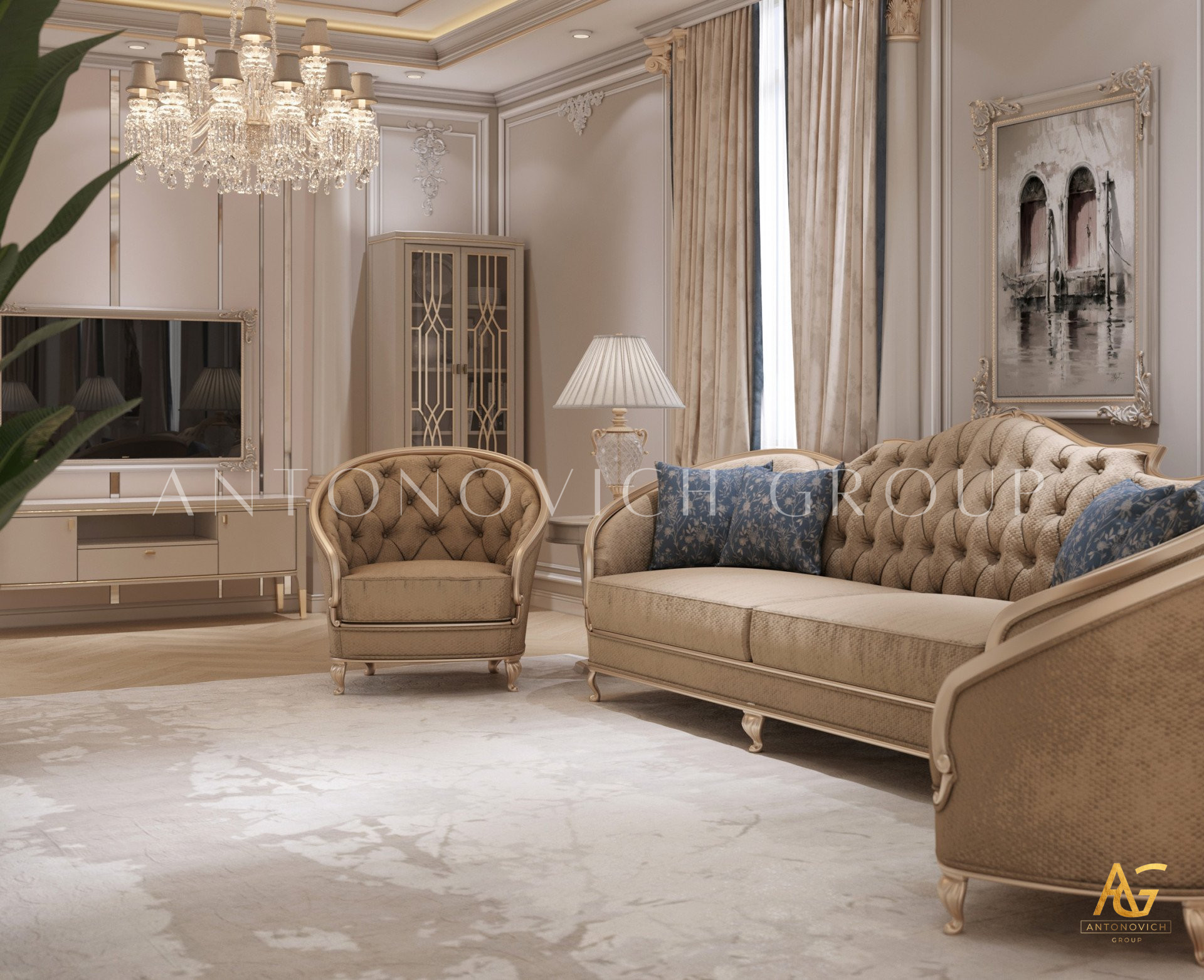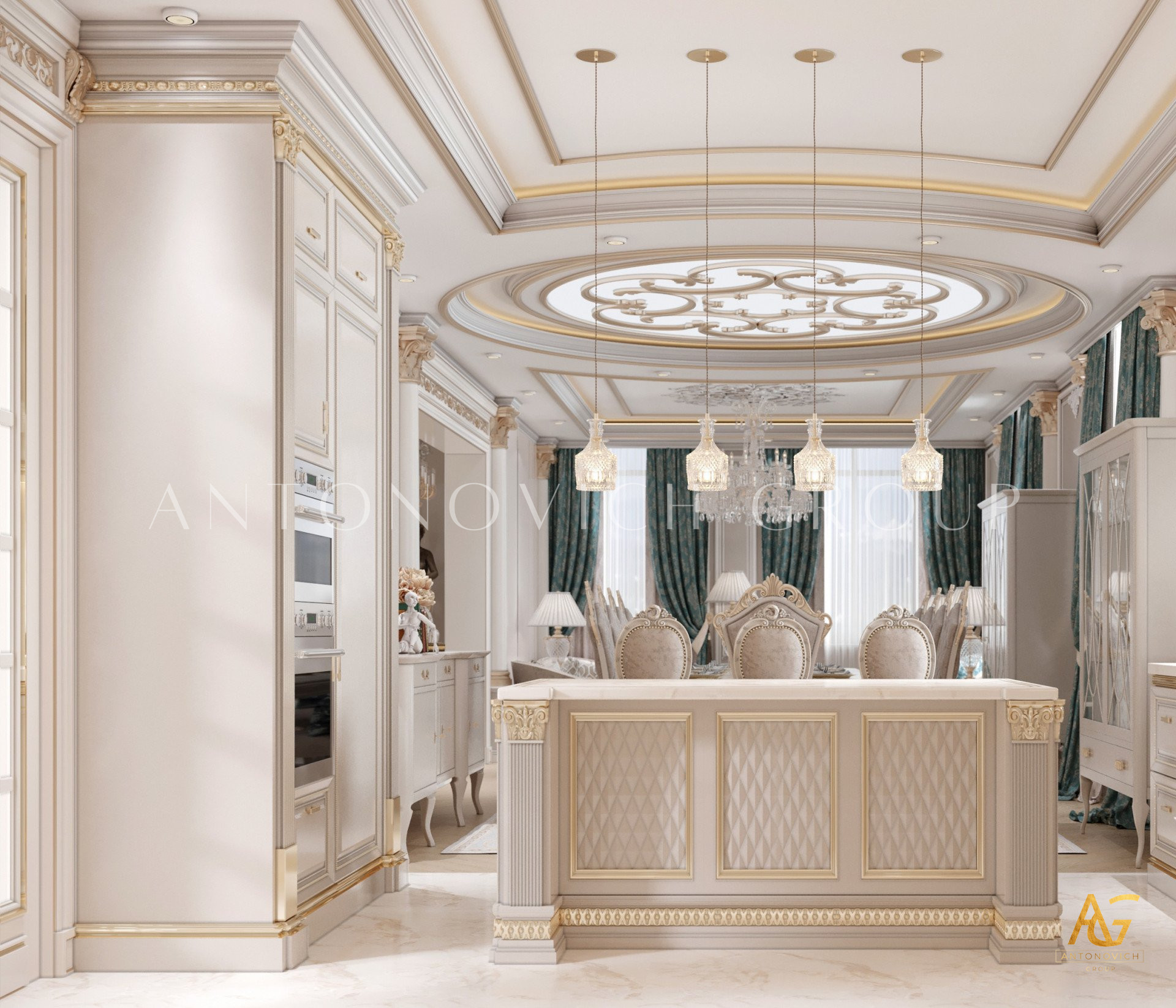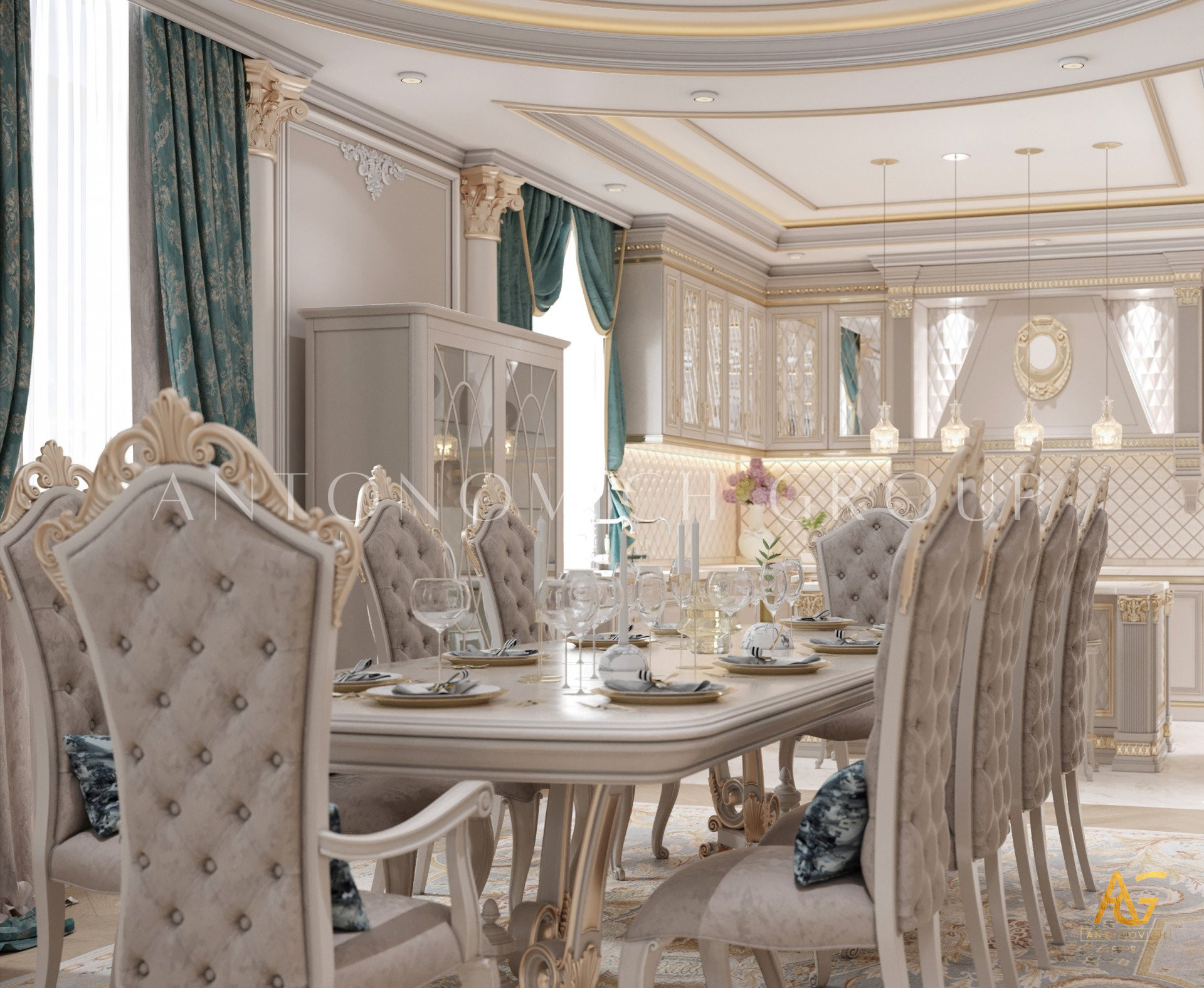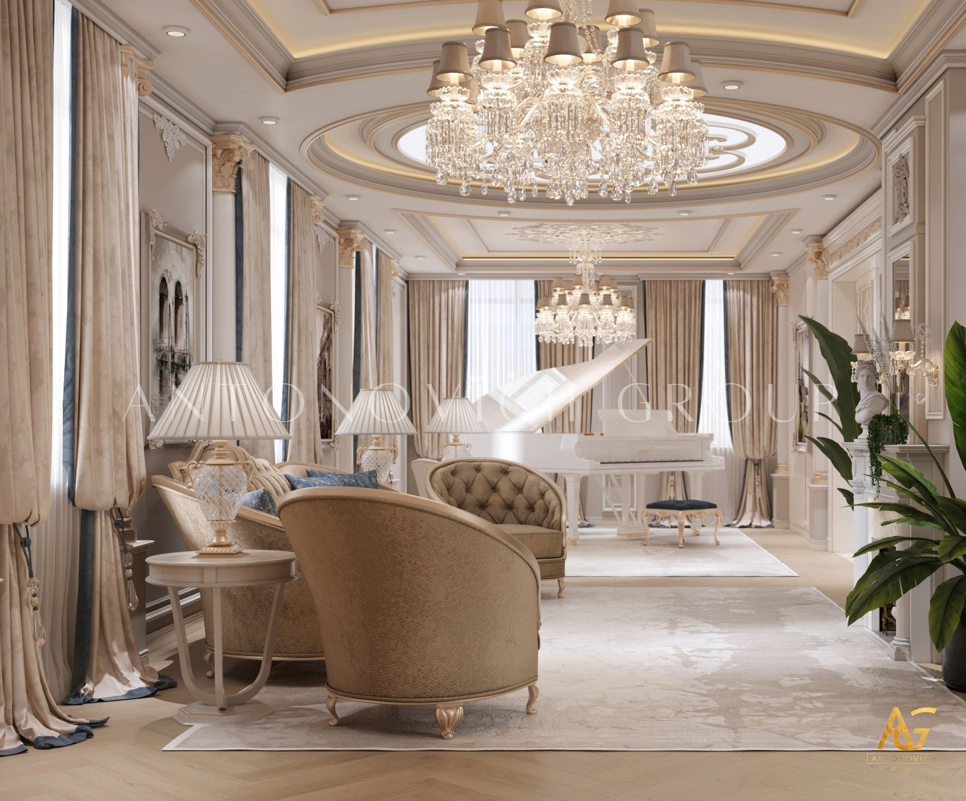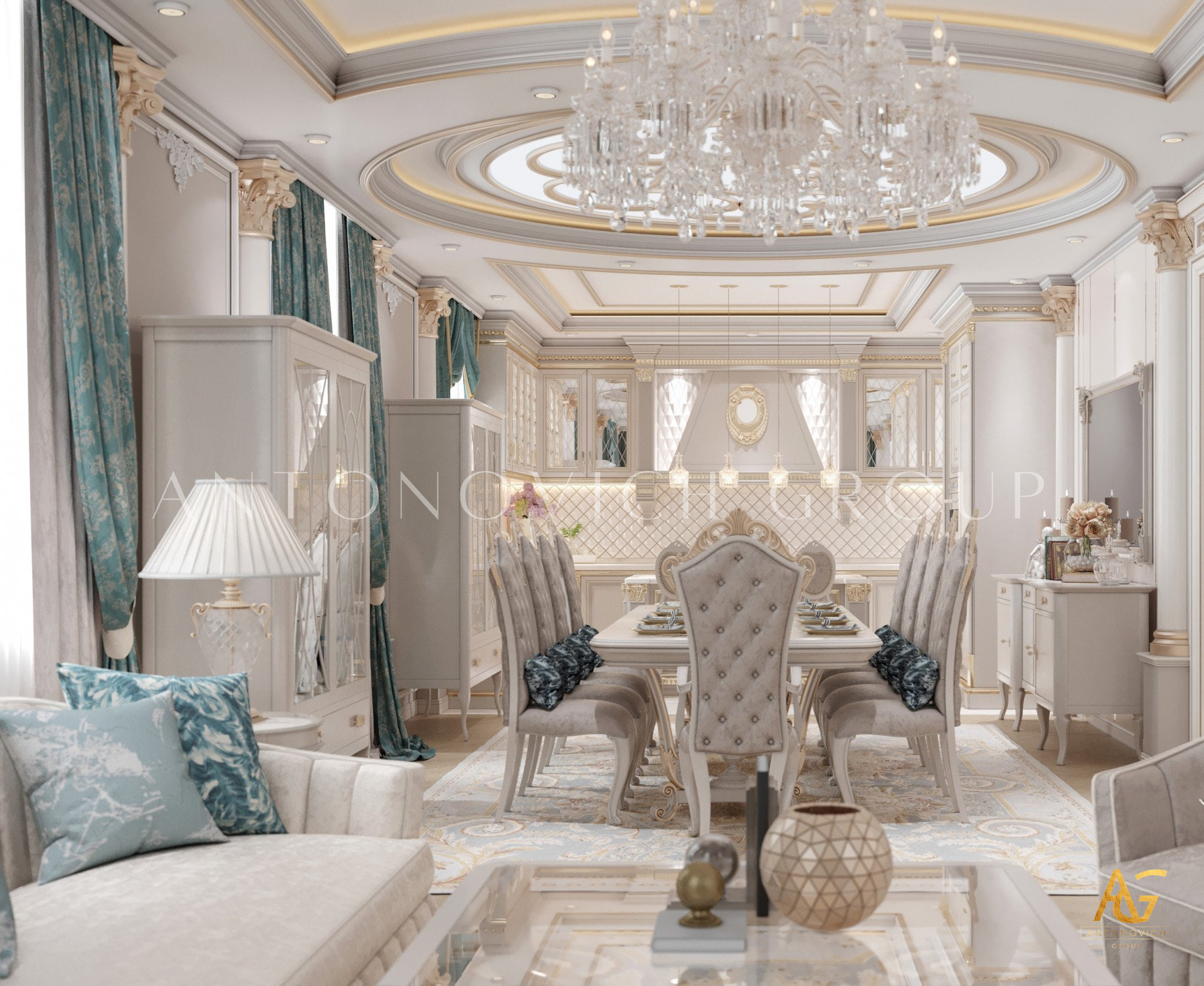 Нежный мягко-коричневый оттенок роскошного классического дизайна виллы в Дубае используется по всей площади. От пола до потолка пространство окружено изящными орнаментами. Сложность рисунков заметна уже на ковре — продолжение прослеживается в шторах с богатым узором, которые ассоциируются с благосостоянием и статусом. Стены украшены декоративными мотивами, которые гармонируют с общей темой интерьера виллы в Дубае. Благодаря рациональной расстановке мебели Антонович Дизайн (Antonovich Design) смог максимально использовать доступное пространство. Картины и рамы на стенах придают помещению гостиничную атмосферу в доме. Служба профессиональной отделки Антонович Дизайн организует все элементы вокруг этого роскошного классического интерьера — каждая деталь работает на цельный образ.
