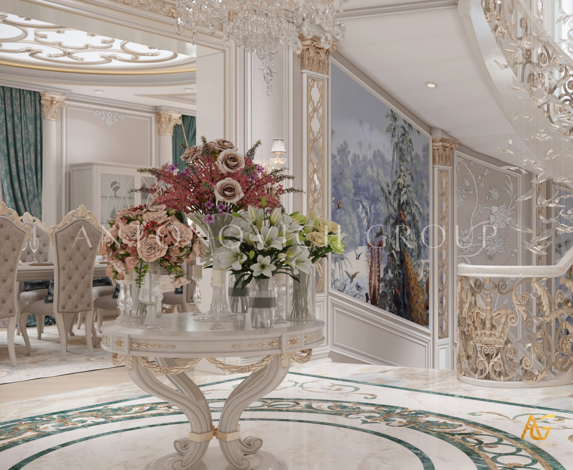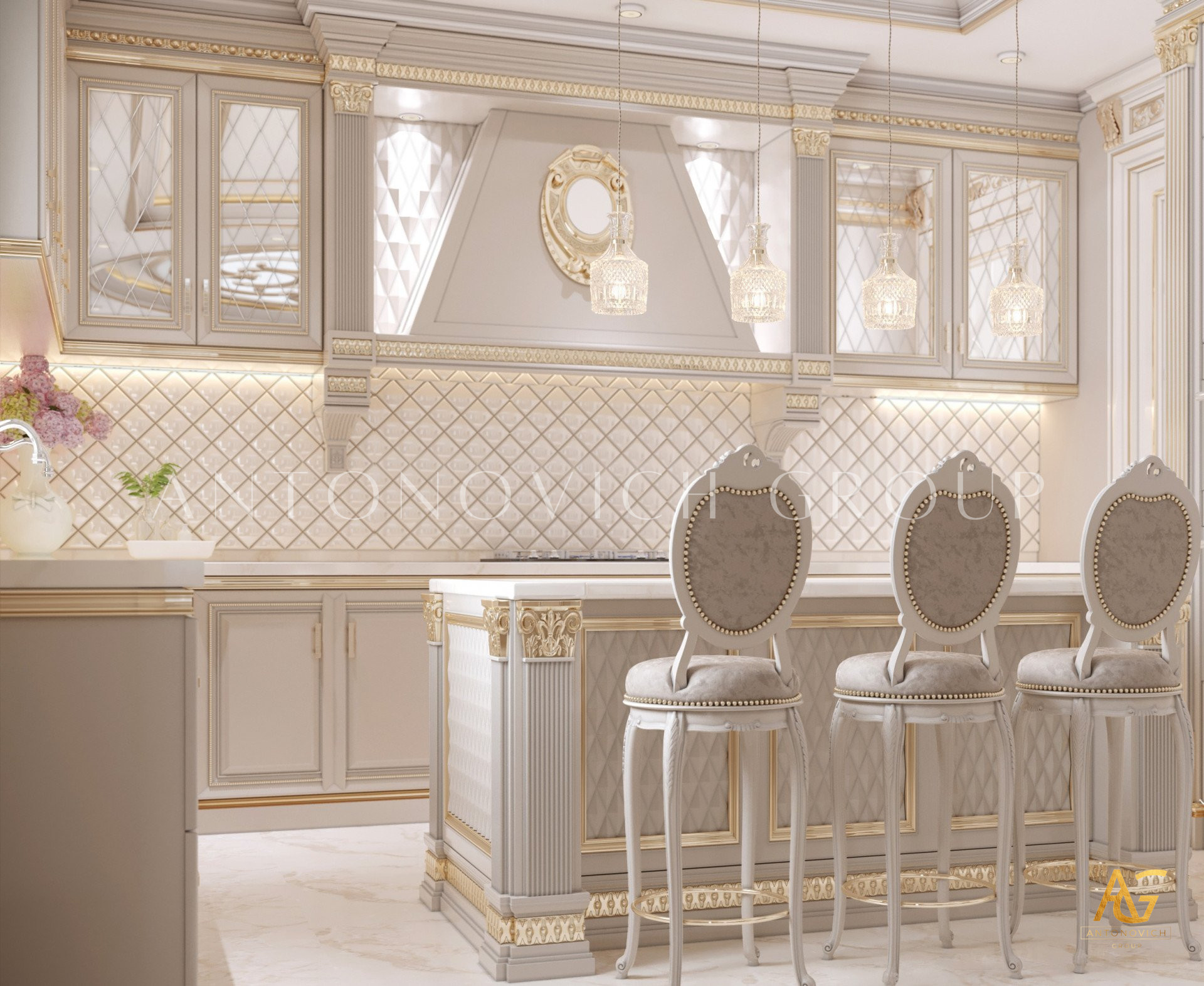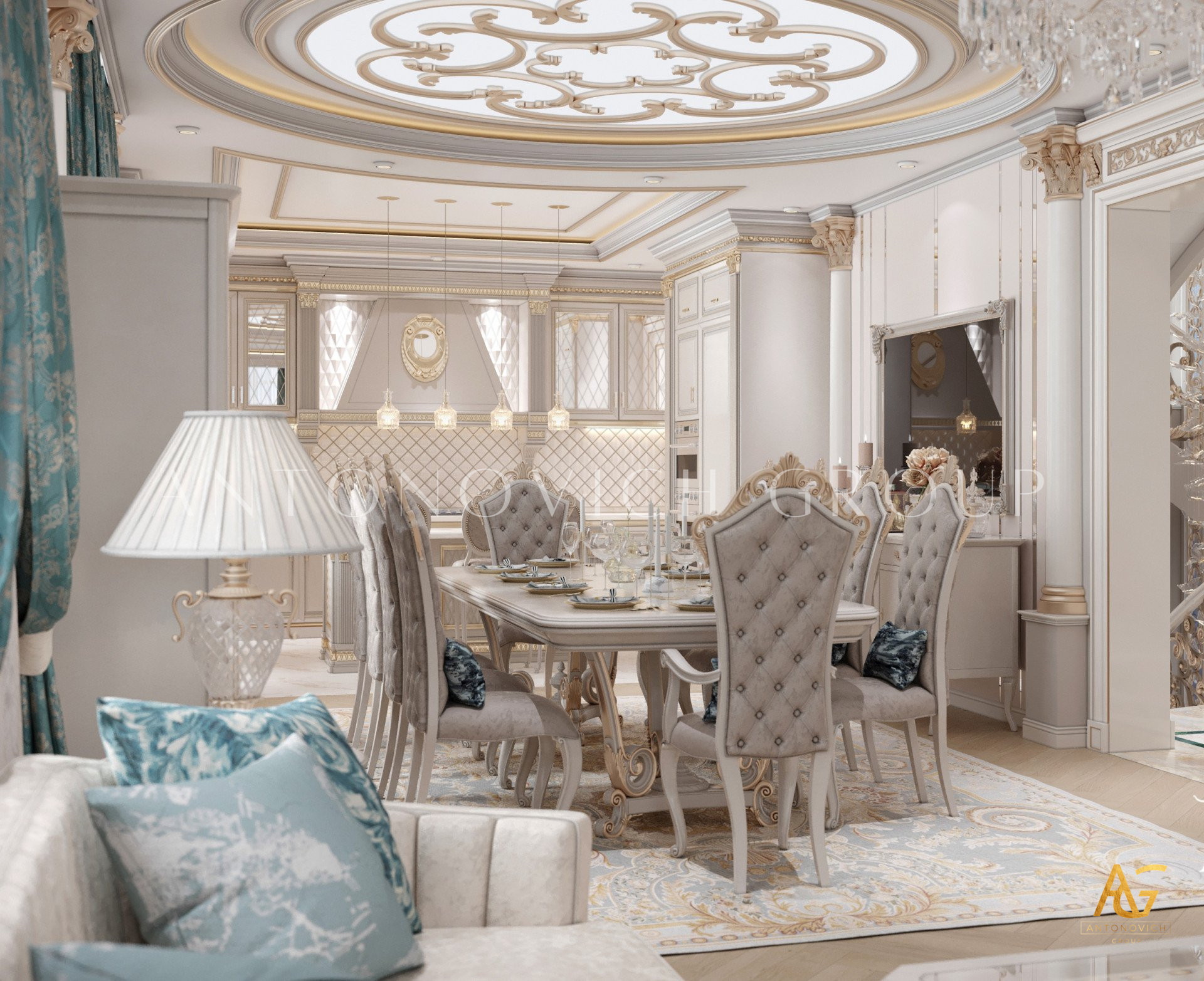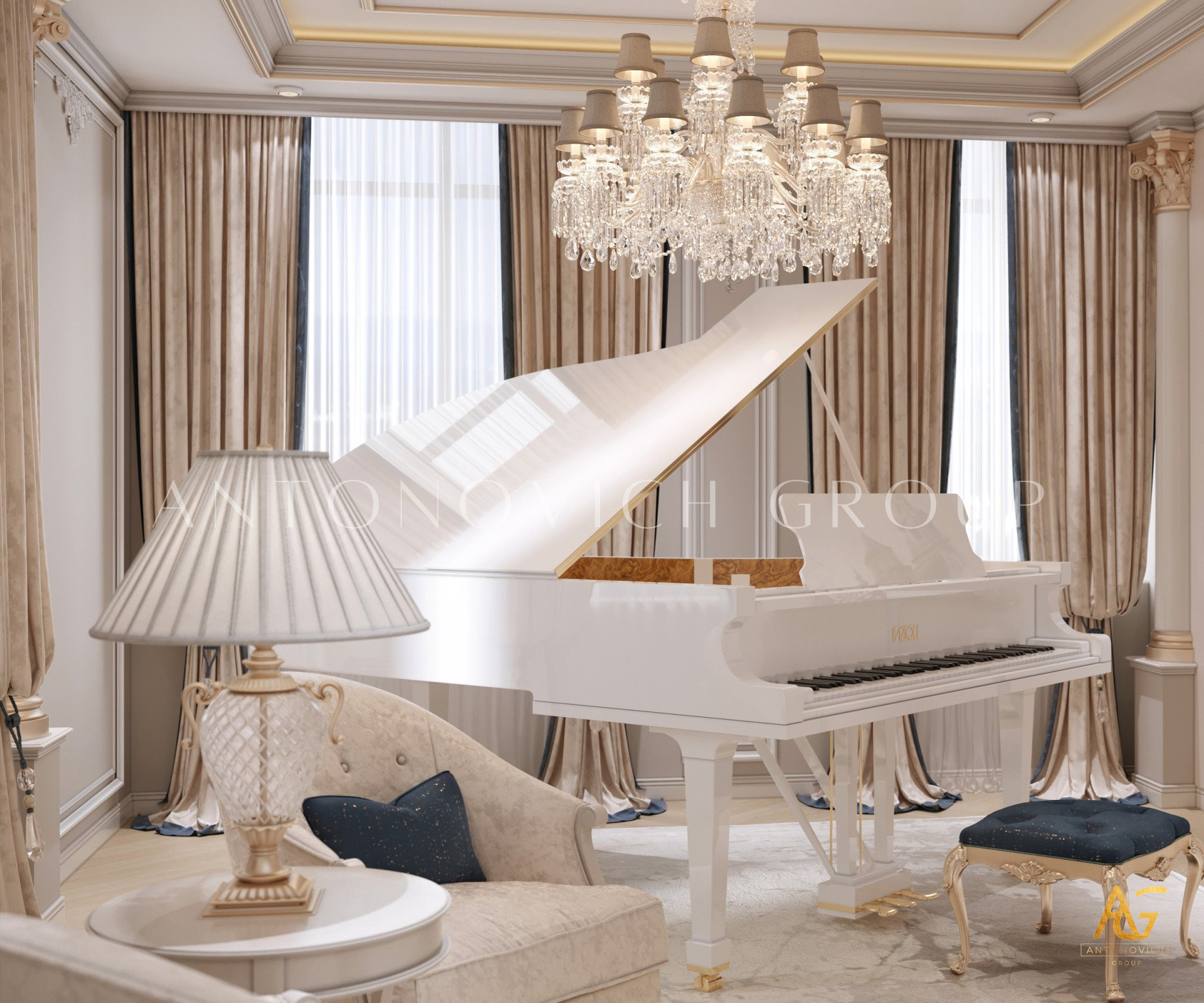 Нежный мягко-коричневый оттенок роскошного классического дизайна виллы в Дубае используется по всей площади. От пола до потолка пространство окружено изящными орнаментами. Сложность рисунков заметна уже на ковре — продолжение прослеживается в шторах с богатым узором, которые ассоциируются с благосостоянием и статусом. Стены украшены декоративными мотивами, которые гармонируют с общей темой интерьера виллы в Дубае. Благодаря рациональной расстановке мебели Антонович Дизайн (Antonovich Design) смог максимально использовать доступное пространство. Картины и рамы на стенах придают помещению гостиничную атмосферу в доме. Служба профессиональной отделки Антонович Дизайн организует все элементы вокруг этого роскошного классического интерьера — каждая деталь работает на цельный образ.