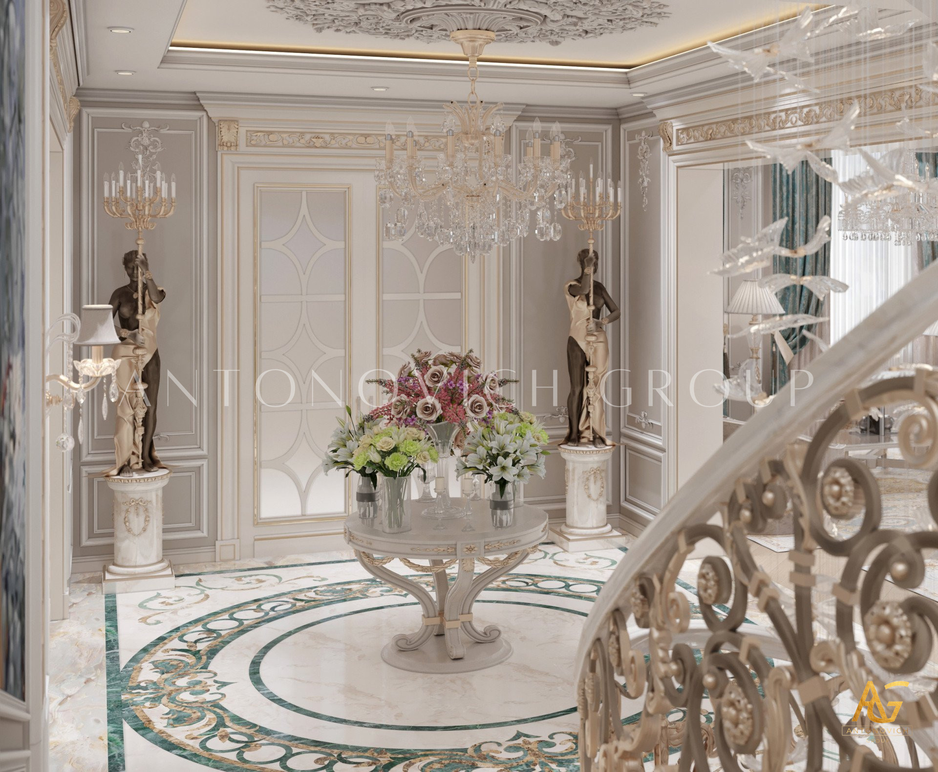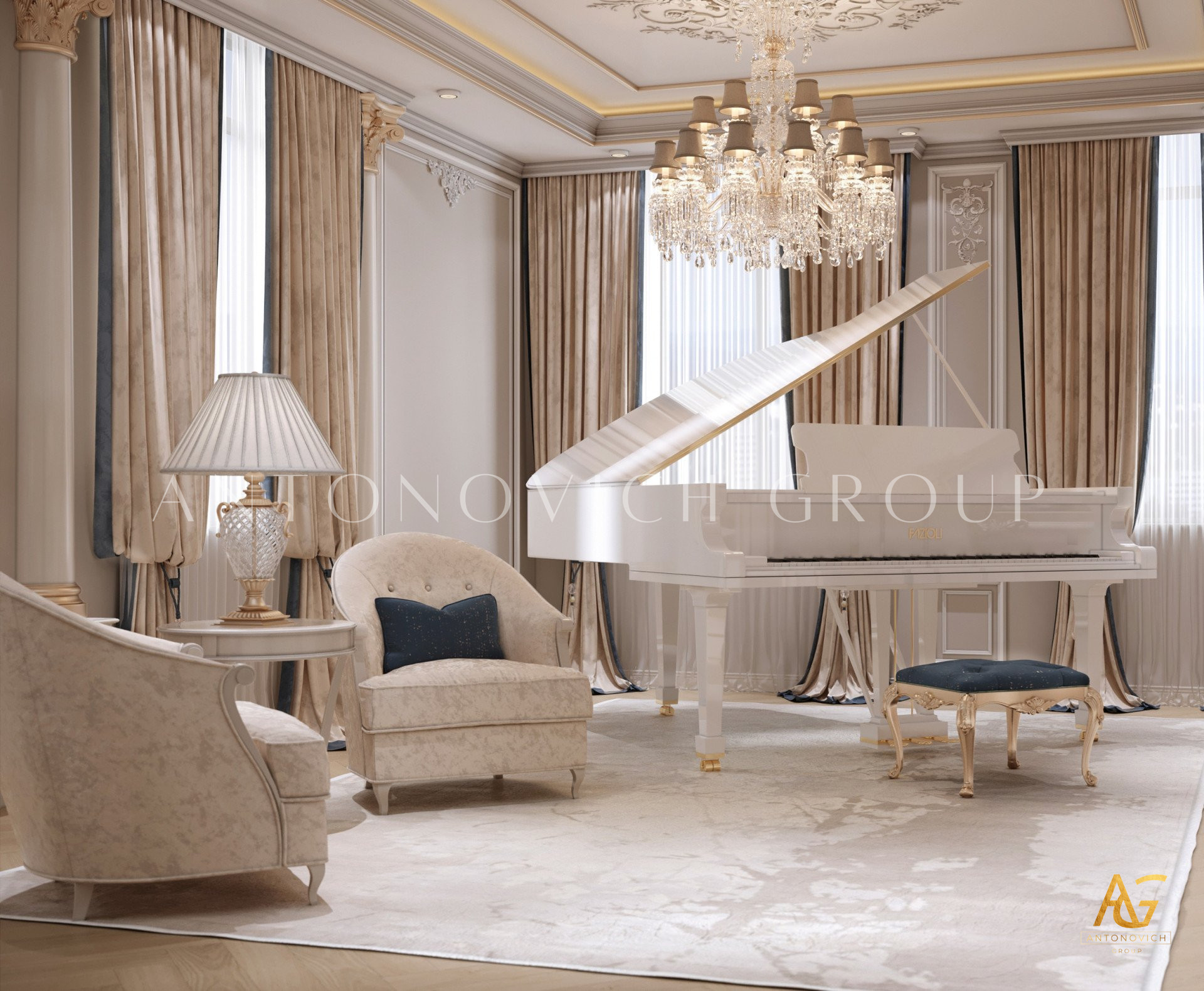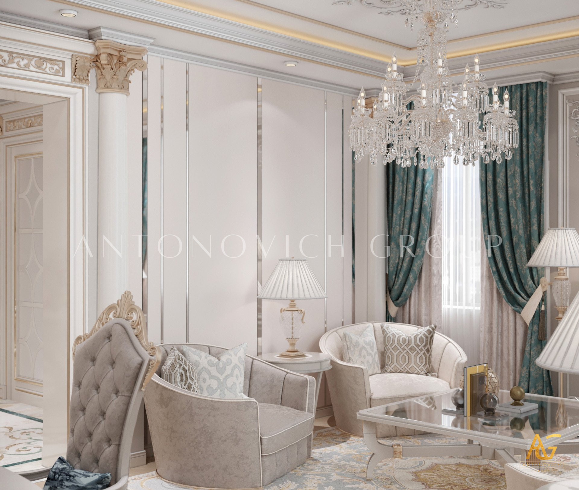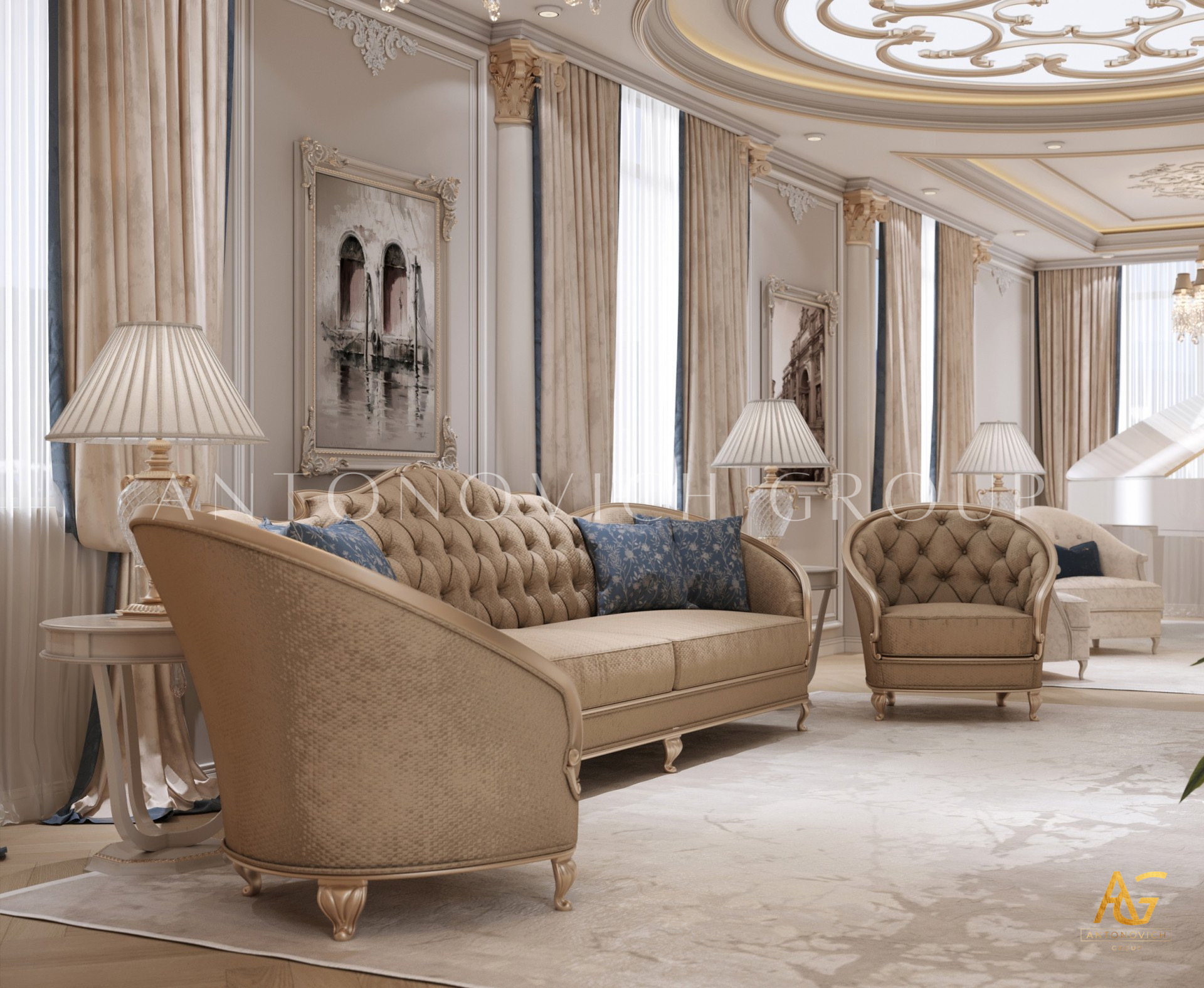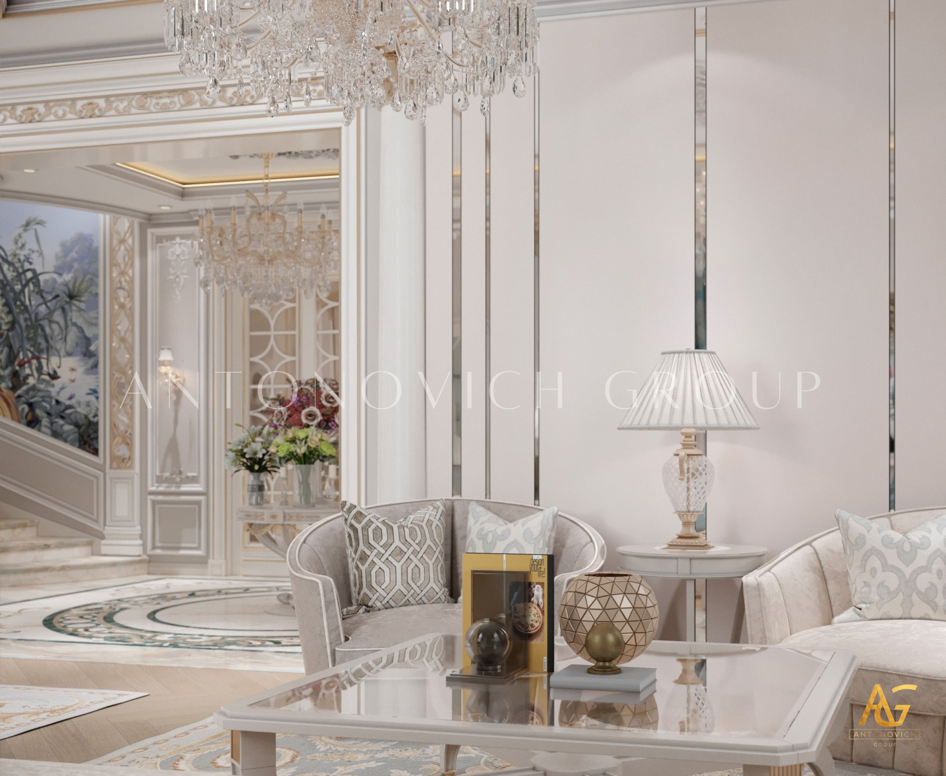 Нежный мягко-коричневый оттенок роскошного классического дизайна виллы в Дубае используется по всей площади. От пола до потолка пространство окружено изящными орнаментами. Сложность рисунков заметна уже на ковре — продолжение прослеживается в шторах с богатым узором, которые ассоциируются с благосостоянием и статусом. Стены украшены декоративными мотивами, которые гармонируют с общей темой интерьера виллы в Дубае. Благодаря рациональной расстановке мебели Антонович Дизайн (Antonovich Design) смог максимально использовать доступное пространство. Картины и рамы на стенах придают помещению гостиничную атмосферу в доме. Служба профессиональной отделки Антонович Дизайн организует все элементы вокруг этого роскошного классического интерьера — каждая деталь работает на цельный образ.