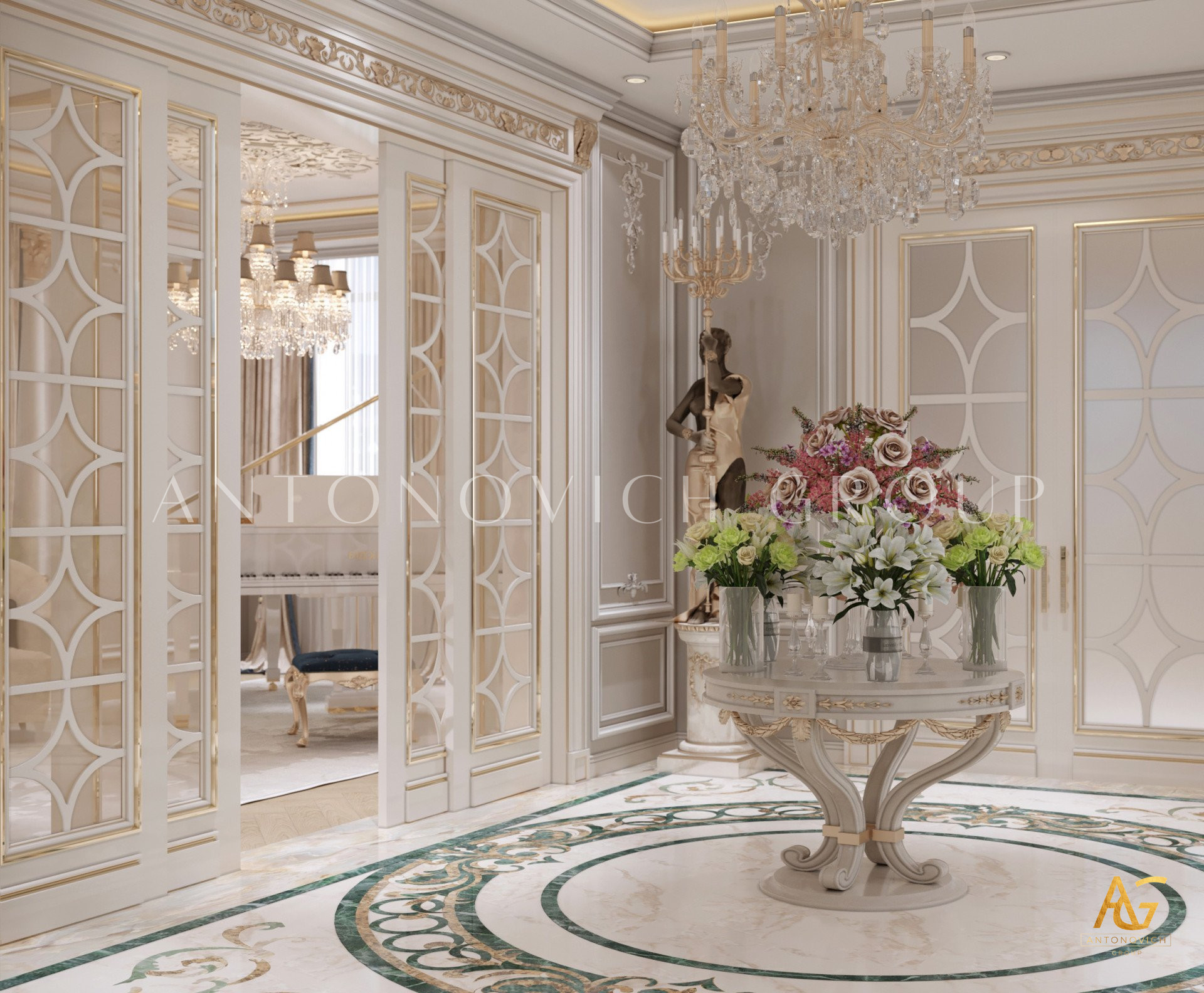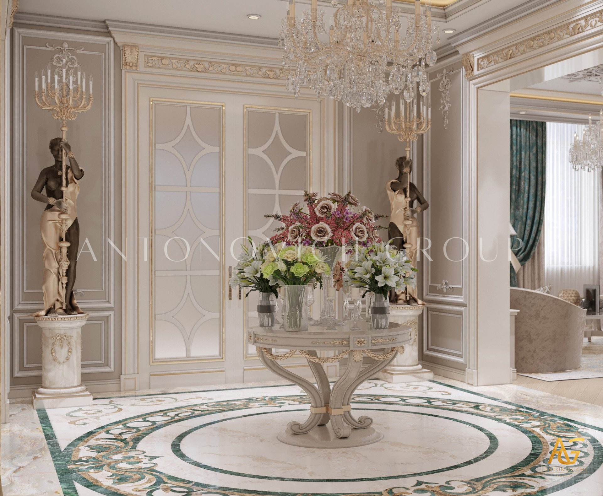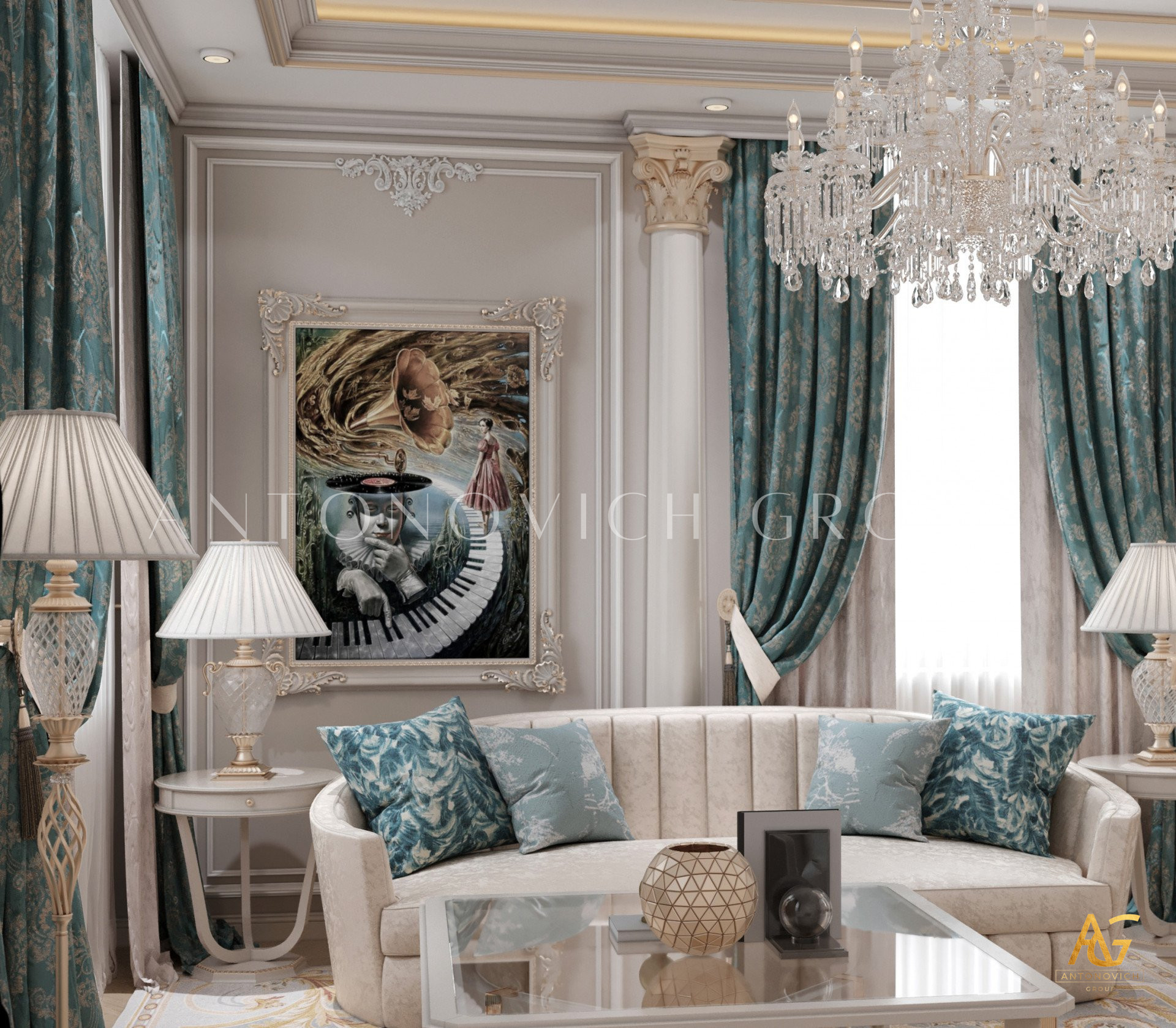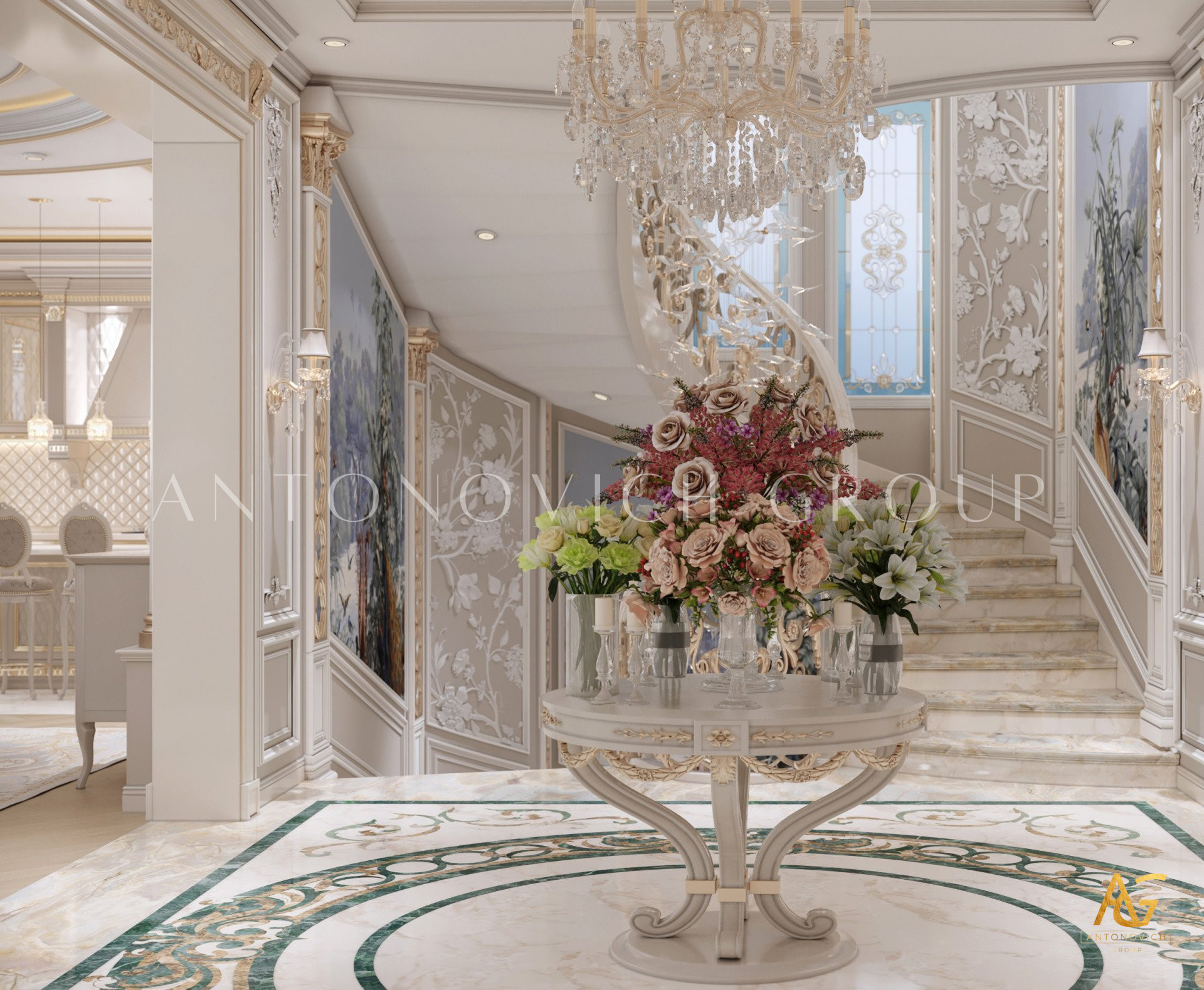 Нежный мягко-коричневый оттенок роскошного классического дизайна виллы в Дубае используется по всей площади. От пола до потолка пространство окружено изящными орнаментами. Сложность рисунков заметна уже на ковре — продолжение прослеживается в шторах с богатым узором, которые ассоциируются с благосостоянием и статусом. Стены украшены декоративными мотивами, которые гармонируют с общей темой интерьера виллы в Дубае. Благодаря рациональной расстановке мебели Антонович Дизайн (Antonovich Design) смог максимально использовать доступное пространство. Картины и рамы на стенах придают помещению гостиничную атмосферу в доме. Служба профессиональной отделки Антонович Дизайн организует все элементы вокруг этого роскошного классического интерьера — каждая деталь работает на цельный образ.