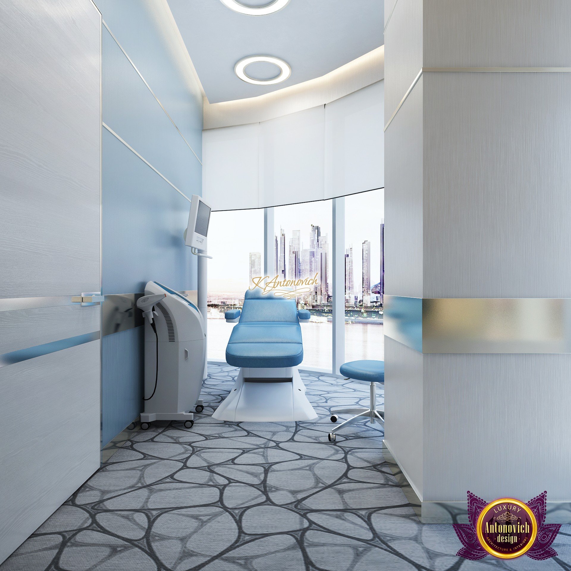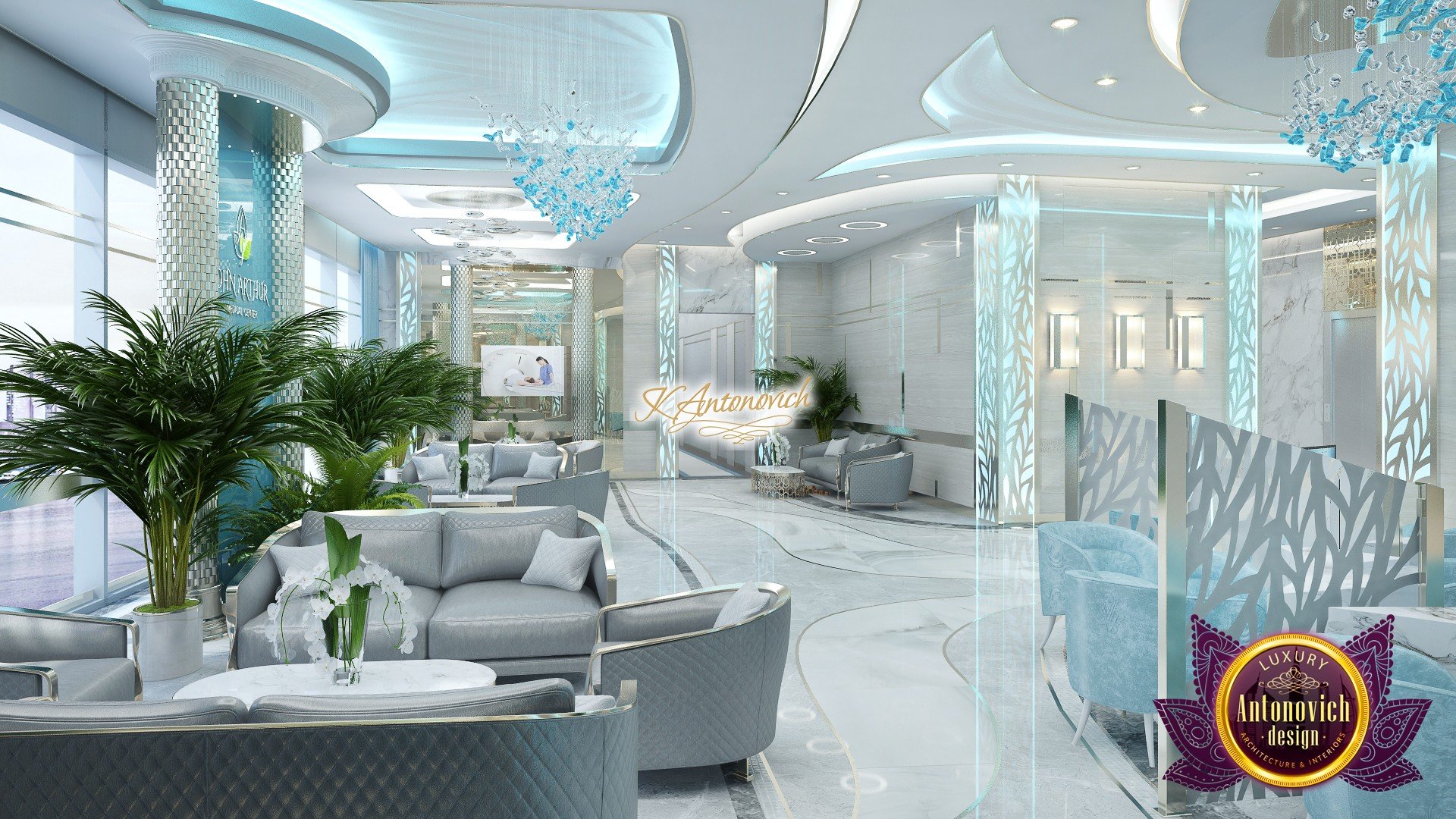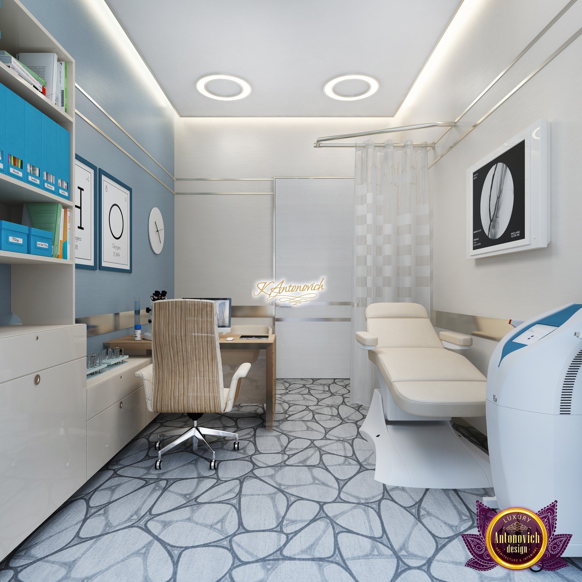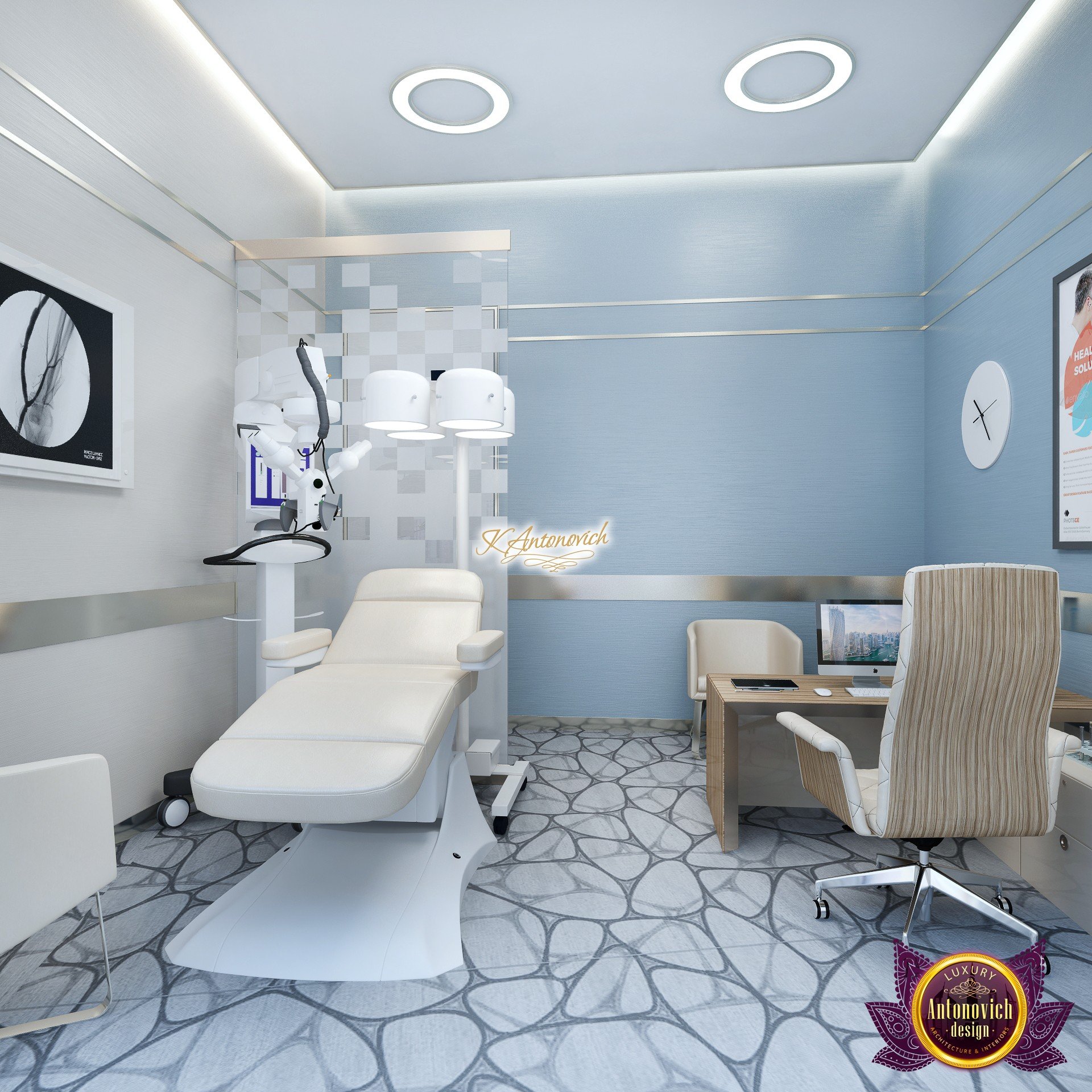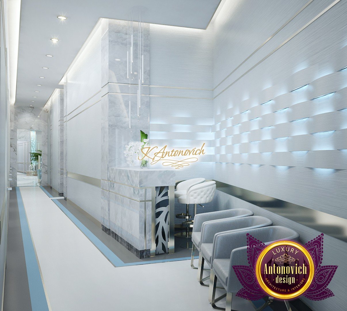 В основе проекта — дизайн частной клиники в современном стиле. Такой подход подчёркивает дизайн клиники и задаёт нужное настроение для процедур. Дизайнеры интерьера студии «Антонович Дизайн (Antonovich Design)» создали образ лёгкого и комфортного пространства, в котором ощущается эстетическое удовольствие. Этот интерьер настраивает каждого посетителя на правильное восприятие пространства и задаёт необходимое настроение для процедур. Концепция проекта имеет уникальные черты. Стены и полы облицованы белым итальянским мрамором, а приемная клиники из итальянского мрамора подчёркивает премиальность проекта. Универсальность отделки стен дополняют объёмные 3d панели для стен клиники с волнистым орнаментом в серебристых тонах, что подчёркивает дизайн интерьера косметологической клиники. С тем же текстурным решением оформлена красивая зона ресепшн. Реализация проекта интерьера клиники под ключ всегда основывается на чёткости в подборе материалов. Просторный холл разделён на несколько зон для отдыха — зонирование пространства в клинике выполнено. Для этого использованы потолочный декор и оригинальные перегородки. В интерьере доминирует светлая палитра холодных оттенков от белого до мягкого голубого, создавая светлый интерьер клиники премиум. Дизайн помещений стал источником абсолютного комфорта как для клиентов клиники, так и для сотрудников — интерьер клиники для комфортных процедур обеспечен продуманной планировкой. Чтобы дополнить атмосферу тёплыми природными нотами, авторы предложили вертикальное озеленение стен клиники. Запрос на уютный интерьер для сотрудников клиники учитывался при планировке. Подбор материалов для дизайна клиники основан на ясном понимании используемых фактур. Дизайн интерьера косметологической клиники от нашей студии — переплетение продуманных дизайнерских идей и инноваций.