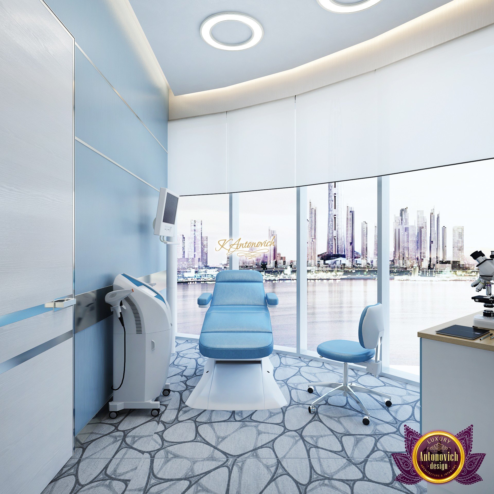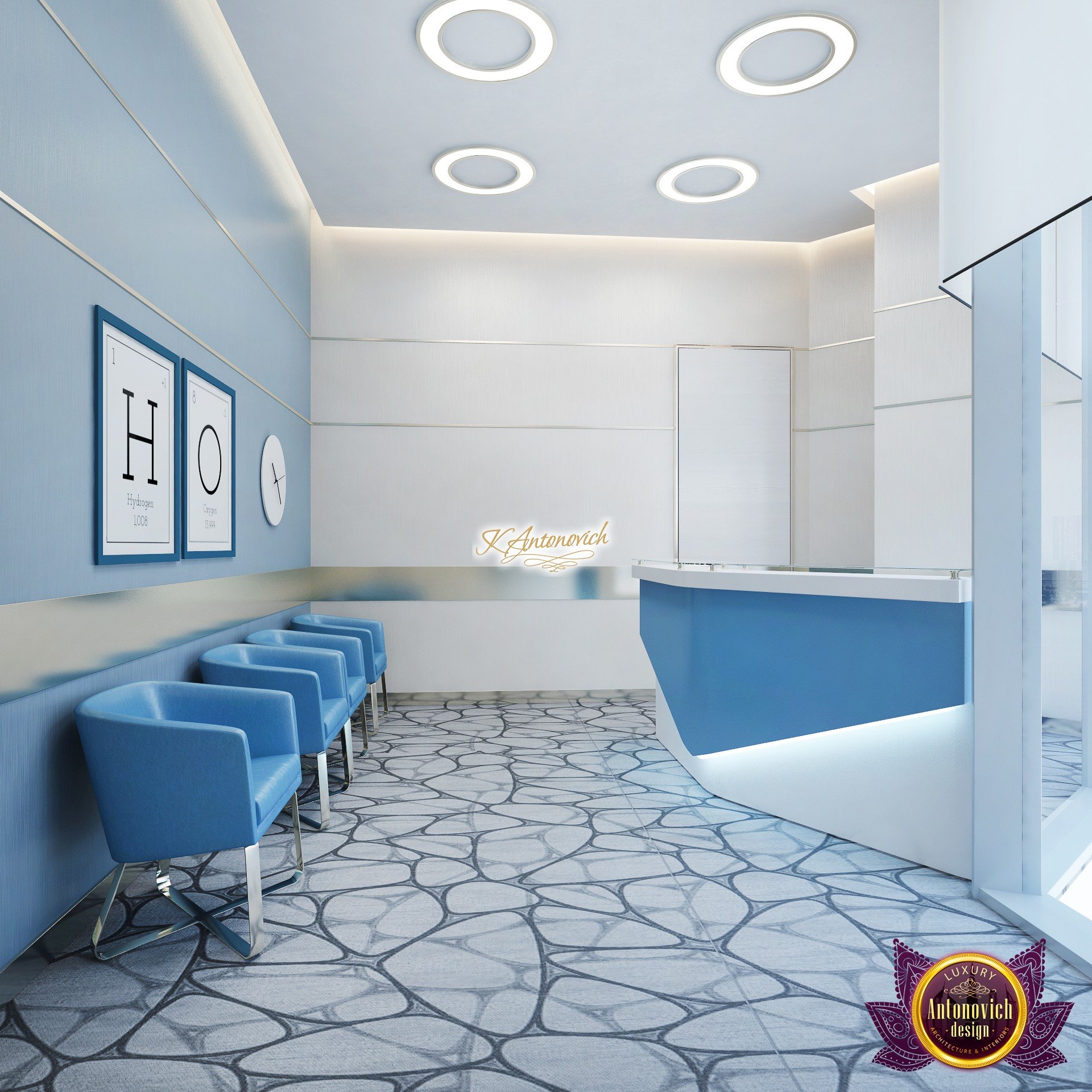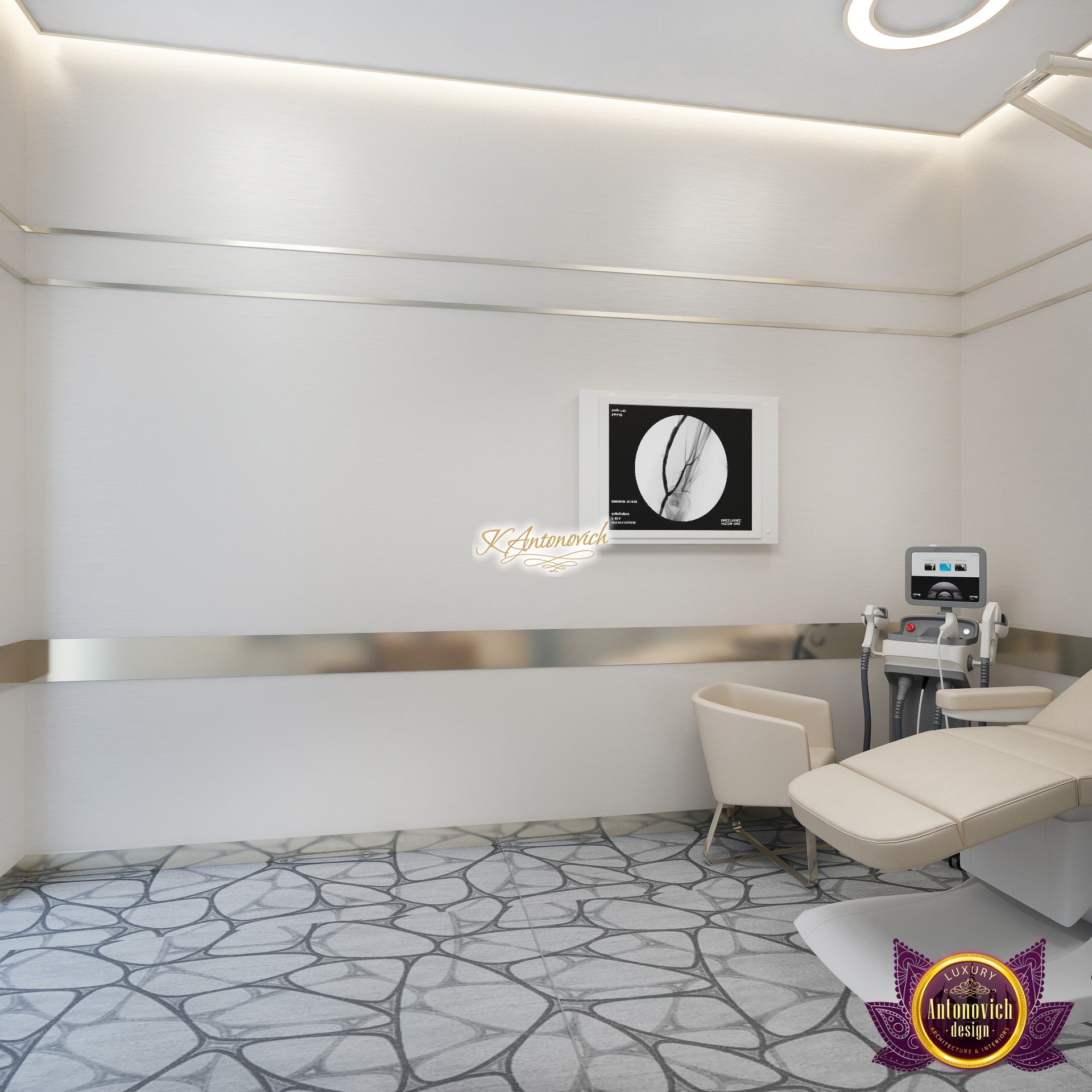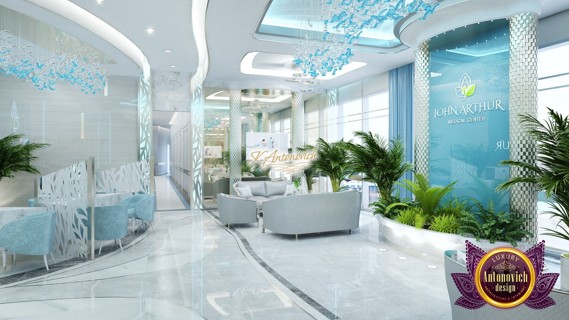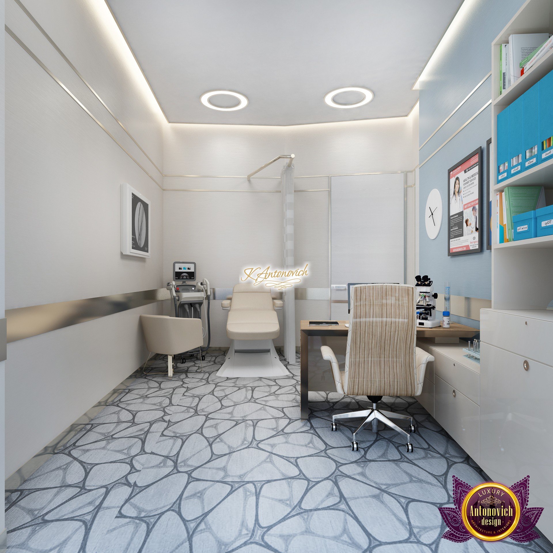 В основе проекта — дизайн частной клиники в современном стиле. Такой подход подчёркивает дизайн клиники и задаёт нужное настроение для процедур. Дизайнеры интерьера студии «Антонович Дизайн (Antonovich Design)» создали образ лёгкого и комфортного пространства, в котором ощущается эстетическое удовольствие. Этот интерьер настраивает каждого посетителя на правильное восприятие пространства и задаёт необходимое настроение для процедур. Концепция проекта имеет уникальные черты. Стены и полы облицованы белым итальянским мрамором, а приемная клиники из итальянского мрамора подчёркивает премиальность проекта. Универсальность отделки стен дополняют объёмные 3d панели для стен клиники с волнистым орнаментом в серебристых тонах, что подчёркивает дизайн интерьера косметологической клиники. С тем же текстурным решением оформлена красивая зона ресепшн. Реализация проекта интерьера клиники под ключ всегда основывается на чёткости в подборе материалов. Просторный холл разделён на несколько зон для отдыха — зонирование пространства в клинике выполнено. Для этого использованы потолочный декор и оригинальные перегородки. В интерьере доминирует светлая палитра холодных оттенков от белого до мягкого голубого, создавая светлый интерьер клиники премиум. Дизайн помещений стал источником абсолютного комфорта как для клиентов клиники, так и для сотрудников — интерьер клиники для комфортных процедур обеспечен продуманной планировкой. Чтобы дополнить атмосферу тёплыми природными нотами, авторы предложили вертикальное озеленение стен клиники. Запрос на уютный интерьер для сотрудников клиники учитывался при планировке. Подбор материалов для дизайна клиники основан на ясном понимании используемых фактур. Дизайн интерьера косметологической клиники от нашей студии — переплетение продуманных дизайнерских идей и инноваций.