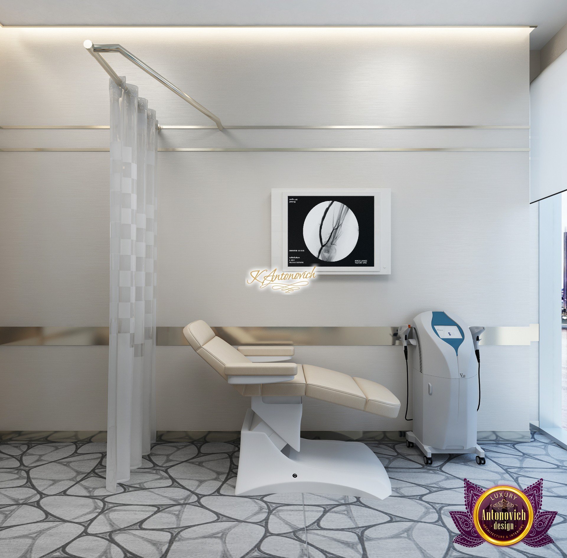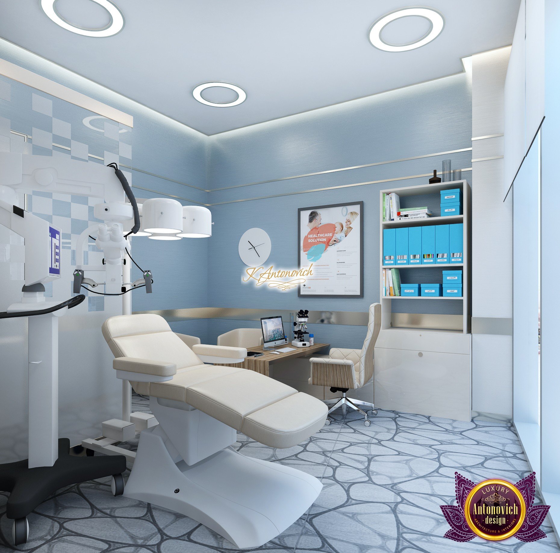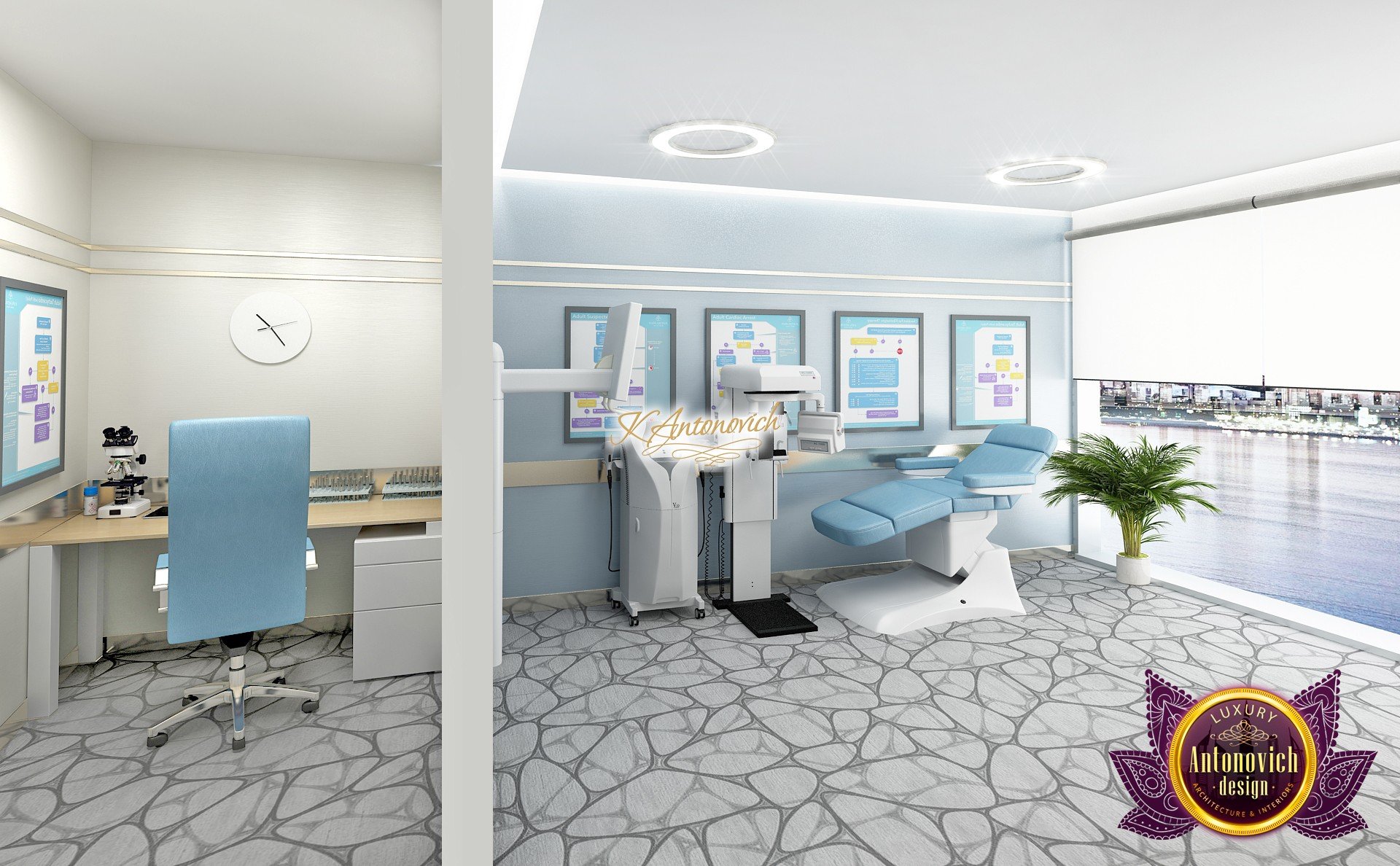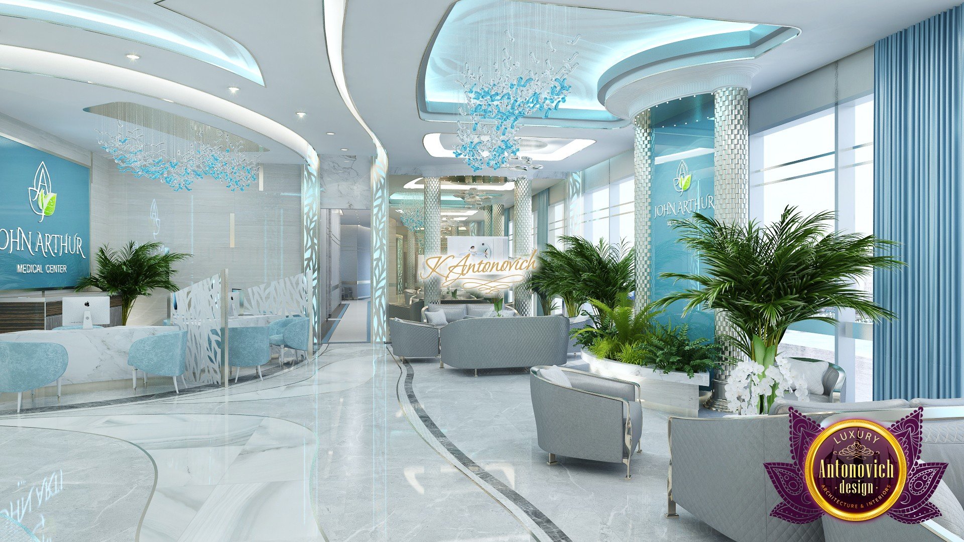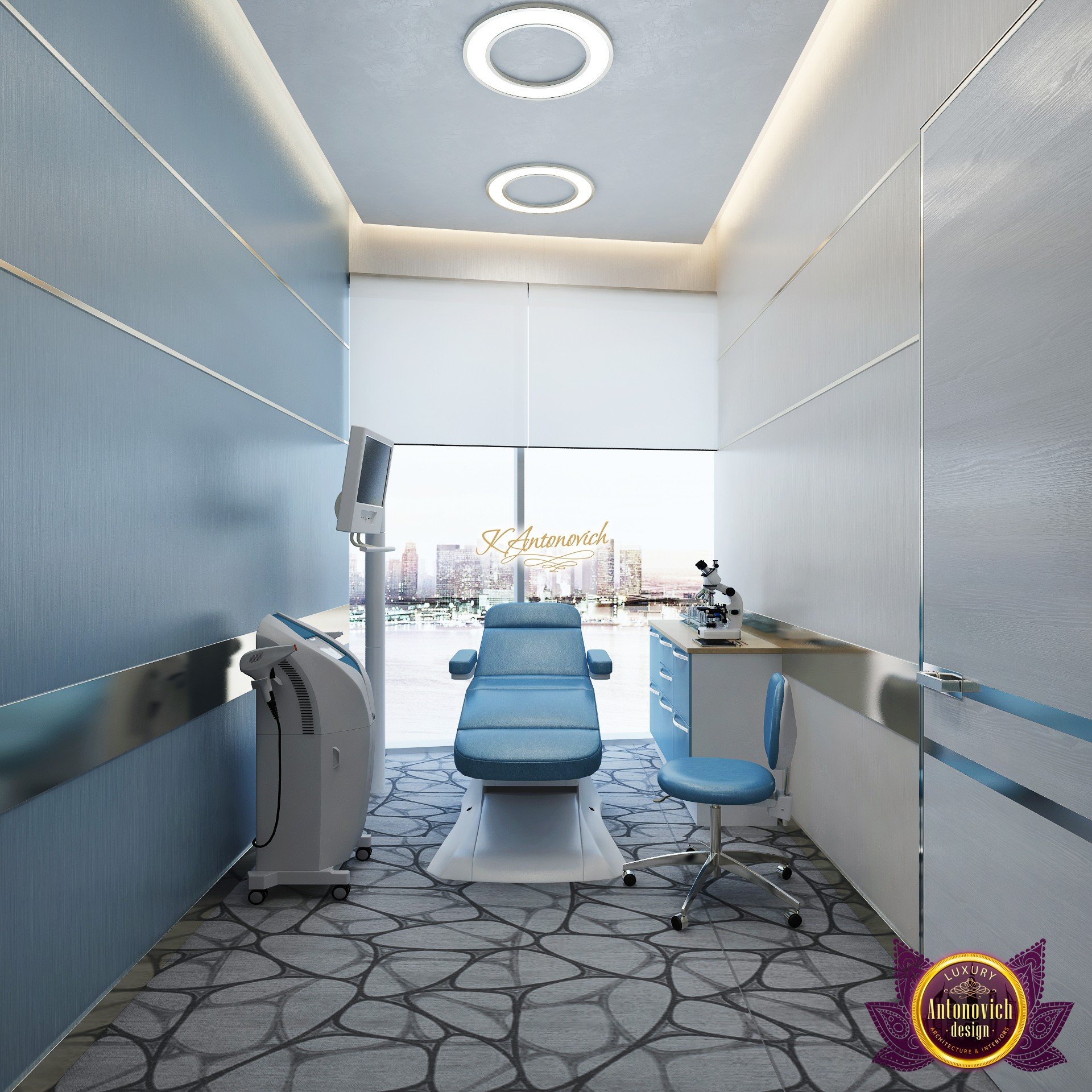 В основе проекта — дизайн частной клиники в современном стиле. Такой подход подчёркивает дизайн клиники и задаёт нужное настроение для процедур. Дизайнеры интерьера студии «Антонович Дизайн (Antonovich Design)» создали образ лёгкого и комфортного пространства, в котором ощущается эстетическое удовольствие. Этот интерьер настраивает каждого посетителя на правильное восприятие пространства и задаёт необходимое настроение для процедур. Концепция проекта имеет уникальные черты. Стены и полы облицованы белым итальянским мрамором, а приемная клиники из итальянского мрамора подчёркивает премиальность проекта. Универсальность отделки стен дополняют объёмные 3d панели для стен клиники с волнистым орнаментом в серебристых тонах, что подчёркивает дизайн интерьера косметологической клиники. С тем же текстурным решением оформлена красивая зона ресепшн. Реализация проекта интерьера клиники под ключ всегда основывается на чёткости в подборе материалов. Просторный холл разделён на несколько зон для отдыха — зонирование пространства в клинике выполнено. Для этого использованы потолочный декор и оригинальные перегородки. В интерьере доминирует светлая палитра холодных оттенков от белого до мягкого голубого, создавая светлый интерьер клиники премиум. Дизайн помещений стал источником абсолютного комфорта как для клиентов клиники, так и для сотрудников — интерьер клиники для комфортных процедур обеспечен продуманной планировкой. Чтобы дополнить атмосферу тёплыми природными нотами, авторы предложили вертикальное озеленение стен клиники. Запрос на уютный интерьер для сотрудников клиники учитывался при планировке. Подбор материалов для дизайна клиники основан на ясном понимании используемых фактур. Дизайн интерьера косметологической клиники от нашей студии — переплетение продуманных дизайнерских идей и инноваций.