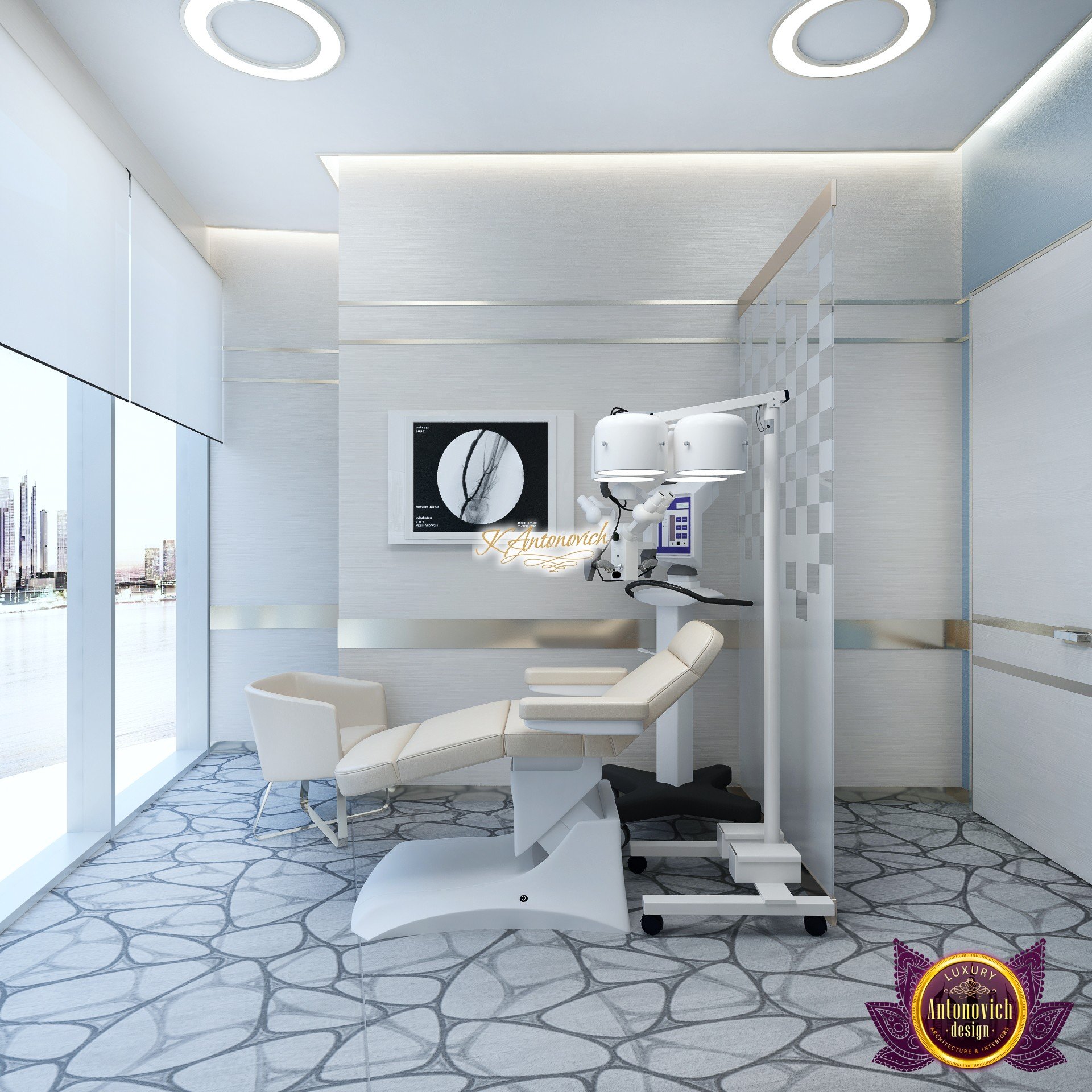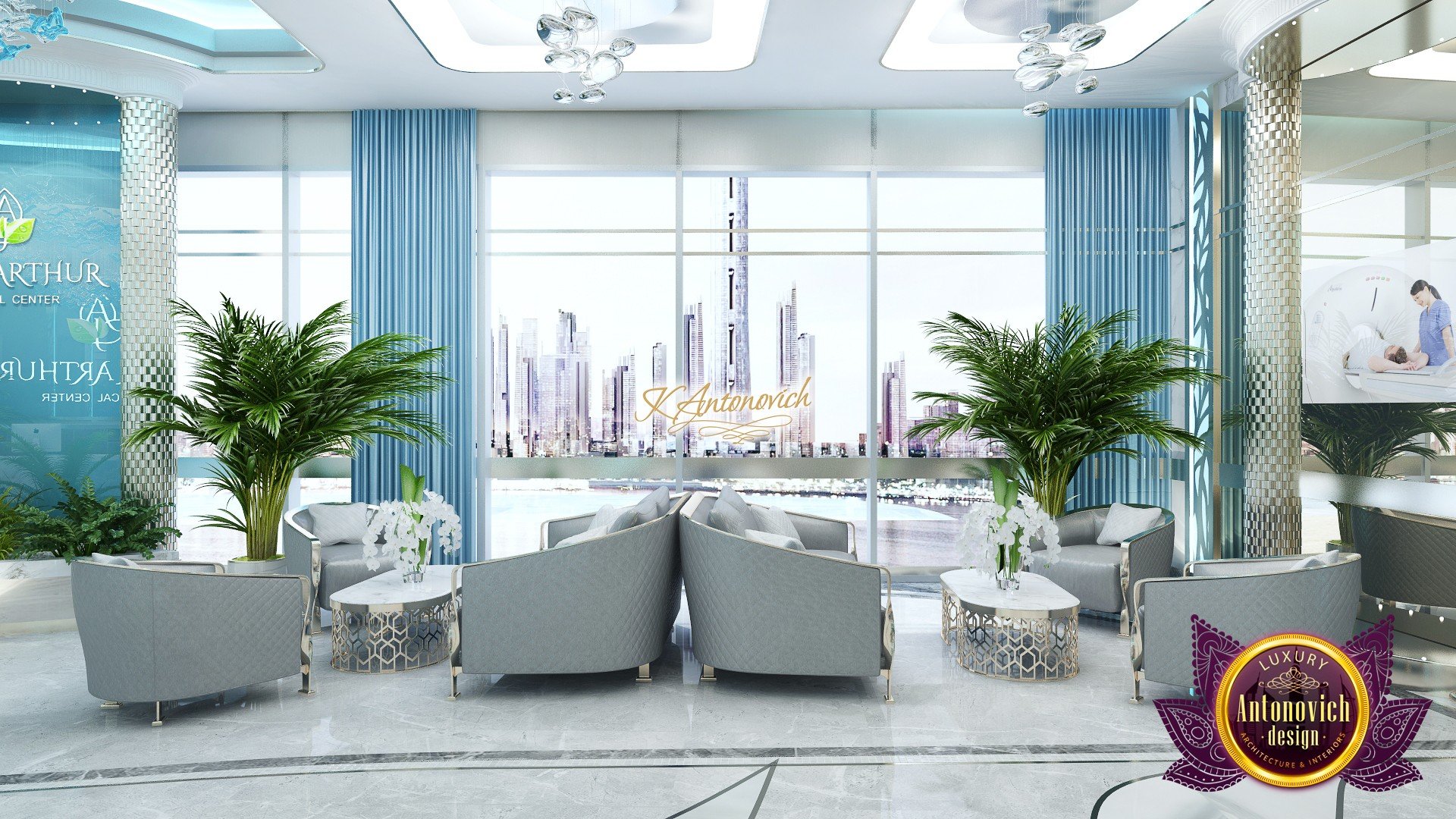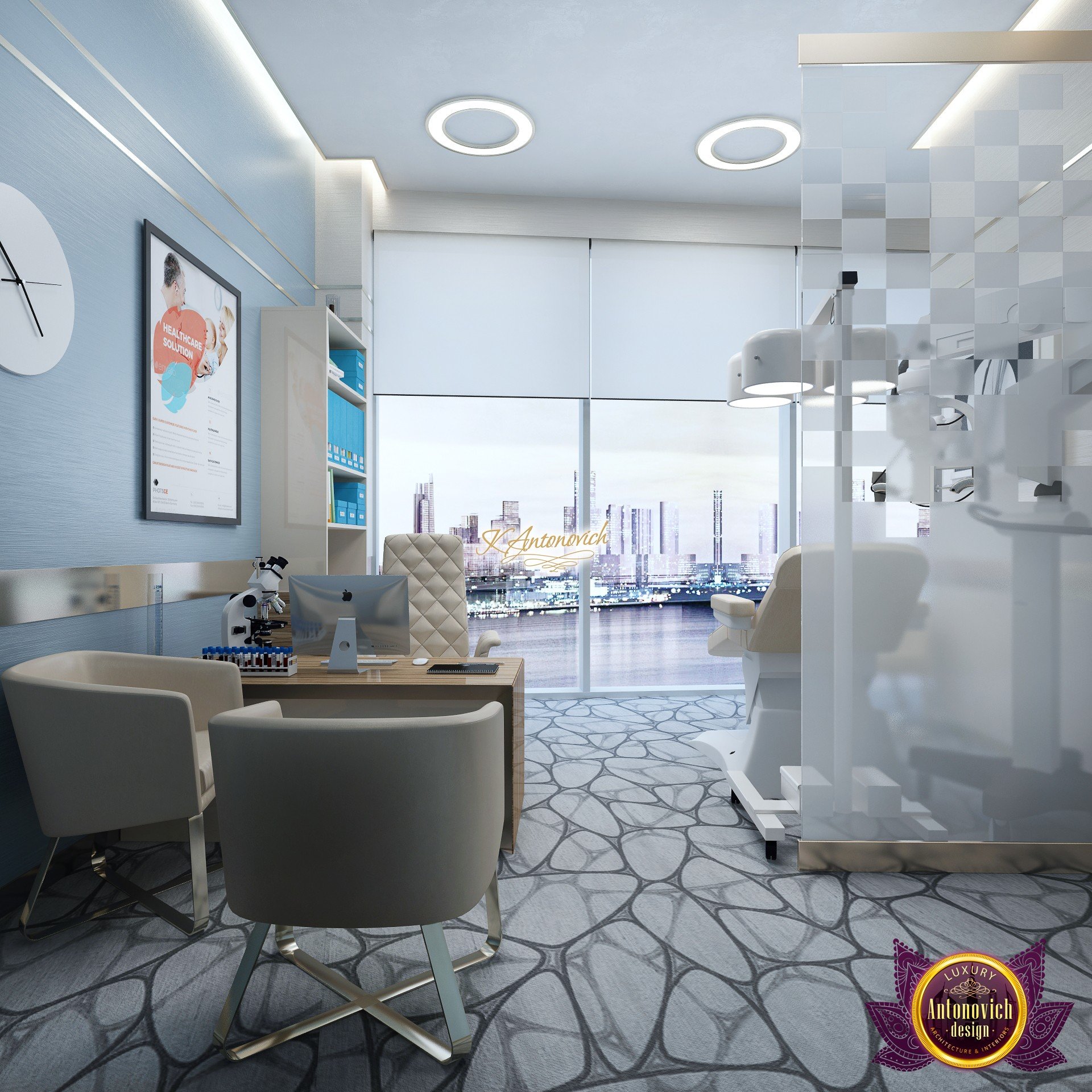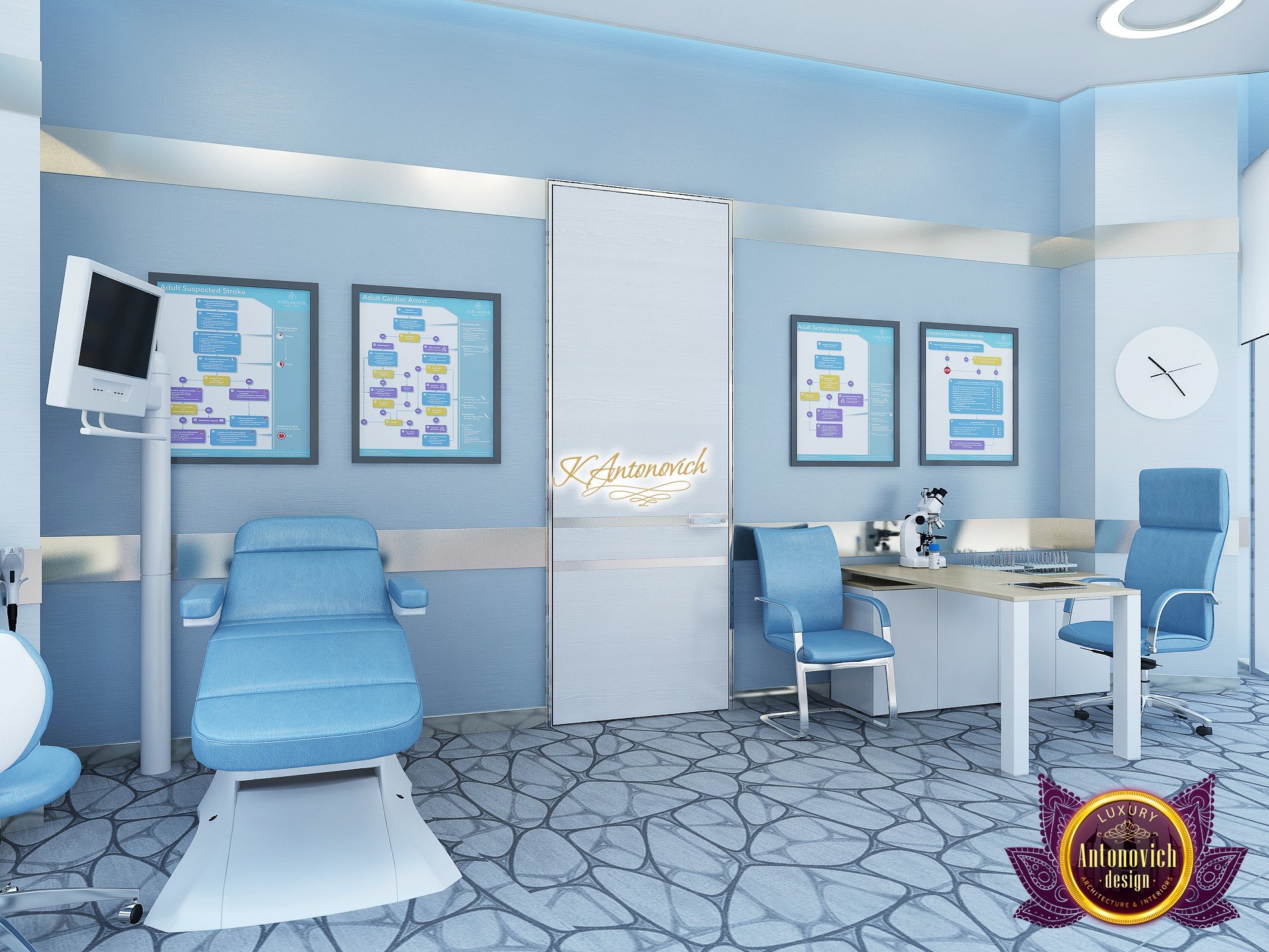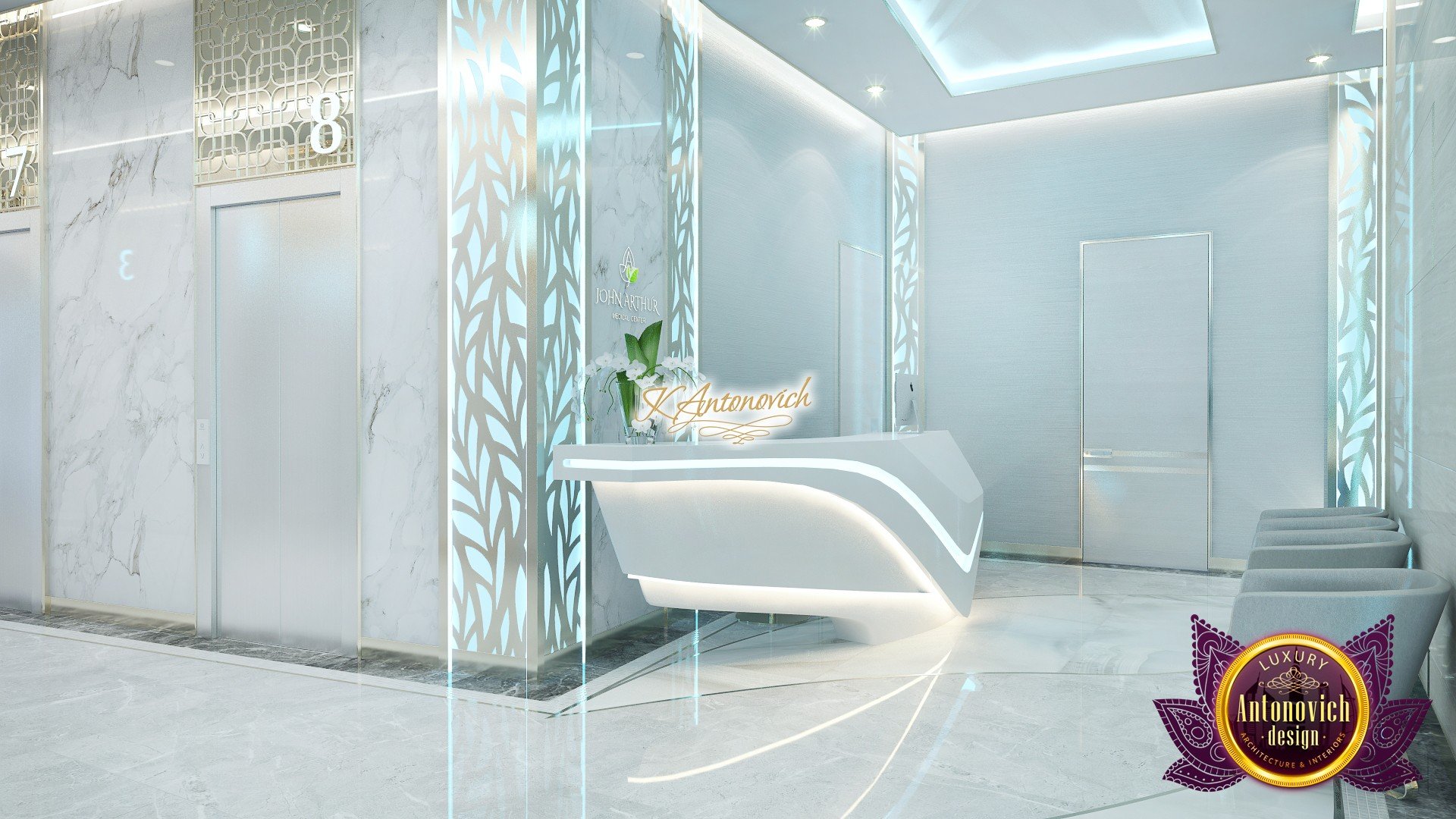 В основе проекта — дизайн частной клиники в современном стиле. Такой подход подчёркивает дизайн клиники и задаёт нужное настроение для процедур. Дизайнеры интерьера студии «Антонович Дизайн (Antonovich Design)» создали образ лёгкого и комфортного пространства, в котором ощущается эстетическое удовольствие. Этот интерьер настраивает каждого посетителя на правильное восприятие пространства и задаёт необходимое настроение для процедур. Концепция проекта имеет уникальные черты. Стены и полы облицованы белым итальянским мрамором, а приемная клиники из итальянского мрамора подчёркивает премиальность проекта. Универсальность отделки стен дополняют объёмные 3d панели для стен клиники с волнистым орнаментом в серебристых тонах, что подчёркивает дизайн интерьера косметологической клиники. С тем же текстурным решением оформлена красивая зона ресепшн. Реализация проекта интерьера клиники под ключ всегда основывается на чёткости в подборе материалов. Просторный холл разделён на несколько зон для отдыха — зонирование пространства в клинике выполнено. Для этого использованы потолочный декор и оригинальные перегородки. В интерьере доминирует светлая палитра холодных оттенков от белого до мягкого голубого, создавая светлый интерьер клиники премиум. Дизайн помещений стал источником абсолютного комфорта как для клиентов клиники, так и для сотрудников — интерьер клиники для комфортных процедур обеспечен продуманной планировкой. Чтобы дополнить атмосферу тёплыми природными нотами, авторы предложили вертикальное озеленение стен клиники. Запрос на уютный интерьер для сотрудников клиники учитывался при планировке. Подбор материалов для дизайна клиники основан на ясном понимании используемых фактур. Дизайн интерьера косметологической клиники от нашей студии — переплетение продуманных дизайнерских идей и инноваций.