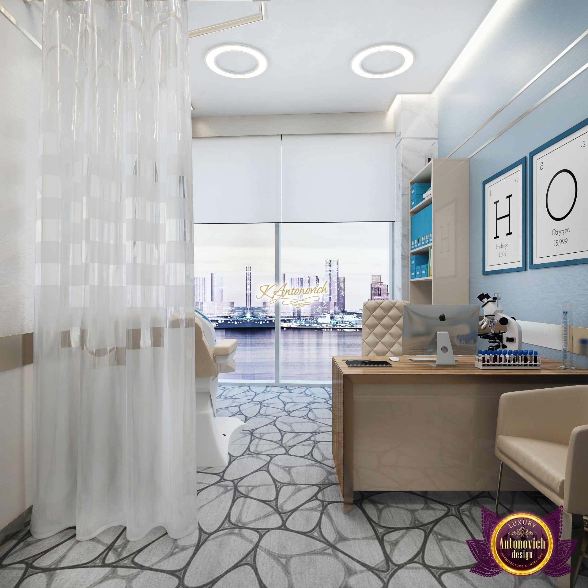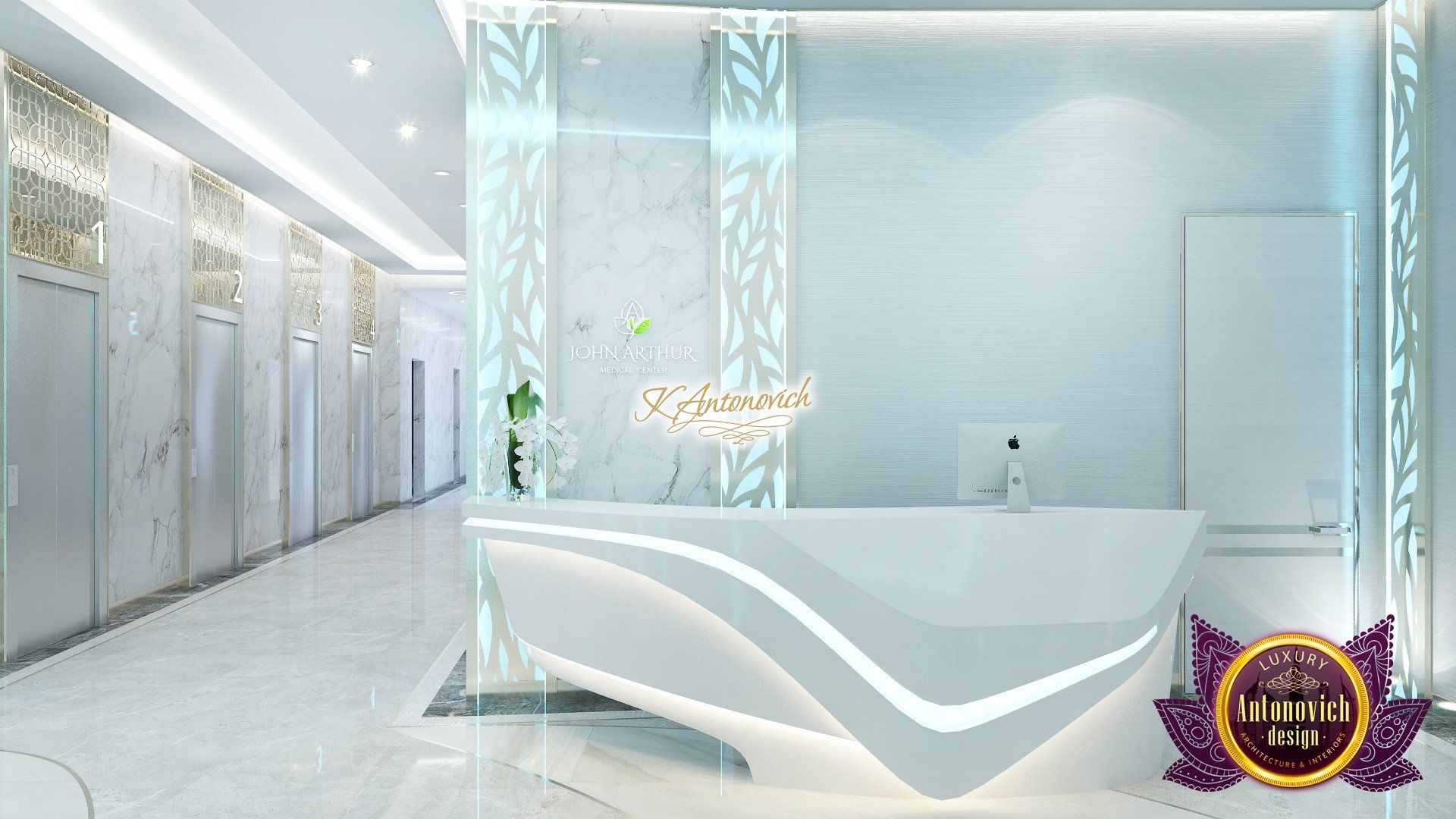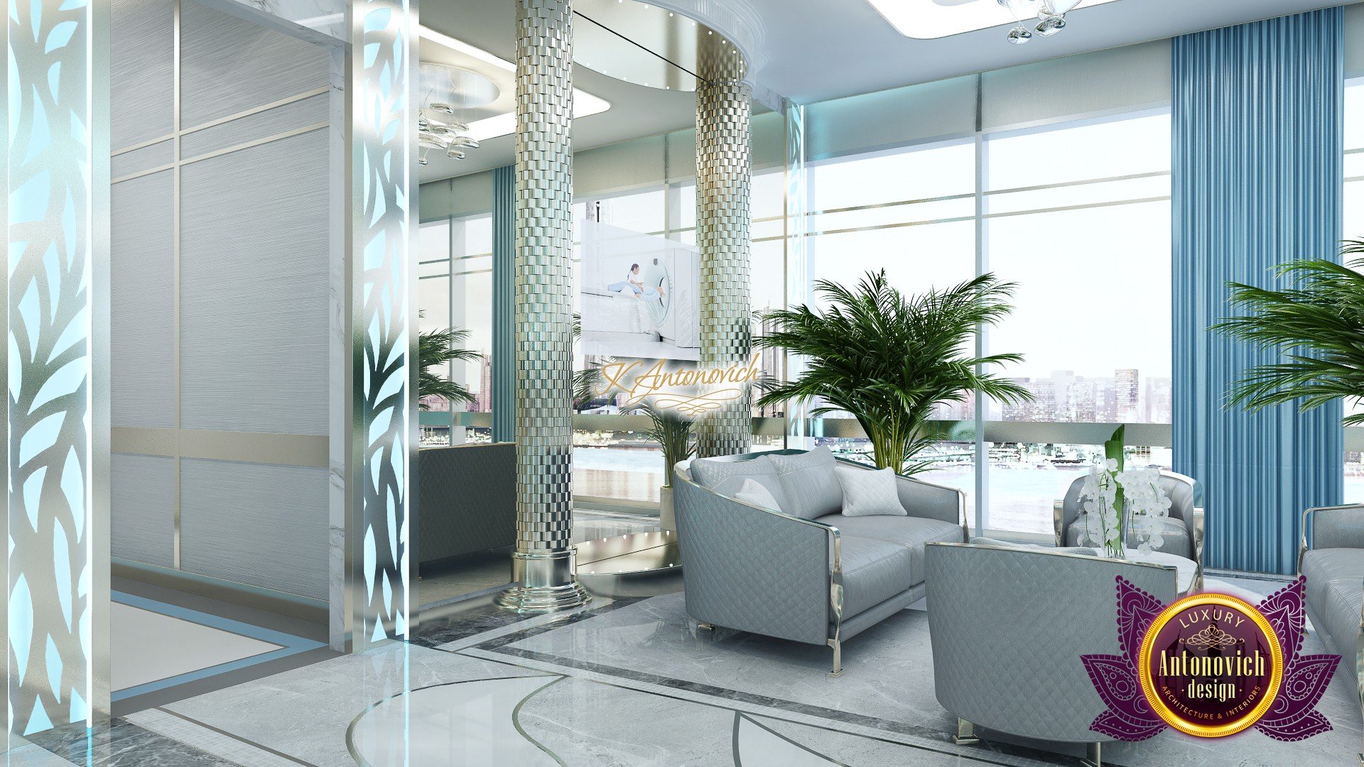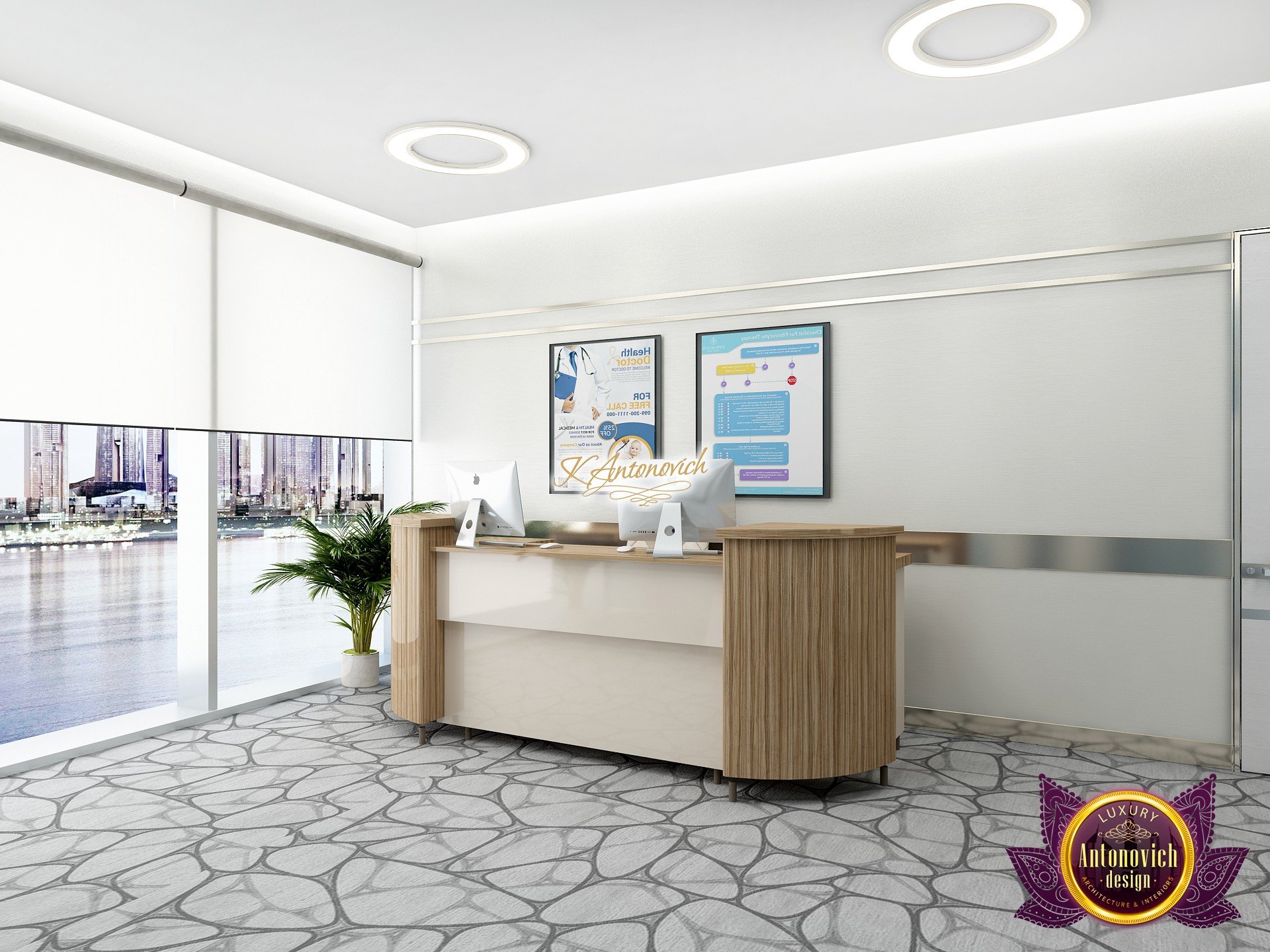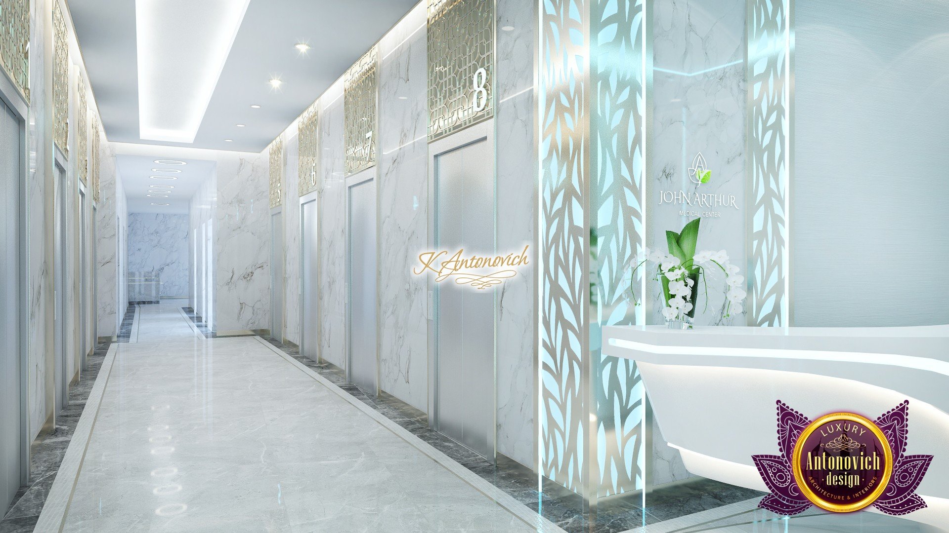 В основе проекта — дизайн частной клиники в современном стиле. Такой подход подчёркивает дизайн клиники и задаёт нужное настроение для процедур. Дизайнеры интерьера студии «Антонович Дизайн (Antonovich Design)» создали образ лёгкого и комфортного пространства, в котором ощущается эстетическое удовольствие. Этот интерьер настраивает каждого посетителя на правильное восприятие пространства и задаёт необходимое настроение для процедур. Концепция проекта имеет уникальные черты. Стены и полы облицованы белым итальянским мрамором, а приемная клиники из итальянского мрамора подчёркивает премиальность проекта. Универсальность отделки стен дополняют объёмные 3d панели для стен клиники с волнистым орнаментом в серебристых тонах, что подчёркивает дизайн интерьера косметологической клиники. С тем же текстурным решением оформлена красивая зона ресепшн. Реализация проекта интерьера клиники под ключ всегда основывается на чёткости в подборе материалов. Просторный холл разделён на несколько зон для отдыха — зонирование пространства в клинике выполнено. Для этого использованы потолочный декор и оригинальные перегородки. В интерьере доминирует светлая палитра холодных оттенков от белого до мягкого голубого, создавая светлый интерьер клиники премиум. Дизайн помещений стал источником абсолютного комфорта как для клиентов клиники, так и для сотрудников — интерьер клиники для комфортных процедур обеспечен продуманной планировкой. Чтобы дополнить атмосферу тёплыми природными нотами, авторы предложили вертикальное озеленение стен клиники. Запрос на уютный интерьер для сотрудников клиники учитывался при планировке. Подбор материалов для дизайна клиники основан на ясном понимании используемых фактур. Дизайн интерьера косметологической клиники от нашей студии — переплетение продуманных дизайнерских идей и инноваций.
